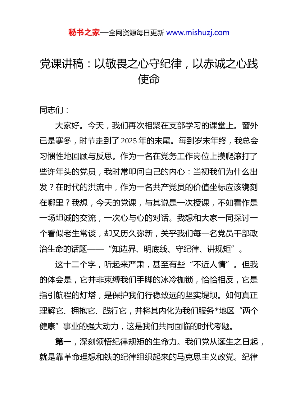 秘书之家—全网资源每日更新 www.mishuzj.com党课讲稿:以敬畏之心守纪律,以赤诚之心践使命 同志们:大家好。今天,我们再次相聚在支部学习的课堂上。窗外已是寒冬,时节走到了 2025 年的末尾。每到岁末年终,我总会习惯性地回顾与反思。作为一名在党务工作岗位上摸爬滚打了些许年头的党员,我时常叩问自己的内心:当初我们为什么出发?在时代的洪流中,作为一名共产党员的价值坐标应该镌刻在哪里?我想,今天的党课,与其说是一次授课,不如看作是一场坦诚的交流,一次心与心的对话。我想和大家一同探讨一个看似老生常谈,却又历久弥新,关乎我们每一名党员干部政治生命的话题——“知边界、明底线、守纪律、讲规矩”。这十二个字,听起来严肃,甚至有些“不近人情”。但我的体会是,它并非束缚我们手脚的冰冷枷锁,恰恰相反,它是指引航程的灯塔,是保护我们行稳致远的坚实堤坝。如何真正理解它、拥抱它、践行它,并将其内化为我们服务*地区“两个健康”事业的强大动力,这是我们共同面临的时代考题。第一,深刻领悟纪律规矩的生命力。我们党从诞生之日起,就是靠革命理想和铁的纪律组织起来的马克思主义政党。纪律秘书之家—全网资源每日更新 www.mishuzj.com规与我们党而言,绝不是可有可无的点缀,而是融入血脉的红色基因。纪律是穿越时空的红色基因。回望百年党史,从井冈山时期“三大纪律八项注意”的颁布,用通俗易懂的语言为初创的人民军队赢得了民心,到延安时期整风运动对思想与作风的锤炼;从新中国成立前夕在西柏坡立下的“六条规矩”,到改革开放后不断扎紧制度的笼子,一部波澜壮阔的党史,就是一部纪律建设史。无数事实证明,什么时候党的纪律严明,我们的事业就无往而不胜;什么时候纪律松弛,我们的事业就会遭受挫折。这种力量,跨越时空,历久弥坚。规矩是砥砺党性的无形熔炉。习近平总书记曾深刻指出,“没有规矩,不成方圆”。纪律是成文的规矩,是刚性的约束。但除了成文的纪律,党在长期实践中形成的优良传统和工作惯例,也是需要我们遵循的重要规矩。这些规矩,或许没有白纸黑字地写在文件里,却体现在一代代共产党人的言传身教中,沉淀在我们的组织文化里。它像一个无形的熔炉,我们身处其中,时时刻刻都在接受着淬炼。守规矩,守的是对党忠诚的大德,守的是清白做人的品行,守的是对权力最起码的敬畏。总书记强调,纪律要“长牙”、要“带电”,这正是要让纪律规矩从“纸上”落到“地上”,成为触碰不得的高压线。边界是保护干部的无声屏障。为什么反复强调要“知边界”?因为边界意识,本质上是秘书之家—全网资源每日更新 www.mishuzj.com一种自我保护意识。现实中,一些同志之所以“出事”,往往不是因为一开始就想腐化堕落,而是从一次“不要紧”、一顿“便饭”、一份“小意思”开始,在“温水煮青蛙”中逐步突破边界,最终滑向深渊,形成了令人痛心的“破窗效应”。纪律和规矩划出的边界,就像是赛车道的护栏,看似限制了你的空间,实则是为了让你在高速驰骋时,不至于偏离赛道、车毁人亡。它提醒我们什么可为,什么不可为,在形形色色的诱惑面前,为我们提供一个清晰明确、不容置疑的“回绝”理由,这难道不是对我们最真切的爱护与保护吗?第二,躬身自省在知行合一中校准航向。理论的价值在于指导实践,而实践的感悟又能深化对理论的理解。结合我个人的一些经历和体会我想分享几点在“守纪律、讲规矩”这条路上的心路历程。第一点感悟,是从“要我守”到“我要守”的转变。坦白说,和许多年轻同志一样,我刚参加工作时,也曾觉得条条框框的纪律规矩是一种约束。但随着工作的深入,特别是从事党务工作以来,我亲眼看到、亲身感受到,纪律规矩对一个组织、一个人的深远影响。我看到有的同志因为始终绷紧纪律这根弦,在关键时刻顶住了压力,稳住了阵脚,事业蒸蒸日上;也看到有的同志因为心存侥幸,在小节上不注意,最终酿成大错,令人扼腕叹息。这些鲜活的案例,让我深刻认识秘书之家—全网资源每日更新 www.mishuzj.com到,遵守纪律规矩,不是组织对我的单方面要求,而是我作为一名党员干部安身立命、成就事业的内在需求。这种转变,是从...