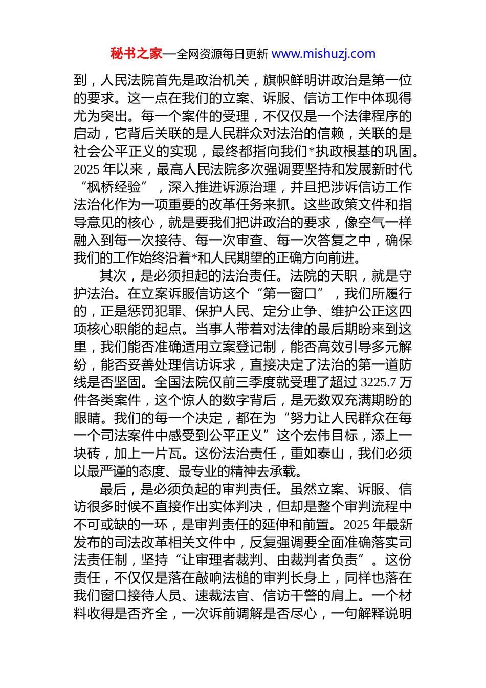 秘书之家—全网资源每日更新 www.mishuzj.com*课讲稿:关于站稳人民立场、忠诚履职担当的几点思考同志们:下午好。今天很高兴,能以一名普通*员的身份,和咱们机关第一*支部的所有同志们坐在一起,参加这次的*员大会。临近岁末,正是回头看、向前望的时候。院*组安排我结合自己的工作和学习,和大家交流一次思想。说实话,比起讲一堂主题鲜明的*课,我更愿意把它看作是一次心与心的沟通,是一次同志间的坦诚分享。所以,今天我不谈过去一年 xx 市中级人民法院取得了多少成绩,那些是大家共同奋斗的结果,数字和报告已经说得很清楚。我想结合咱们立案、诉服、信访这一条线的工作,从一个法律人的内心出发,和大家聊一聊我最近一直在思考的几个问题,一些关于立场、关于责任、关于情怀的个人感悟。这些思考,不一定都对,也不一定都成熟,主要是想起到一个抛砖引玉的作用,希望能够引发大家更深层次的共鸣和探讨。一、一个根本问题——法院的职责与责任我常常在夜深人静的时候问自己,作为一名法官,一名法院的领导干部,我们每天在审判席上、在办公室里、在调解现场忙碌,究竟是为了什么?我们这个被称为“国家审判机关”的地方,到底要履行什么样的职责,担当什么样的责任?这个问题,看似宏大,却无比具体地落实在我们每一天的工作之中。我想,这个责任,可以从三个层面来理解。首先,是必须扛起的政治责任。我们必须清醒地认识秘书之家—全网资源每日更新 www.mishuzj.com到,人民法院首先是政治机关,旗帜鲜明讲政治是第一位的要求。这一点在我们的立案、诉服、信访工作中体现得尤为突出。每一个案件的受理,不仅仅是一个法律程序的启动,它背后关联的是人民群众对法治的信赖,关联的是社会公平正义的实现,最终都指向我们*执政根基的巩固。2025 年以来,最高人民法院多次强调要坚持和发展新时代“枫桥经验”,深入推进诉源治理,并且把涉诉信访工作法治化作为一项重要的改革任务来抓。这些政策文件和指导意见的核心,就是要我们把讲政治的要求,像空气一样融入到每一次接待、每一次审查、每一次答复之中,确保我们的工作始终沿着*和人民期望的正确方向前进。其次,是必须担起的法治责任。法院的天职,就是守护法治。在立案诉服信访这个“第一窗口”,我们所履行的,正是惩罚犯罪、保护人民、定分止争、维护公正这四项核心职能的起点。当事人带着对法律的最后期盼来到这里,我们能否准确适用立案登记制,能否高效引导多元解纷,能否妥善处理信访诉求,直接决定了法治的第一道防线是否坚固。全国法院仅前三季度就受理了超过 3225.7 万件各类案件,这个惊人的数字背后,是无数双充满期盼的眼睛。我们的每一个决定,都在为“努力让人民群众在每一个司法案件中感受到公平正义”这个宏伟目标,添上一块砖,加上一片瓦。这份法治责任,重如泰山,我们必须以最严谨的态度、最专业的精神去承载。最后,是必须负起的审判责任。虽然立案、诉服、信访很多时候不直接作出实体判决,但却是整个审判流程中不可或缺的一环,是审判责任的延伸和前置。2025 年最新发布的司法改革相关文件中,反复强调要全面准确落实司法责任制,坚持“让审理者裁判、由裁判者负责”。这份责任,不仅仅是落在敲响法槌的审判长身上,同样也落在我们窗口接待人员、速裁法官、信访干警的肩上。一个材料收得是否齐全,一次诉前调解是否尽心,一句解释说明秘书之家—全网资源每日更新 www.mishuzj.com是否到位,都可能影响整个案件的走向和最终效果。可以说,审判责任是从当事人踏入法院大门的那一刻起,就由我们共同承担的。理解了这三重责任,我们才能真正明白,自己所从事的工作,其意义远不止于办结一个案子、接待一批群众那么简单。它是一项严肃的政治任务,是一项神圣的法治使命,更是一份沉甸甸的审判职责。二、一个核心关键——如何践行司法为民明确了职责与责任,接下来的问题就是“如何做”。如何才能把“以人民为中心”从一句口号,真正内化为行动自觉?尤其是在立案、诉服、信访这个法院与群众接触最频繁、情感碰撞最激烈的前沿阵地。我想,关键在于修炼好我们的“心、手、脑”。第一,怀揣一颗真心“...