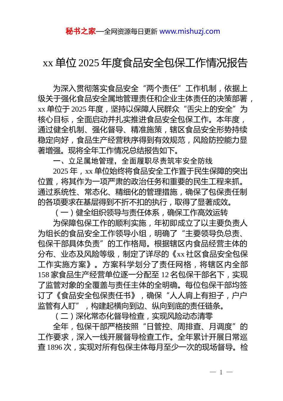 秘书之家—全网资源每日更新 www.mishuzj.comxx 单位 2025 年度食品安全包保工作情况报告为深入贯彻落实食品安全“两个责任”工作机制,依据上级关于强化食品安全属地管理责任和企业主体责任的决策部署,xx 单位于 2025 年度,坚持以保障人民群众“舌尖上的安全”为核心目标,全面启动并扎实推进食品安全包保工作。本年度,通过健全机制、强化督导、精准施策,辖区食品安全形势持续稳定向好,食品生产经营秩序得到有效规范,风险防控能力显著增强。现将全年工作情况总结报告如下。一、立足属地管理,全面履职尽责筑牢安全防线2025 年,xx 单位始终将食品安全工作置于民生保障的突出位置,将其作为一项严肃的政治任务和重要的民生工程来抓。通过系统性、常态化、精细化的管理措施,确保了包保责任制的各项要求在基层得到不折不扣的执行,取得了显著成效。(一)健全组织领导与责任体系,确保工作高效运转为保障包保工作的顺利实施,年初即成立了以主要负责人为组长的食品安全工作领导小组,明确了“主要领导负总责、包保干部具体负责”的工作格局。根据辖区内食品经营主体的分布、业态及风险等级,制定了详尽的《xx 社区食品安全包保工作实施方案》。方案科学划分了责任网格,将辖区内全部158 家食品生产经营单位逐一分配至 12 名包保干部名下,实现了监管对象的全覆盖与责任主体的全明确。每位包保干部均签订了《食品安全包保责任书》,确保“人人肩上有担子,户户监管有人盯”,构建起横向到边、纵向到底的责任链条。(二)深化常态化督导检查,实现风险动态清零全年,包保干部严格按照“日管控、周排查、月调度”的工作要求,深入一线开展督导检查工作。全年累计开展日常巡查 1896 次,实现对所有包保主体每月至少一次的现场督导。检— 1 —秘书之家—全网资源每日更新 www.mishuzj.com查工作聚焦关键环节与高风险点,形成了系统性的督查体系。1.资质与人员管理核查:重点检查经营主体的《营业执照》《食品经营许可证》是否合法有效且在显著位置亮证经营。全年共核查从业人员健康证明 450 余人次,确保所有直接接触食品的人员均持有效健康证明上岗。针对检查中发现的 2 起从业人员健康证过期未及时补办的情况,已责令其立即暂停相关岗位工作,并限期完成体检换证,现已全部整改到位。2.环境卫生与设施设备检查:将后厨环境卫生作为检查的重中之重。督导内容涵盖操作间、储藏室、用餐区的地面、墙壁、天花板是否清洁无污垢,防蝇、防鼠、防尘设施是否齐全有效。针对餐饮行业,重点查看了食品加工操作台的生熟分离、餐具的清洗消毒保洁以及冰箱冰柜的温度控制情况。全年共对95 家餐饮单位的操作间卫生进行了超过 500 次检查,发现并督促整改了环境卫生不达标、垃圾处理不及时等问题 28 项。3.采购、储存与加工过程监管:严格监督经营主体落实进货查验和索证索票制度。检查中重点核对食品原料的采购台账、供应商资质及产品合格证明文件,严防来源不明、过期变质的食品流入市场。全年累计抽查各类食品原料及成品 300 余批次,重点关注食品的生产日期、保质期及储存条件。发现并现场指导纠正了 3 起生熟食品混放导致的交叉污染风险,以及 5 起食品原料储存不当的问题。4.专项整治与重点领域防控:结合季节性特点与节假日消费高峰,组织开展了多次专项检查行动。例如,在夏季高温期间,针对冷链食品、凉菜、自制饮品等高风险品种开展了专项排查,确保温度控制措施到位。在重大节假日期间,重点检查了大型聚餐单位的食品留样制度执行情况,确保可追溯。通过这些专项行动,有效预防了群体性食品安全事件的发生。(三)强化宣传教育与社会共治,营造良好安全氛围坚持监管与服务并重,将普法宣传和知识普及贯穿于包保— 2 —秘书之家—全网资源每日更新 www.mishuzj.com工作的全过程。包保干部在每次巡查中,都化身为食品安全宣传员,向经营者和从业人员讲解《食品安全法》等法律法规,科普食品储存、加工、清洁消毒等方面的专业知识。全年共计发放食品安全宣传手册 800 余份,现场开展“一对一”指导培训超过 300 次。同时,积极畅通社会监督渠道...