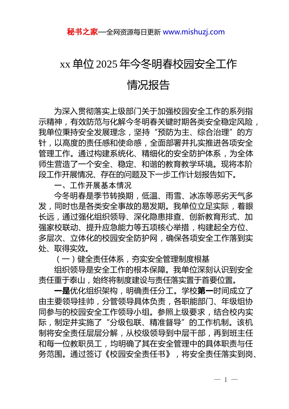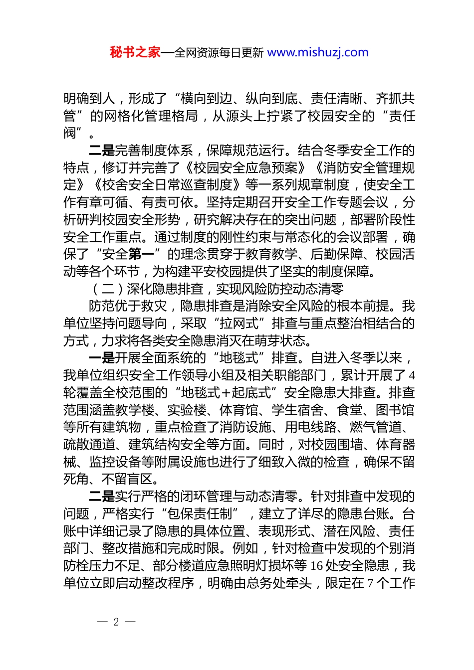 秘书之家—全网资源每日更新 www.mishuzj.comxx 单位 2025 年今冬明春校园安全工作情况报告为深入贯彻落实上级部门关于加强校园安全工作的系列指示精神,有效防范与化解今冬明春关键时期各类安全稳定风险,我单位秉持安全发展理念,坚持“预防为主、综合治理”的方针,以高度的责任感和使命感,全面部署并扎实推进各项安全管理工作。通过构建系统化、精细化的安全防护体系,为全体师生营造了一个安全、稳定、和谐的教育教学环境。现将本阶段工作开展情况、存在的问题及下一步工作计划报告如下。一、工作开展基本情况今冬明春是季节转换期,低温、雨雪、冰冻等恶劣天气多发,同时也是各类安全事故的易发期。我单位立足实际,着眼长远,通过强化组织领导、深化隐患排查、创新教育形式、加强家校联动、提升应急能力等五项核心举措,构建起全方位、多层次、立体化的校园安全防护网,确保各项安全工作落到实处、取得实效。(一)健全责任体系,夯实安全管理制度根基组织领导是安全工作的根本保障。我单位深刻认识到安全责任重于泰山,始终将制度建设与责任落实置于首要位置。一是优化组织架构,明确责任分工。学校第一时间成立了由主要领导挂帅,分管领导具体负责,各职能部门、年级组协同参与的校园安全工作领导小组。参照上级要求,结合校内实际,制定并实施了“分级包联、精准督导”的工作机制。该机制将安全责任层层分解,从校级领导到中层干部,再到班主任和每一位教职员工,均明确了其在安全管理中的具体职责与任务范围。通过签订《校园安全责任书》,将安全责任落实到岗、— 1 —秘书之家—全网资源每日更新 www.mishuzj.com明确到人,形成了“横向到边、纵向到底、责任清晰、齐抓共管”的网格化管理格局,从源头上拧紧了校园安全的“责任阀”。二是完善制度体系,保障规范运行。结合冬季安全工作的特点,修订并完善了《校园安全应急预案》《消防安全管理规定》《校舍安全日常巡查制度》等一系列规章制度,使安全工作有章可循、有责可依。坚持定期召开安全工作专题会议,分析研判校园安全形势,研究解决存在的突出问题,部署阶段性安全工作重点。通过制度的刚性约束与常态化的会议部署,确保了“安全第一”的理念贯穿于教育教学、后勤保障、校园活动等各个环节,为构建平安校园提供了坚实的制度保障。(二)深化隐患排查,实现风险防控动态清零防范优于救灾,隐患排查是消除安全风险的根本前提。我单位坚持问题导向,采取“拉网式”排查与重点整治相结合的方式,力求将各类安全隐患消灭在萌芽状态。一是开展全面系统的“地毯式”排查。自进入冬季以来,我单位组织安全工作领导小组及相关职能部门,累计开展了 4轮覆盖全校范围的“地毯式+起底式”安全隐患大排查。排查范围涵盖教学楼、实验楼、体育馆、学生宿舍、食堂、图书馆等所有建筑物,重点检查了消防设施、用电线路、燃气管道、疏散通道、建筑结构安全等方面。同时,对校园围墙、体育器械、监控设备等附属设施也进行了细致入微的检查,确保不留死角、不留盲区。二是实行严格的闭环管理与动态清零。针对排查中发现的问题,严格实行“包保责任制”,建立了详尽的隐患台账。台账中详细记录了隐患的具体位置、表现形式、潜在风险、责任部门、整改措施和完成时限。例如,针对检查中发现的个别消防栓压力不足、部分楼道应急照明灯损坏等 16 处安全隐患,我单位立即启动整改程序,明确由总务处牵头,限定在 7 个工作— 2 —秘书之家—全网资源每日更新 www.mishuzj.com日内完成修复与更换,并由安全办公室进行复核验收。截至目前,本轮排查出的 16 处隐患已全部完成整改,整改率达到100%。通过建立“发现—登记—整改—复查—销号”的闭环管理流程,确保了所有安全隐患得到及时、彻底的根除,牢牢守住了校园安全的“底线”。(三)创新宣教模式,提升师生安全防范素养安全教育是提升师生自我防护能力、筑牢思想防线的核心环节。我单位摒弃了传统的说教模式,采用多元化、场景化的教育方式,推动安全知识入脑入心。一是常态化开展“1530”安全教育。即每天利用晨会、课间等碎片化时间进行 1 分钟安全提醒,每周...