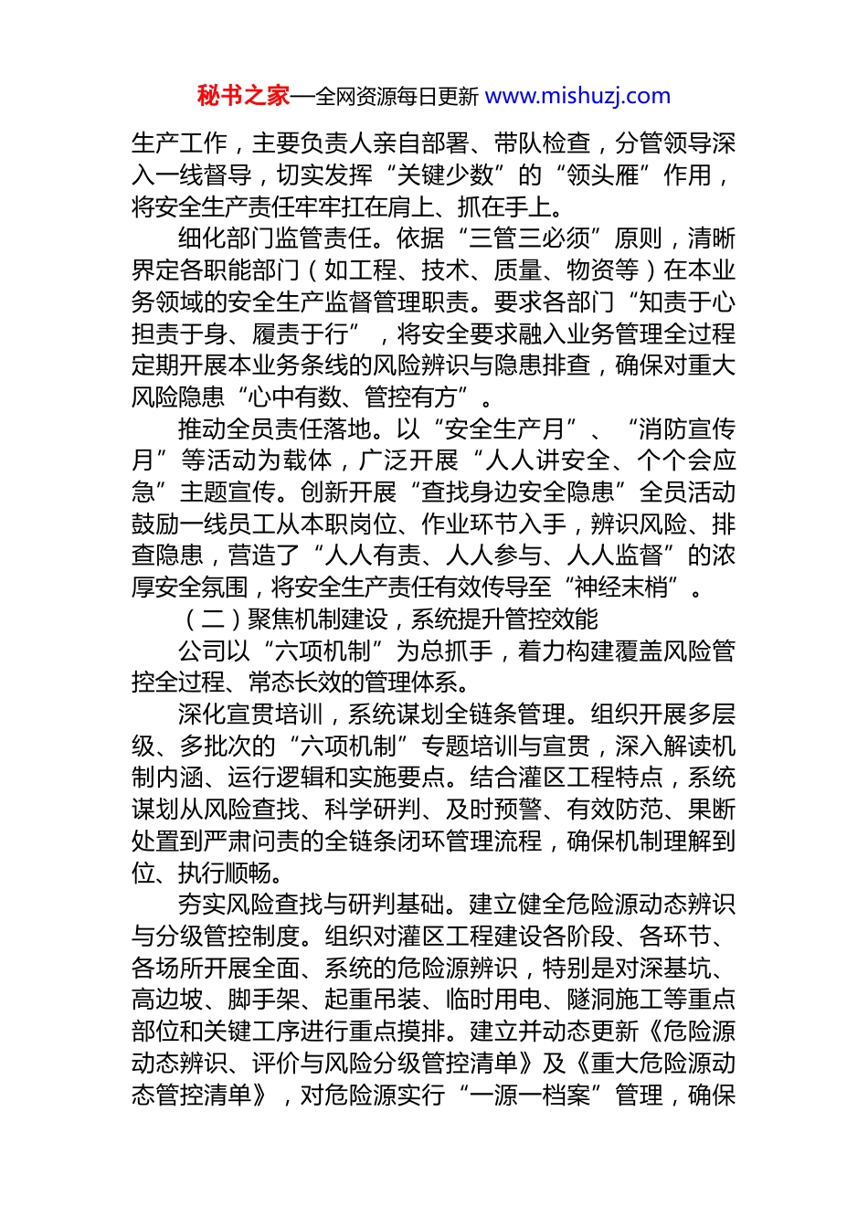 秘书之家—全网资源每日更新 www.mishuzj.comxx 灌区公司关于水利安全生产风险管控“六项机制”建设任务完成情况的工作总结2025 年是“十四五”规划收官之年,也是水利安全生产风险管控“六项机制”落地见效的关键之年。为深入贯彻落实******关于安全生产的重要论述和指示批示精神,严格执行*中央、国务院以及水利部、省委省政府关于安全生产工作的系列决策部署,xx 灌区公司始终坚持以人民为中心的发展思想,牢固树立安全发展理念,以“时时放心不下”的责任感,紧紧围绕水利安全生产风险管控“六项机制”(即风险查找、研判、预警、防范、处置、责任机制)建设要求,紧密结合灌区工程建设实际,系统谋划、精准施策、狠抓落实,全力筑牢灌区建设安全屏障。现将“六项机制”建设任务完成情况总结如下:一、主要工作情况与成效公司以构建“*政同责、一岗双责、齐抓共管、失职追责”和“三管三必须”的安全生产责任体系为牵引,以推动“六项机制”全链条闭环管理为核心,以提升本质安全水平为目标,扎实开展了一系列富有成效的工作。(一)健全责任体系,层层压实安全根基公司深刻认识到责任制是安全生产的灵魂,将压实责任作为推动“六项机制”落地的前提和保障。强化领导责任落实。坚决落实“*政同责、一岗双责”要求,修订完善《全员安全生产责任制》及《安全生产责任清单(2.0 版)》,明确公司领导班子成员及各层级负责人的安全生产具体职责。通过*委会、安委会定期研究安全秘书之家—全网资源每日更新 www.mishuzj.com生产工作,主要负责人亲自部署、带队检查,分管领导深入一线督导,切实发挥“关键少数”的“领头雁”作用,将安全生产责任牢牢扛在肩上、抓在手上。细化部门监管责任。依据“三管三必须”原则,清晰界定各职能部门(如工程、技术、质量、物资等)在本业务领域的安全生产监督管理职责。要求各部门“知责于心担责于身、履责于行”,将安全要求融入业务管理全过程定期开展本业务条线的风险辨识与隐患排查,确保对重大风险隐患“心中有数、管控有方”。推动全员责任落地。以“安全生产月”、“消防宣传月”等活动为载体,广泛开展“人人讲安全、个个会应急”主题宣传。创新开展“查找身边安全隐患”全员活动鼓励一线员工从本职岗位、作业环节入手,辨识风险、排查隐患,营造了“人人有责、人人参与、人人监督”的浓厚安全氛围,将安全生产责任有效传导至“神经末梢”。(二)聚焦机制建设,系统提升管控效能公司以“六项机制”为总抓手,着力构建覆盖风险管控全过程、常态长效的管理体系。深化宣贯培训,系统谋划全链条管理。组织开展多层级、多批次的“六项机制”专题培训与宣贯,深入解读机制内涵、运行逻辑和实施要点。结合灌区工程特点,系统谋划从风险查找、科学研判、及时预警、有效防范、果断处置到严肃问责的全链条闭环管理流程,确保机制理解到位、执行顺畅。夯实风险查找与研判基础。建立健全危险源动态辨识与分级管控制度。组织对灌区工程建设各阶段、各环节、各场所开展全面、系统的危险源辨识,特别是对深基坑、高边坡、脚手架、起重吊装、临时用电、隧洞施工等重点部位和关键工序进行重点摸排。建立并动态更新《危险源动态辨识、评价与风险分级管控清单》及《重大危险源动态管控清单》,对危险源实行“一源一档案”管理,确保秘书之家—全网资源每日更新 www.mishuzj.com管控措施可追溯。推广应用风险“四色图”(红、橙、黄蓝)、风险公告栏、重大风险警示牌、岗位风险告知卡等可视化手段,在施工现场醒目位置公示风险信息,提升全员风险意识。强化监测预警与防范能力。加大安全投入,在关键工程部位、重要施工环节安装永久性或临时性安全监测设施(如变形监测、渗流监测、视频监控等),实现对工程安全状态的实时监控和数据分析。建立预警信息发布制度,根据监测数据、隐患排查统计、气象预报等,及时发布关键工序风险突增预警、月度事故隐患分析预警、极端天气预警等信息。全年累计发布各类预警 xx 次,均得到及时响应和有效防范。完善隐患排查治理双重预防机制。坚持问题导向,将隐患排查治理作为防范事故的关键环节。常态化开展日常巡...