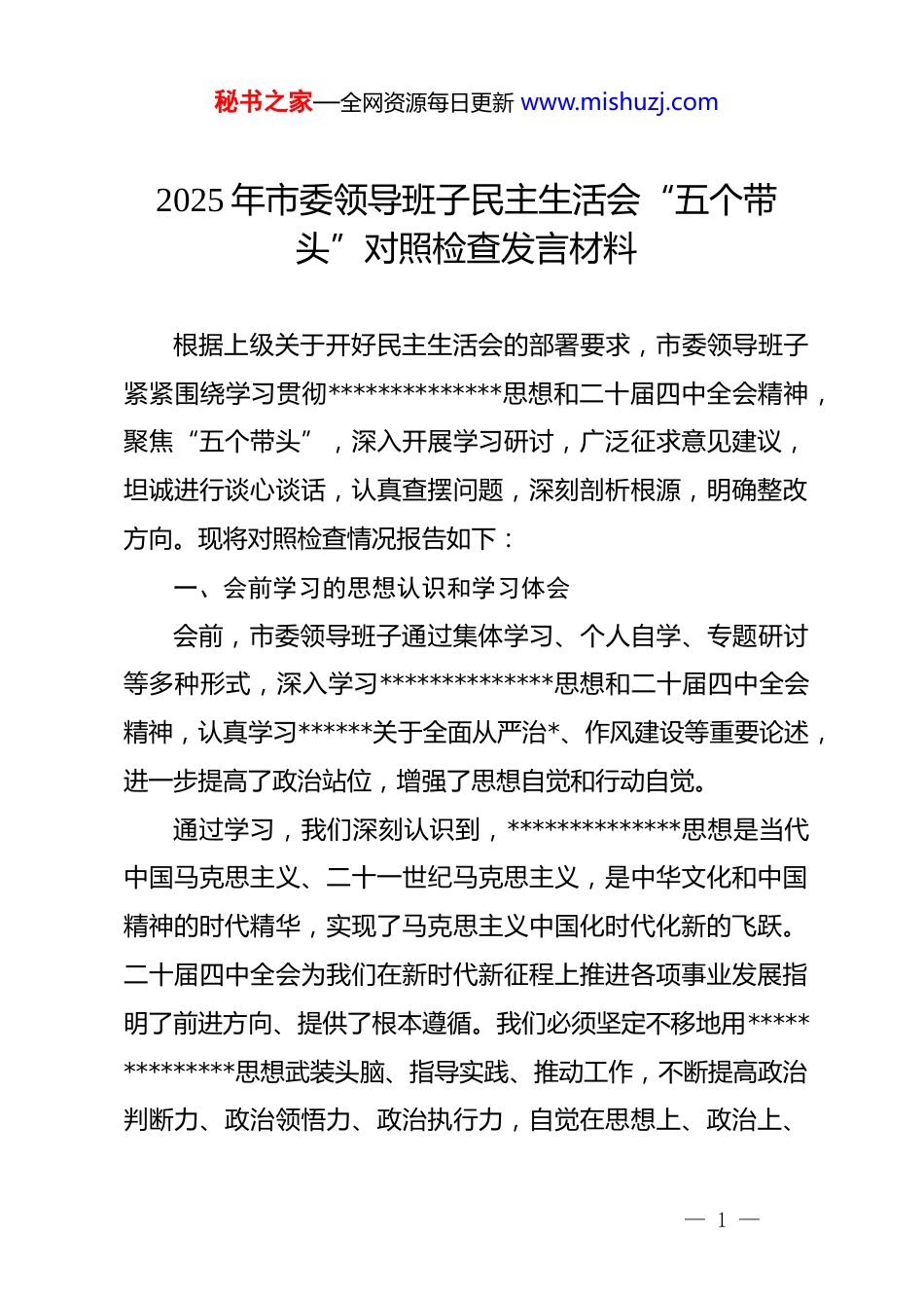 秘书之家—全网资源每日更新 www.mishuzj.com2025 年市委领导班子民主生活会“五个带头”对照检查发言材料根据上级关于开好民主生活会的部署要求,市委领导班子紧紧围绕学习贯彻**************思想和二十届四中全会精神,聚焦“五个带头”,深入开展学习研讨,广泛征求意见建议,坦诚进行谈心谈话,认真查摆问题,深刻剖析根源,明确整改方向。现将对照检查情况报告如下:一、会前学习的思想认识和学习体会会前,市委领导班子通过集体学习、个人自学、专题研讨等多种形式,深入学习**************思想和二十届四中全会精神,认真学习******关于全面从严治*、作风建设等重要论述,进一步提高了政治站位,增强了思想自觉和行动自觉。通过学习,我们深刻认识到,**************思想是当代中国马克思主义、二十一世纪马克思主义,是中华文化和中国精神的时代精华,实现了马克思主义中国化时代化新的飞跃。二十届四中全会为我们在新时代新征程上推进各项事业发展指明了前进方向、提供了根本遵循。我们必须坚定不移地用**************思想武装头脑、指导实践、推动工作,不断提高政治判断力、政治领悟力、政治执行力,自觉在思想上、政治上、— 1 —秘书之家—全网资源每日更新 www.mishuzj.com行动上同以***同志为核心的*中央保持高度一致。同时,我们也深刻认识到,全面从严治*永远在路上,*的自我革命永远在路上。我们必须时刻保持清醒头脑,坚定不移推进*风廉政建设和反腐败斗争,持之以恒落实中央八项规定精神,深化作风建设,不断增强*的创造力、凝聚力、战斗力,确保*始终成为中国特色社会主义事业的坚强领导核心。二、存在问题(一)带头强化政治忠诚、提高政治能力方面一是政治理论学习的深度和广度不够。虽然市委领导班子能够坚持定期开展政治理论学习,但在学习的系统性、深入性上还有待加强。对**************思想和二十届四中全会精神的学习,存在一知半解、浅尝辄止的情况,没有真正做到学深悟透、融会贯通。在运用*的创新理论指导实践、推动工作方面,还存在一定的差距。二是政治敏锐性和政治鉴别力有待提高。在面对一些复杂的社会现象和舆论热点时,有时不能从政治的高度敏锐地洞察问题的本质,对一些错误思潮和言论缺乏及时有效的批判和斗争。在贯彻落实*中央决策部署时,有时存在理解不深刻、执行不到位的情况,没有完全做到不打折扣、不搞变通。三是政治能力建设还需进一步加强。在处理一些重大问题— 2 —秘书之家—全网资源每日更新 www.mishuzj.com和突发事件时,有时缺乏政治担当和政治智慧,不能迅速、有效地采取措施加以应对。在领导经济社会发展过程中,还存在统筹协调能力不足、驾驭复杂局面能力不强的问题,需要不断提高政治能力和领导水平。(二)带头固本培元、增强*性方面一是*性修养不够自觉。部分班子成员在日常工作中,有时会放松对自己的要求,缺乏严格的*性锻炼。在面对个人利益和集体利益、局部利益和全局利益的冲突时,有时不能做到大公无私、公而忘私,存在一定的本位主义思想。二是*内政治生活不够严肃。虽然市委领导班子能够严格落实*内政治生活制度,但在实际执行过程中,还存在一些形式主义的问题。例如,民主生活会和组织生活会有时存在批评与自我批评不够深刻、不够到位的情况,没有真正达到红脸出汗、排毒治病的效果。三是理想信念不够坚定。个别班子成员在面对复杂的社会环境和各种诱惑时,理想信念出现了动摇。对马克思主义信仰、中国特色社会主义信念的坚定性不够,缺乏为实现共产主义远大理想和中国特色社会主义共同理想而奋斗的精神动力。(三)带头敬畏人民、敬畏组织、敬畏法纪方面一是宗旨意识有所淡化。部分班子成员在工作中,有时会— 3 —秘书之家—全网资源每日更新 www.mishuzj.com忽视群众的利益和需求,没有真正做到想群众之所想、急群众之所急、解群众之所难。在开展一些工作时,没有充分征求群众的意见和建议,导致一些工作得不到群众的理解和支持。二是组织纪律观念不够强。个别班子成员在执行组织纪律方面存在打折扣、搞变通的情况。例如,在重大事项报告、个人有关事项报告等方面,有时存在漏报、瞒报的问...