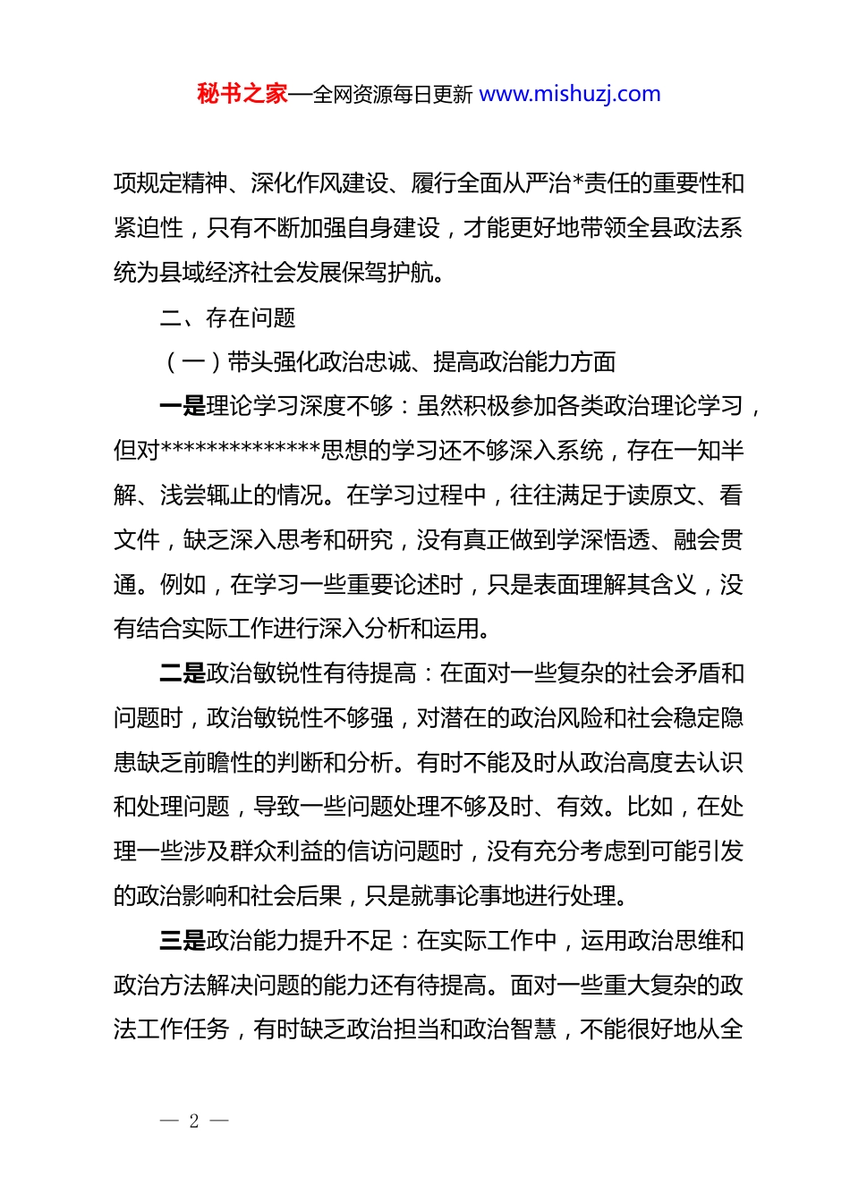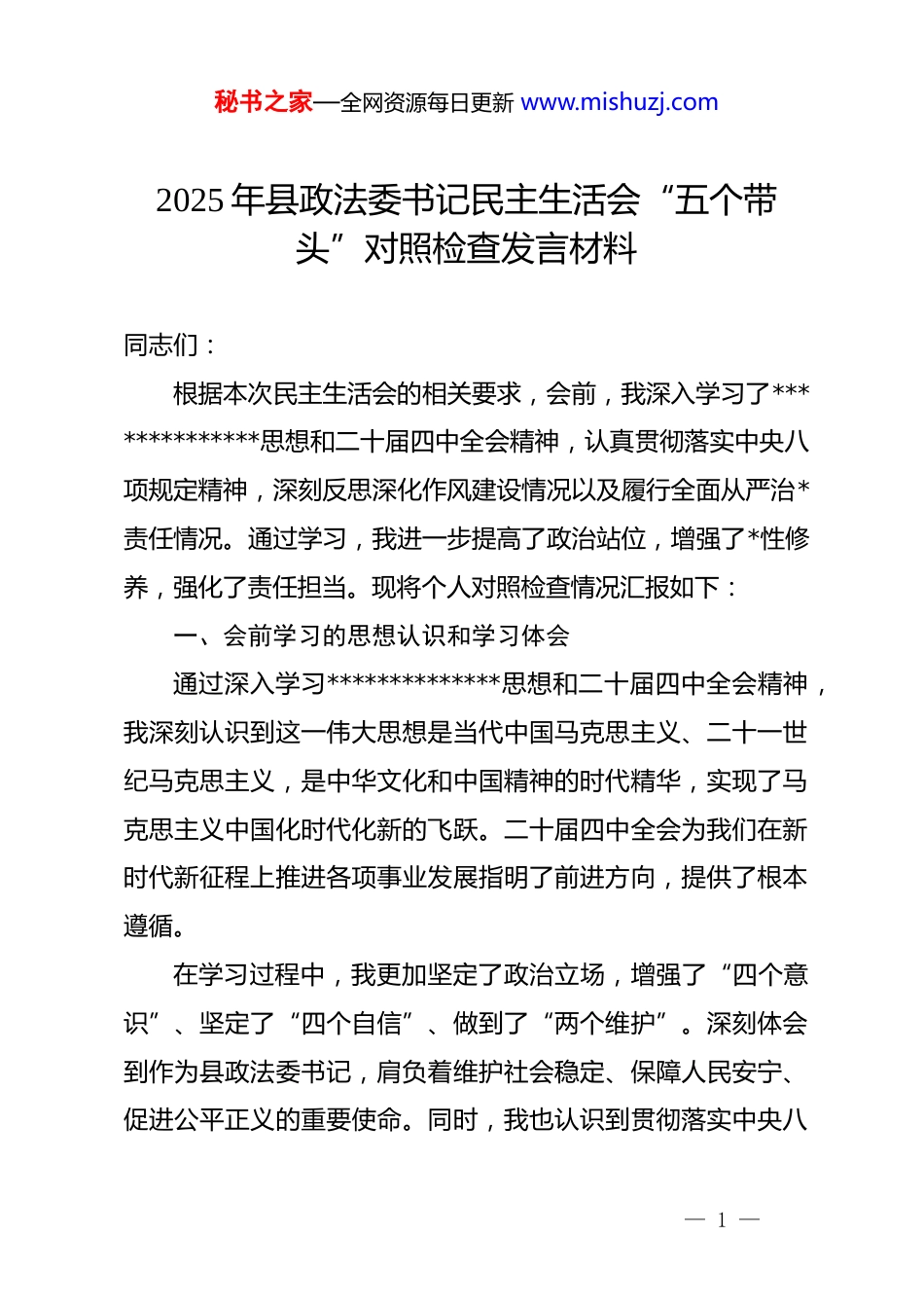 秘书之家—全网资源每日更新 www.mishuzj.com2025 年县政法委书记民主生活会“五个带头”对照检查发言材料同志们:根据本次民主生活会的相关要求,会前,我深入学习了**************思想和二十届四中全会精神,认真贯彻落实中央八项规定精神,深刻反思深化作风建设情况以及履行全面从严治*责任情况。通过学习,我进一步提高了政治站位,增强了*性修养,强化了责任担当。现将个人对照检查情况汇报如下:一、会前学习的思想认识和学习体会通过深入学习**************思想和二十届四中全会精神,我深刻认识到这一伟大思想是当代中国马克思主义、二十一世纪马克思主义,是中华文化和中国精神的时代精华,实现了马克思主义中国化时代化新的飞跃。二十届四中全会为我们在新时代新征程上推进各项事业发展指明了前进方向,提供了根本遵循。在学习过程中,我更加坚定了政治立场,增强了“四个意识”、坚定了“四个自信”、做到了“两个维护”。深刻体会到作为县政法委书记,肩负着维护社会稳定、保障人民安宁、促进公平正义的重要使命。同时,我也认识到贯彻落实中央八— 1 —秘书之家—全网资源每日更新 www.mishuzj.com项规定精神、深化作风建设、履行全面从严治*责任的重要性和紧迫性,只有不断加强自身建设,才能更好地带领全县政法系统为县域经济社会发展保驾护航。二、存在问题(一)带头强化政治忠诚、提高政治能力方面一是理论学习深度不够:虽然积极参加各类政治理论学习,但对**************思想的学习还不够深入系统,存在一知半解、浅尝辄止的情况。在学习过程中,往往满足于读原文、看文件,缺乏深入思考和研究,没有真正做到学深悟透、融会贯通。例如,在学习一些重要论述时,只是表面理解其含义,没有结合实际工作进行深入分析和运用。二是政治敏锐性有待提高:在面对一些复杂的社会矛盾和问题时,政治敏锐性不够强,对潜在的政治风险和社会稳定隐患缺乏前瞻性的判断和分析。有时不能及时从政治高度去认识和处理问题,导致一些问题处理不够及时、有效。比如,在处理一些涉及群众利益的信访问题时,没有充分考虑到可能引发的政治影响和社会后果,只是就事论事地进行处理。三是政治能力提升不足:在实际工作中,运用政治思维和政治方法解决问题的能力还有待提高。面对一些重大复杂的政法工作任务,有时缺乏政治担当和政治智慧,不能很好地从全— 2 —秘书之家—全网资源每日更新 www.mishuzj.com局和战略高度去谋划和推动工作。例如,在推进政法领域改革过程中,遇到一些阻力和困难时,缺乏有效的应对措施和创新方法,导致改革进展不够顺利。(二)带头固本培元、增强*性方面一是*性修养不够坚定:在日常工作和生活中,有时会放松对自己的要求,存在随波逐流的思想。在面对一些不良风气和错误言论时,没有及时进行坚决的抵制和斗争,缺乏应有的*性原则和斗争精神。比如,在参加一些社交活动时,听到一些不当言论,没有当场进行反驳和纠正,而是选择了沉默。二是宗旨意识有所淡化:虽然心中牢记为人民服务的宗旨,但在实际工作中,有时会出现脱离群众的现象。深入基层调研不够经常,对群众的实际需求和困难了解不够深入,在制定政策和开展工作时,没有充分考虑到群众的利益和感受。例如,在推进一些政法工作项目时,没有广泛征求群众的意见和建议,导致部分项目实施效果不理想,群众满意度不高。三是*内政治生活不够严肃:在参加*内政治生活时,有时存在走过场、形式主义的问题。在民主生活会和组织生活会上,批评与自我批评不够深刻,存在避重就轻、蜻蜓点水的现象。对自己的问题认识不够深刻,对他人的批评缺乏诚恳的态度,不能真正达到红脸出汗、排毒治病的效果。— 3 —秘书之家—全网资源每日更新 www.mishuzj.com(三)带头敬畏人民、敬畏组织、敬畏法纪方面一是对人民群众的敬畏之心不够:在工作中,有时会出现急躁情绪,对待群众不够耐心细致。在处理群众诉求时,没有充分尊重群众的意愿和权益,存在简单粗暴的工作方式。例如,在接待群众来访时,对一些反复来访的群众缺乏足够的耐心,没有认真倾听他们的诉求,而是简单地进行答复和处理。二是对组织的忠诚...
