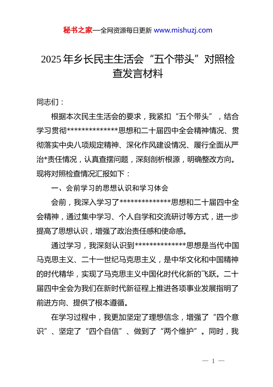 秘书之家—全网资源每日更新 www.mishuzj.com2025 年乡长民主生活会“五个带头”对照检查发言材料同志们:根据本次民主生活会的要求,我紧扣“五个带头”,结合学习贯彻**************思想和二十届四中全会精神情况、贯彻落实中央八项规定精神、深化作风建设情况、履行全面从严治*责任情况,认真查摆问题,深刻剖析根源,明确整改方向。现将对照检查情况汇报如下:一、会前学习的思想认识和学习体会会前,我深入学习了**************思想和二十届四中全会精神,通过集中学习、个人自学和交流研讨等方式,进一步提高了思想认识,增强了政治责任感和使命感。通过学习,我深刻认识到**************思想是当代中国马克思主义、二十一世纪马克思主义,是中华文化和中国精神的时代精华,实现了马克思主义中国化时代化新的飞跃。二十届四中全会为我们在新时代新征程上推进各项事业发展指明了前进方向、提供了根本遵循。在学习过程中,我更加坚定了理想信念,增强了“四个意识”、坚定了“四个自信”、做到了“两个维护”。同时,我— 1 —秘书之家—全网资源每日更新 www.mishuzj.com也深刻认识到作为一名乡长,肩负着推动地方经济社会发展、保障民生福祉的重要职责,必须不断提高自身素质和能力,以更加饱满的热情和更加务实的作风投入到工作中去。二、存在问题(一)带头强化政治忠诚、提高政治能力方面一是政治理论学习不够深入:虽然积极参加各类政治理论学习活动,但学习的系统性和深入性还不够,对**************思想和二十届四中全会精神的理解还停留在表面,没有真正做到学深悟透、融会贯通。在实际工作中,不能很好地运用理论知识指导实践、推动工作。二是政治敏锐性和政治鉴别力有待提高:在面对一些复杂的社会现象和问题时,缺乏敏锐的政治洞察力和鉴别力,不能及时发现其中隐藏的政治风险和隐患。对一些错误思潮和言论,没有旗帜鲜明地进行批判和斗争,缺乏应有的政治担当。三是政治能力与新时代要求还有差距:在处理一些重大问题和突发事件时,还存在政治站位不高、决策不够科学、应对不够及时等问题。在推动工作过程中,有时不能从政治高度去思考和谋划,导致工作效果不够理想。(二)带头固本培元、增强*性方面一是*性修养不够自觉:在日常工作和生活中,有时放松了— 2 —秘书之家—全网资源每日更新 www.mishuzj.com对自己的要求,缺乏严格的*性锻炼。对一些不良现象和行为,没有及时进行纠正和制止,存在“老好人”思想。在面对个人利益和集体利益冲突时,有时不能做到大公无私,存在一定的私心杂念。二是宗旨意识有所淡化:在工作中,有时过于注重工作任务的完成,而忽视了群众的实际需求和利益。深入基层调研不够经常,与群众沟通交流不够密切,对群众反映的问题解决不够及时、不够彻底。在制定政策和推动工作时,没有充分考虑群众的感受和意愿,导致一些工作得不到群众的理解和支持。三是艰苦奋斗精神有所减退:随着生活条件的改善,在工作和生活中逐渐滋生了一些享乐主义和奢靡之风。在办公用品采购、公务接待等方面,存在一定的铺张浪费现象。在工作中,有时缺乏吃苦耐劳的精神,对一些困难和问题存在畏难情绪,缺乏勇于担当、敢于负责的精神。(三)带头敬畏人民、敬畏组织、敬畏法纪方面一是对人民群众的敬畏之心不够强烈:虽然口头上经常强调要为人民服务,但在实际工作中,没有真正把人民群众放在心中最高位置。在处理一些涉及群众利益的问题时,有时不能做到公平公正,存在偏袒一方的现象。对群众的诉求和意见,没有给予足够的重视和回应,导致一些群众对政府工作不满意。— 3 —秘书之家—全网资源每日更新 www.mishuzj.com二是对组织的纪律和规矩遵守不够严格:在工作中,有时存在自由主义思想,对组织的决定和安排不够坚决执行,存在打折扣、搞变通的现象。在*内组织生活中,有时不能严格按照规定要求参加,存在缺席、迟到等问题。对组织的纪律和规矩缺乏敬畏之心,没有真正做到心有所畏、言有所戒、行有所止。三是对法律法规的学习和运用不够到位:虽然具备一定的法律意识,但对法律法规的学习还不够系统、不够深入,对一些新出台的法律法规了...