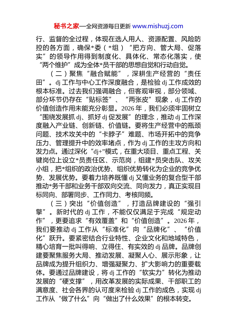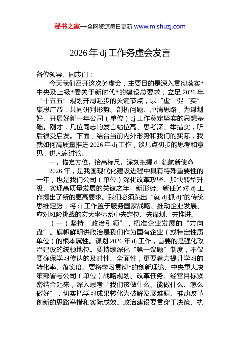 秘书之家—全网资源每日更新 www.mishuzj.com2026 年 dj 工作务虚会发言各位领导、同志们:今天我们召开这次务虚会,主要目的是深入贯彻落实*中央及上级*委关于新时代*的建设总要求,立足 2026 年“十五五”规划开局起步的关键节点,以“虚”促“实”集思广益,共同研判形势、剖析问题、厘清思路,为谋划好、开展好新一年公司(单位)dj 工作奠定坚实的思想基础。刚才,几位同志的发言站位高、思考深、举措实,听后很受启发。下面,结合当前内外形势和我们的实际,我就如何高质量推进 2026 年 dj 工作,谈几点初步的思考和意见,供大家讨论。一、锚定方位、抬高标尺,深刻把握 dj 领航新使命2026 年,是我国现代化建设进程中具有特殊重要性的一年,也是我们公司(单位)深化改革攻坚、加快转型升级、实现高质量发展的关键之年。新形势、新任务对 dj 工作提出了新的更高要求。我们必须跳出“就 dj 抓 dj”的传统思维定势,将 dj 工作置于服务国家战略、推动企业发展、应对风险挑战的宏大坐标系中去定位、去谋划、去推进。(一)坚持“政治引领”,把准企业发展的“方向盘”。旗帜鲜明讲政治是我们作为国有企业(或特定性质单位)的根本属性。谋划 2026 年 dj 工作,首要的是强化政治建设的统领地位。要持续深化“第一议题”制度,不仅要确保学习传达的及时性、全面性,更要着力提升学习的转化率、落实度。要将学习贯彻*的创新理论、中央重大决策部署与公司(单位)战略规划、改革任务、经营目标紧密结合起来,深入思考“我们该做什么、能做什么、怎么做好”,切实把学习成果转化为破解发展难题、推动改革创新的思路举措和实际成效。政治建设要贯穿于决策、执秘书之家—全网资源每日更新 www.mishuzj.com行、监督的全过程,体现在选人用人、资源配置、风险防控的各方面,确保*委(*组)“把方向、管大局、促落实”的领导作用得到制度化、具体化、常态化落实,使“两个维护”成为全体*员干部的思想自觉和行动自觉。(二)聚焦“融合赋能”,深耕生产经营的“责任田”。dj 工作与中心工作深度融合,是检验 dj 工作成效的根本标准。过去我们强调融合,但客观审视,部分领域、部分环节仍存在“贴标签”、“两张皮”现象,dj 工作的价值创造作用未能充分彰显。2026 年,我们必须牢固树立“围绕发展抓 dj、抓好 dj 促发展”的理念,推动 dj 工作深度融入产业链、创新链、价值链。要将生产经营中的瓶颈问题、技术攻关中的“卡脖子”难题、市场开拓中的竞争压力、管理提升中的效率堵点,作为 dj 工作的主攻方向和发力点。通过深化“dj+”模式,在重大项目、重点工程、关键岗位上设立*员责任区、示范岗,组建*员突击队、攻关小组,把*组织的政治优势、组织优势转化为企业的竞争优势、发展优势。要着力培养既懂 dj 又懂业务的复合型干部推动*务干部和业务干部双向交流、同向发力,真正实现目标同向、部署同步、工作同力、考核同频。(三)突出“价值创造”,打造品牌建设的“强引擎”。新时代的 dj 工作,不能仅仅满足于完成“规定动作”,更要追求“有效覆盖”和“价值创造”。2026 年,我们要推动 dj 工作从“标准化”向“品牌化”、“价值化”跃升。要紧密结合行业特性、企业文化和地域特色,精心培育一批叫得响、立得住、有实效的 dj 品牌。品牌创建要聚焦服务大局、推动发展、凝聚人心、展示形象,让品牌成为提升组织力、增强凝聚力、扩大影响力的重要载体。要通过品牌建设,将 dj 工作的“软实力”转化为推动发展的“硬支撑”,用改革发展的实际成果、干部职工的满意度、社会各界的认可度来检验 dj 工作的成色,实现 dj工作从“做了什么”向“做出了什么效果”的根本转变。秘书之家—全网资源每日更新 www.mishuzj.com二、正视短板、刀刃向内,清醒认识当前工作新挑战在肯定成绩、总结经验的同时,我们必须保持清醒头脑,坚持问题导向,勇于自我革命。通过日常调研、考核反馈和今天的交流,我认为当前我们的 dj 工作在系统性、穿透力、创新性上还存在一些亟待解决的深层次问题。(一)思想认识存有“温差”,责任传导还不够到位...