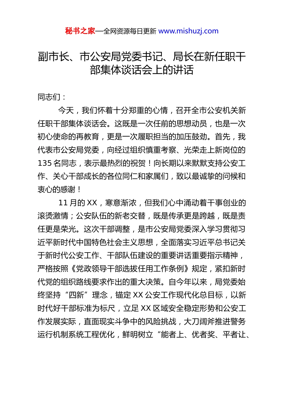 秘书之家—全网资源每日更新 www.mishuzj.com副市长、市公安局党委书记、局长在新任职干部集体谈话会上的讲话同志们:今天,我们怀着十分郑重的心情,召开全市公安机关新任职干部集体谈话会。这既是一次任前的思想动员,也是一次初心使命的再教育,更是一次履职担当的加压鼓劲。首先,我代表市公安局党委,向经过组织慎重考察、光荣走上新岗位的135 名同志,表示最热烈的祝贺!向长期以来默默支持公安工作、关心干部成长的各位同仁和家属们,致以最诚挚的问候和衷心的感谢!11 月的 XX,寒意渐浓,但我们心中涌动着干事创业的滚烫激情;公安队伍的新老交替,既是传承更是跨越,既是责任更是荣光。这次干部调整,是市公安局党委深入学习贯彻习近平新时代中国特色社会主义思想,全面落实习近平总书记关于新时代公安工作、干部队伍建设的重要讲话重要指示精神,严格按照《党政领导干部选拔任用工作条例》规定,紧扣新时代党的组织路线要求作出的重大决策。自今年以来,局党委始终坚持“四新”理念,锚定 XX 公安工作现代化总目标,以新时代好干部标准为标尺,立足 XX 区域安全稳定形势和公安工作发展实际,直面现实斗争中的风险挑战,大刀阔斧推进警务运行机制系统工程优化,鲜明树立“能者上、优者奖、平者让、秘书之家—全网资源每日更新 www.mishuzj.com庸者下”的用人导向,不仅圆满完成了全市公安机关机构编制管理改革的硬任务,更让一批政治过硬、业务精湛、作风优良、敢于担当的优秀干部脱颖而出,为 XX 公安队伍注入了新鲜血液、增添了强劲动力,推动全市公安干部队伍建设迈上新台阶、开启新篇章。同志们,新岗位意味着新使命,新职务承载着新期待。当前,我们正处在实现中华民族伟大复兴的关键时期,XX 正处在高质量发展的攻坚阶段,公安工作面临的形势之复杂、任务之艰巨、责任之重大前所未有。从维护国家政治安全到防范化解各类风险隐患,从打击违法犯罪到保障人民安居乐业,从服务经济社会发展到推进法治公安建设,每一项任务都考验着我们的政治智慧、业务能力和责任担当。组织把你们放到新的领导岗位上,是信任更是重托,是考验更是锤炼。希望大家倍加珍惜组织给予的平台和机遇,倍加珍惜人民群众的信任和期盼,迅速转换角色、扛起重任,以“时不我待、只争朝夕”的紧迫感,以“恪尽职守、勤勉务实”的责任感,在新岗位上展现新气象、实现新作为、创造新业绩,向组织和人民交上一份满意的答卷,为 XX 公安在新时代新征程上昂首阔步、开拓进取,为维护国家政治安全和社会稳定、护航 XX 高质量发展作出新的、更大的贡献。下面,我提四点要求,与大家共勉。一、铸牢忠诚之魂,做政治坚定的“明白人”“天下至德,莫大于忠。”公安队伍是党绝对领导下的纪秘书之家—全网资源每日更新 www.mishuzj.com律部队,忠诚是融入血脉的政治基因,是公安干部的第一品格、第一要求。习近平总书记反复强调,“对党忠诚,是共产党人首要的政治品质”“公安机关要牢牢把握对党忠诚这一建警之魂”。作为新任职的领导干部,我们必须把讲政治摆在首位,始终在政治立场、政治方向、政治原则、政治道路上同以习近平同志为核心的党中央保持高度一致,永葆绝对忠诚、绝对纯洁、绝对可靠的政治本色。一要把稳“政治方向盘”,坚持党的绝对领导。党的绝对领导是公安工作的根本保证,是公安机关安身立命的根本所在。我们要深刻领悟“两个确立”的决定性意义,增强“四个意识”、坚定“四个自信”、做到“两个维护”,始终把党的领导贯穿公安工作全过程、各方面。要严格执行重大事项请示报告制度,坚决服从局党委的统一领导、统一指挥、统一部署,做到令行禁止、政令畅通,绝不允许有令不行、有禁不止,绝不允许搞上有政策、下有对策,绝不允许在贯彻执行上级决策部署上打折扣、搞变通。要深刻认识公安工作的政治属性,始终坚持正确的政治方向,在大是大非面前旗帜鲜明,在风浪考验面前无所畏惧,在各种诱惑面前立场坚定,坚决同一切违背、歪曲、否定党的理论和路线方针政策的言行作斗争,坚决维护党中央权威和集中统一领导。二要筑牢“思想压舱石”,强化创新理论武装。思想是行动的...