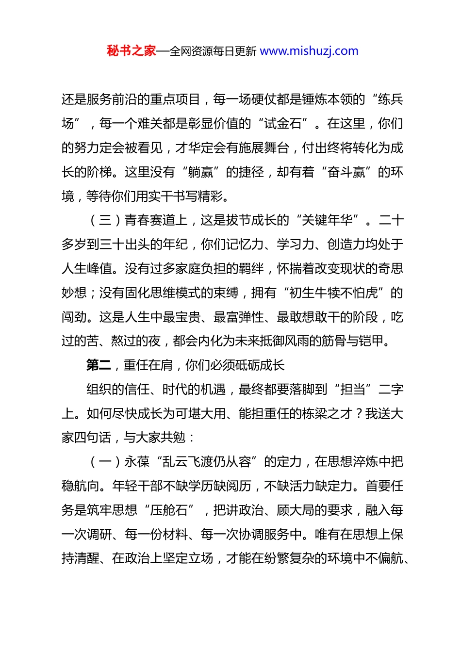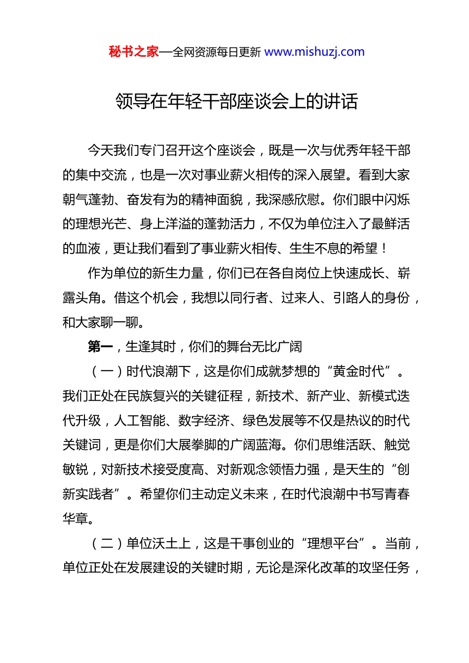秘书之家—全网资源每日更新 www.mishuzj.com领导在年轻干部座谈会上的讲话 今天我们专门召开这个座谈会,既是一次与优秀年轻干部的集中交流,也是一次对事业薪火相传的深入展望。看到大家朝气蓬勃、奋发有为的精神面貌,我深感欣慰。你们眼中闪烁的理想光芒、身上洋溢的蓬勃活力,不仅为单位注入了最鲜活的血液,更让我们看到了事业薪火相传、生生不息的希望!作为单位的新生力量,你们已在各自岗位上快速成长、崭露头角。借这个机会,我想以同行者、过来人、引路人的身份,和大家聊一聊。第一,生逢其时,你们的舞台无比广阔(一)时代浪潮下,这是你们成就梦想的“黄金时代”。我们正处在民族复兴的关键征程,新技术、新产业、新模式迭代升级,人工智能、数字经济、绿色发展等不仅是热议的时代关键词,更是你们大展拳脚的广阔蓝海。你们思维活跃、触觉敏锐,对新技术接受度高、对新观念领悟力强,是天生的“创新实践者”。希望你们主动定义未来,在时代浪潮中书写青春华章。(二)单位沃土上,这是干事创业的“理想平台”。当前,单位正处在发展建设的关键时期,无论是深化改革的攻坚任务,秘书之家—全网资源每日更新 www.mishuzj.com还是服务前沿的重点项目,每一场硬仗都是锤炼本领的“练兵场”,每一个难关都是彰显价值的“试金石”。在这里,你们的努力定会被看见,才华定会有施展舞台,付出终将转化为成长的阶梯。这里没有“躺赢”的捷径,却有着“奋斗赢”的环境,等待你们用实干书写精彩。(三)青春赛道上,这是拔节成长的“关键年华”。二十多岁到三十出头的年纪,你们记忆力、学习力、创造力均处于人生峰值。没有过多家庭负担的羁绊,怀揣着改变现状的奇思妙想;没有固化思维模式的束缚,拥有“初生牛犊不怕虎”的闯劲。这是人生中最宝贵、最富弹性、最敢想敢干的阶段,吃过的苦、熬过的夜,都会内化为未来抵御风雨的筋骨与铠甲。第二,重任在肩,你们必须砥砺成长组织的信任、时代的机遇,最终都要落脚到“担当”二字上。如何尽快成长为可堪大用、能担重任的栋梁之才?我送大家四句话,与大家共勉:(一)永葆“乱云飞渡仍从容”的定力,在思想淬炼中把稳航向。年轻干部不缺学历缺阅历,不缺活力缺定力。首要任务是筑牢思想“压舱石”,把讲政治、顾大局的要求,融入每一次调研、每一份材料、每一次协调服务中。唯有在思想上保持清醒、在政治上坚定立场,才能在纷繁复杂的环境中不偏航、秘书之家—全网资源每日更新 www.mishuzj.com不迷向。(二)练就“青出于蓝胜于蓝”的才力,在专业训练中夯实根基。事业发展容不得“大概”“也许”,必须专业、精准、高效。希望大家主动锤炼过硬本领,一要向书本学,多读经典著作、深钻业务知识,克服“本领恐慌”,不做一知半解的“夹生干部”;二要向实践学,把办公室搬到项目一线、基层现场,在解决实际问题中积累真知灼见;三要向同事学,保持“三人行必有我师”的谦逊态度,努力成为“政策通”“活字典”,做到提笔能写、开口能讲、问策能对、遇事能办。(三)昂扬“狭路相逢勇者胜”的魄力,在担当作为中扛起大梁。年轻人就该有年轻人的模样,这份模样就是锐气与闯劲。不能习惯于“等部署”“听安排”,面对常规工作,要追求卓越,不满足于“做了”,更要力求“做好”“做精”;面对急难任务,要敢于上前,不怕接“烫手山芋”,勇于钻“矛盾窝”;面对创新课题,要大胆尝试,即便未必成功,也能为后来者蹚路、积累经验。记住,躺平没有出路,等待没有前途,你们的担当里,藏着未来的模样。(四)涵养“只留清气满乾坤”的境界,在心态磨炼中坚守底线。成长之路从非一帆风顺的直线,有顺境亦有逆境,要学会处理好“三对关系”:处理好“顺”与“逆”,得意时淡秘书之家—全网资源每日更新 www.mishuzj.com然,失意时坦然,把挫折当成成长的“钙片”,在磨砺中强筋健骨;处理好“快”与“慢”,沉得住气、耐得住寂寞,相信功不唐捐,相信组织不会埋没真正努力的人;处理好“大”与“小”,心怀“国之大者”,做好分内小事;既要追求事业进步,更要守牢廉洁底线,做到慎独、慎初、慎微、慎友,干干净净做事,清清白白做...