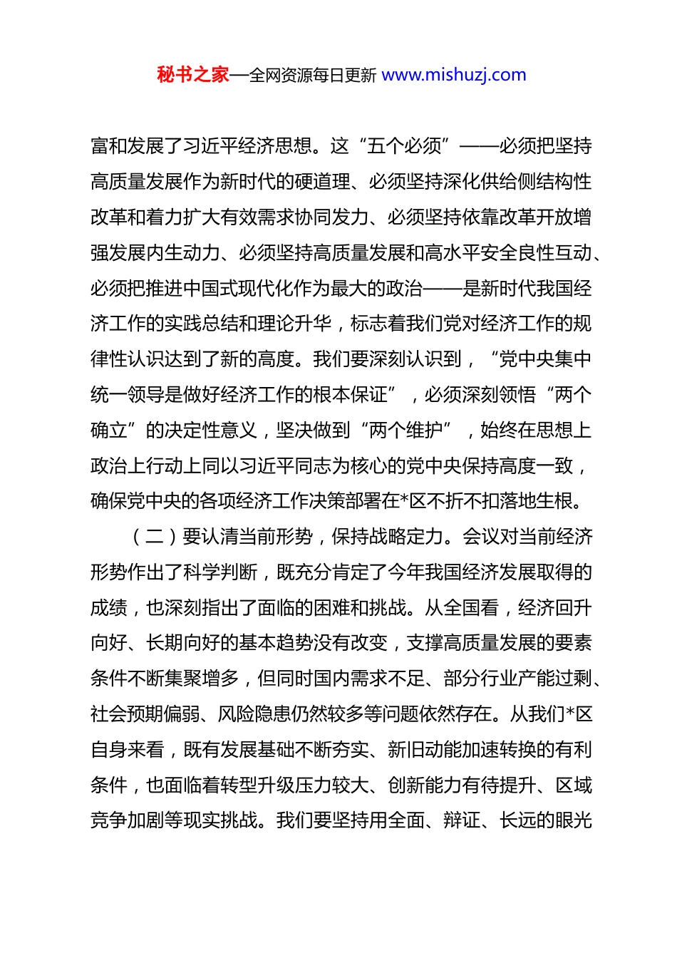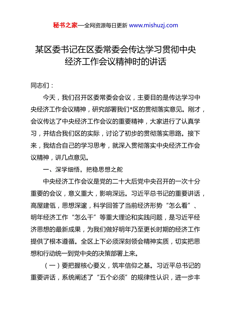 秘书之家—全网资源每日更新 www.mishuzj.com某区委书记在区委常委会传达学习贯彻中央经济工作会议精神时的讲话 同志们:今天,我们召开区委常委会会议,主要目的是传达学习中央经济工作会议精神,研究部署我们*区的贯彻落实意见。刚才,会议传达了中央经济工作会议的重要精神,大家进行了认真学习,并结合我们区的实际,讨论了初步的贯彻落实思路。接下来,我结合自己的学习思考,就深入贯彻落实中央经济工作会议精神,讲几点意见。一、深学细悟,把稳思想之舵中央经济工作会议是党的二十大后党中央召开的一次十分重要的会议,意义重大,影响深远。习近平总书记的重要讲话,高屋建瓴,思想深邃,科学回答了当前经济形势“怎么看”、明年经济工作“怎么干”等重大理论和实践问题,是习近平经济思想的最新成果,为我们做好明年乃至更长时期的经济工作提供了根本遵循。全区上下必须深刻领会精神实质,切实把思想和行动统一到党中央的决策部署上来。(一)要把握核心要义,筑牢信仰之基。习近平总书记的重要讲话,系统阐述了“五个必须”的规律性认识,进一步丰秘书之家—全网资源每日更新 www.mishuzj.com富和发展了习近平经济思想。这“五个必须”——必须把坚持高质量发展作为新时代的硬道理、必须坚持深化供给侧结构性改革和着力扩大有效需求协同发力、必须坚持依靠改革开放增强发展内生动力、必须坚持高质量发展和高水平安全良性互动、必须把推进中国式现代化作为最大的政治——是新时代我国经济工作的实践总结和理论升华,标志着我们党对经济工作的规律性认识达到了新的高度。我们要深刻认识到,“党中央集中统一领导是做好经济工作的根本保证”,必须深刻领悟“两个确立”的决定性意义,坚决做到“两个维护”,始终在思想上政治上行动上同以习近平同志为核心的党中央保持高度一致,确保党中央的各项经济工作决策部署在*区不折不扣落地生根。(二)要认清当前形势,保持战略定力。会议对当前经济形势作出了科学判断,既充分肯定了今年我国经济发展取得的成绩,也深刻指出了面临的困难和挑战。从全国看,经济回升向好、长期向好的基本趋势没有改变,支撑高质量发展的要素条件不断集聚增多,但同时国内需求不足、部分行业产能过剩、社会预期偏弱、风险隐患仍然较多等问题依然存在。从我们*区自身来看,既有发展基础不断夯实、新旧动能加速转换的有利条件,也面临着转型升级压力较大、创新能力有待提升、区域竞争加剧等现实挑战。我们要坚持用全面、辩证、长远的眼光秘书之家—全网资源每日更新 www.mishuzj.com看待当前形势,既要看到“危”中之“机”,也要认清“时”与“势”,始终保持清醒头脑,增强忧患意识,更要坚定信心决心,看到我国经济韧性强、潜力大、活力足,长期向好的基本面没有改变,我们*区高质量发展具有多方面优势和条件。要善于化危为机,变压力为动力,牢牢把握经济工作主动权。(三)要明确目标方向,找准发展路径。会议明确了明年经济工作的总体要求、政策取向和重点任务,强调要“稳中求进、以进促稳、先立后破”,并围绕推动高质量发展作出了全面部署。这要求我们必须紧密结合*区实际,将中央的“大蓝图”转化为我们区的“施工图”。要紧紧围绕高质量发展这一首要任务,完整、准确、全面贯彻新发展理念,服务和融入新发展格局。对于我们*区而言,就是要坚持“三个大抓”头号工程不动摇(大抓产业、大抓项目、大抓招商),以科技创新引领现代化产业体系建设,深化改革开放,持续优化营商环境,有效防范化解风险,不断增进民生福祉,努力在推动高质量发展上取得新成效,为全市、全省发展大局作出更大贡献。要科学谋划好明年我区经济工作的目标任务、重点举措和推进路径,确保各项部署一贯到底、见行见效。二、聚焦重点,打响攻坚之战贯彻落实中央经济工作会议精神,关键要找准切入点、着秘书之家—全网资源每日更新 www.mishuzj.com力点,聚焦主要任务,抓住关键环节,以重点突破带动全局提升。结合*区实际,明年我们要在以下几个方面聚力用劲,打好攻坚战。(一)要聚力扩大内需,畅通经济循环。内需是中国经济发展的基本动力。当前,有效需求不足是...