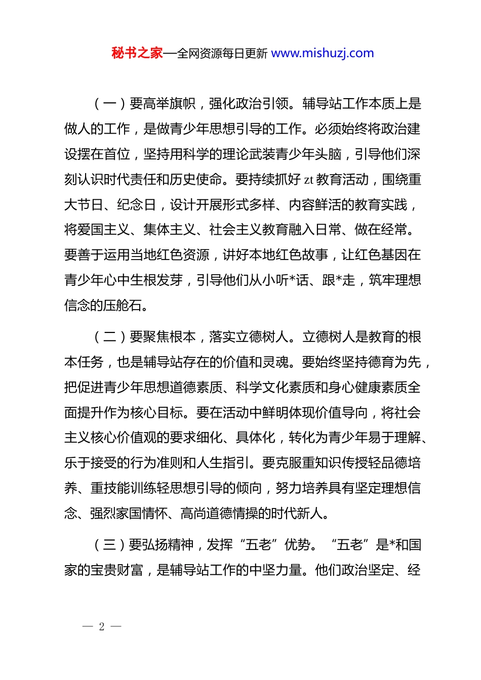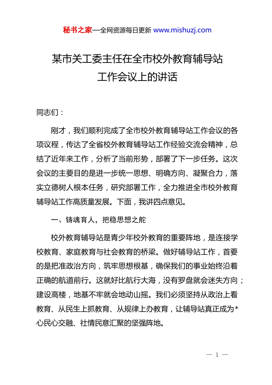 秘书之家—全网资源每日更新 www.mishuzj.com某市关工委主任在全市校外教育辅导站工作会议上的讲话同志们:刚才,我们顺利完成了全市校外教育辅导站工作会议的各项议程,传达了全省校外教育辅导站工作经验交流会精神,总结了近年来工作,分析了当前形势,部署了下一步任务。这次会议的主要目的是进一步统一思想、明确方向、凝聚合力,落实立德树人根本任务,研究部署工作,全力推进全市校外教育辅导站工作高质量发展。下面,我讲四点意见。一、铸魂育人,把稳思想之舵校外教育辅导站是青少年校外教育的重要阵地,是连接学校教育、家庭教育与社会教育的桥梁。做好辅导站工作,首要的是把准政治方向,筑牢思想根基,确保我们的事业始终沿着正确的航道前行。这就好比航行大海,没有罗盘就会迷失方向;建设高楼,地基不牢就会地动山摇。我们必须坚持从政治上看教育、从民生上抓教育、从规律上办教育,让辅导站真正成为*心民心交融、社情民意汇聚的坚强阵地。— 1 —秘书之家—全网资源每日更新 www.mishuzj.com(一)要高举旗帜,强化政治引领。辅导站工作本质上是做人的工作,是做青少年思想引导的工作。必须始终将政治建设摆在首位,坚持用科学的理论武装青少年头脑,引导他们深刻认识时代责任和历史使命。要持续抓好 zt 教育活动,围绕重大节日、纪念日,设计开展形式多样、内容鲜活的教育实践,将爱国主义、集体主义、社会主义教育融入日常、做在经常。要善于运用当地红色资源,讲好本地红色故事,让红色基因在青少年心中生根发芽,引导他们从小听*话、跟*走,筑牢理想信念的压舱石。(二)要聚焦根本,落实立德树人。立德树人是教育的根本任务,也是辅导站存在的价值和灵魂。要始终坚持德育为先,把促进青少年思想道德素质、科学文化素质和身心健康素质全面提升作为核心目标。要在活动中鲜明体现价值导向,将社会主义核心价值观的要求细化、具体化,转化为青少年易于理解、乐于接受的行为准则和人生指引。要克服重知识传授轻品德培养、重技能训练轻思想引导的倾向,努力培养具有坚定理想信念、强烈家国情怀、高尚道德情操的时代新人。(三)要弘扬精神,发挥“五老”优势。“五老”是*和国家的宝贵财富,是辅导站工作的中坚力量。他们政治坚定、经— 2 —秘书之家—全网资源每日更新 www.mishuzj.com验丰富、德高望重,对青少年具有独特的亲和力、感染力和号召力。要大力弘扬“忠诚敬业、关爱后代、务实创新、无私奉献”的“五老”精神,积极搭建平台、创造条件,鼓励和支持更多老同志投身关心下一代事业。要充分发挥“五老”在思想教导、传承红色基因、法治教育、化解代沟等方面的特殊作用,让他们成为青少年健康成长路上的引路人、守护人。(四)要守正创新,增强阵地引力。时代在变,青少年的需求也在变。辅导站不能墨守成规,必须与时俱进,增强时代感和吸引力。要坚持“不开新课、不布置作业、不组织考试”的办站要求,坚守“方便学员、满足需求、免费辅导”的办站理念,避免成为“第二课堂”。要深入研究当代青少年的身心特点和成长规律,善于运用他们喜闻乐见的方式、语言和载体开展工作。要积极运用现代信息技术,探索“线上+线下”相结合的模式,扩大覆盖面和影响力,使辅导站工作充满生机活力。二、固本强基,织密组织之网基础不牢,地动山摇。校外教育辅导站要持续健康发展,离不开坚强有力的组织保障和健全完善的体系网络。这就像一棵大树,根系发达才能枝繁叶茂;如同一张渔网,结点紧密才— 3 —秘书之家—全网资源每日更新 www.mishuzj.com能兜住活鱼。我们必须下大力气抓好组织体系、队伍建设和制度规范,为辅导站工作高质量发展提供坚实支撑。(一)要加强领导,完善工作机制。办好辅导站,关键在领导。要坚持“*委重视、关工牵头、部门协同、社会参与”的工作机制,把辅导站建设纳入相关工作规划和议事日程,定期研究解决重大问题。各级关工委要主动担当作为,切实履行好主办职责,加强统筹协调。要推动建立与文明办、教育局、财政局等部门的常态化沟通协作机制,明确各自责任,形成齐抓共管的工作格局。要特别重视乡镇(街道)、村(社区)层面关...