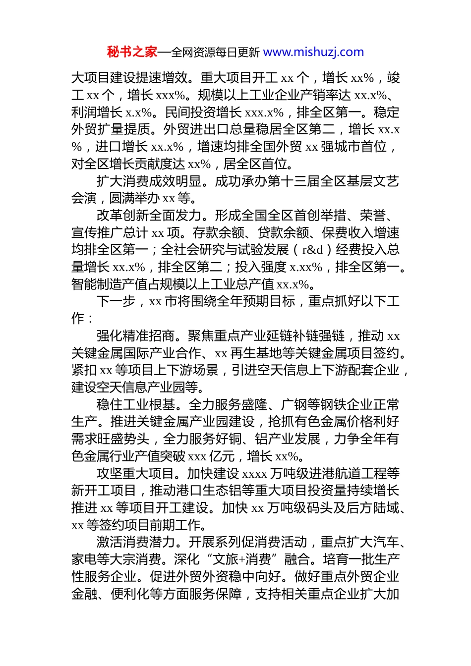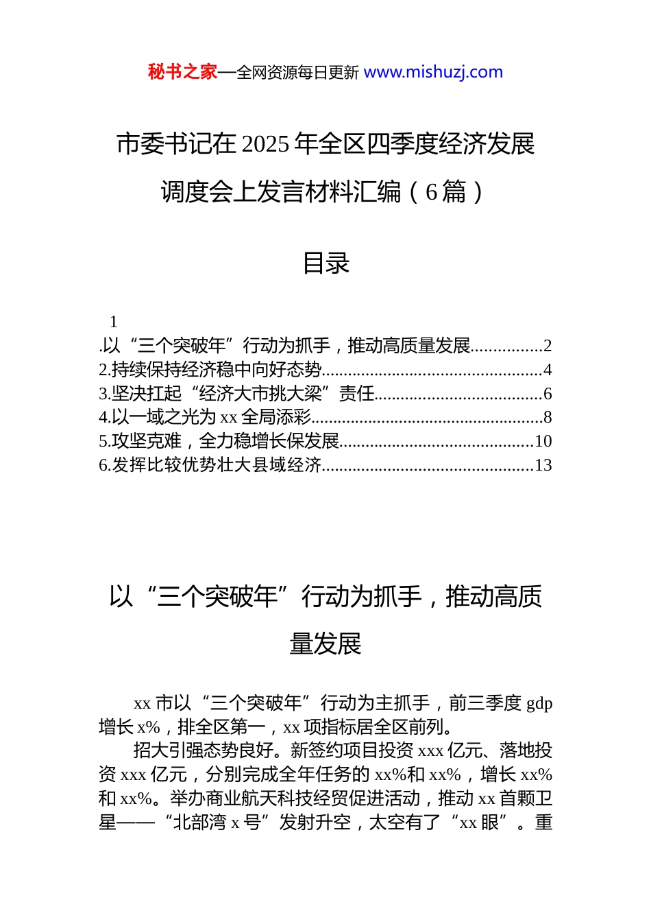 秘书之家—全网资源每日更新 www.mishuzj.com市委书记在 2025 年全区四季度经济发展调度会上发言材料汇编(6 篇)目录1.以“三个突破年”行动为抓手,推动高质量发展................22.持续保持经济稳中向好态势..................................................43.坚决扛起“经济大市挑大梁”责任......................................64.以一域之光为 xx 全局添彩.....................................................85.攻坚克难,全力稳增长保发展............................................106.发挥比较优势壮大县域经济................................................13以“三个突破年”行动为抓手,推动高质量发展xx 市以“三个突破年”行动为主抓手,前三季度 gdp增长 x%,排全区第一,xx 项指标居全区前列。招大引强态势良好。新签约项目投资 xxx 亿元、落地投资 xxx 亿元,分别完成全年任务的 xx%和 xx%,增长 xx%和 xx%。举办商业航天科技经贸促进活动,推动 xx 首颗卫星——“北部湾 x 号”发射升空,太空有了“xx 眼”。重秘书之家—全网资源每日更新 www.mishuzj.com大项目建设提速增效。重大项目开工 xx 个,增长 xx%,竣工 xx 个,增长 xxx%。规模以上工业企业产销率达 xx.x%、利润增长 x.x%。民间投资增长 xxx.x%,排全区第一。稳定外贸扩量提质。外贸进出口总量稳居全区第二,增长 xx.x%,进口增长 xx.x%,增速均排全国外贸 xx 强城市首位,对全区增长贡献度达 xx%,居全区首位。扩大消费成效明显。成功承办第十三届全区基层文艺会演,圆满举办 xx 等。改革创新全面发力。形成全国全区首创举措、荣誉、宣传推广总计 xx 项。存款余额、贷款余额、保费收入增速均排全区第一;全社会研究与试验发展(r&d)经费投入总量增长 xx.x%,排全区第二;投入强度 x.xx%,排全区第一。智能制造产值占规模以上工业总产值 xx.x%。下一步,xx 市将围绕全年预期目标,重点抓好以下工作:强化精准招商。聚焦重点产业延链补链强链,推动 xx关键金属国际产业合作、xx 再生基地等关键金属项目签约。紧扣 xx 等项目上下游场景,引进空天信息上下游配套企业,建设空天信息产业园等。稳住工业根基。全力服务盛隆、广钢等钢铁企业正常生产。推进关键金属产业园建设,抢抓有色金属价格利好需求旺盛势头,全力服务好铜、铝产业发展,力争全年有色金属行业产值突破 xxx 亿元,增长 xx%。攻坚重大项目。加快建设 xxxx 万吨级进港航道工程等新开工项目,推动港口生态铝等重大项目投资量持续增长推进 xx 等项目开工建设。加快 xx 万吨级码头及后方陆域、xx 等签约项目前期工作。激活消费潜力。开展系列促消费活动,重点扩大汽车、家电等大宗消费。深化“文旅+消费”融合。培育一批生产性服务企业。促进外贸外资稳中向好。做好重点外贸企业金融、便利化等方面服务保障,支持相关重点企业扩大加秘书之家—全网资源每日更新 www.mishuzj.com工贸易规模。持续保持经济稳中向好态势xx 市坚持实干为要,不断推动全市经济延续稳中有进的发展态势。一是持续保持经济稳中向好的态势。前三季度,全市 gdp 增长 x.x%,规模以上工业增加值增长 xx.x%,一般公共预算收入增长 xx.x%,外贸进出口总额增长x.x%。二是持续保持高质量发展扎实推进的态势。以人工智能赋能千行百业,灵伴科技智能 ar 项目全面落地,中国—东盟 ai 星座星上算力网络启动,建设空天一体智能巡边管控打私试点。加快培育新的增长点,新签约项目投资总额增长 xx.xx%,落地投资完成额增长 xx.xx%。三是持续保持经济发展韧性强、潜能大的态势。面对外部环境不确定性、多轮台风叠加袭击严重影响,全力推动外贸进出口总额、跨境电商稳居全区首位,推动南宁至凭祥高铁 xx 至凭祥段满图试运行,成功举办“xxxx”群星演唱会等各类活动xxx 多场,全市接待游客增长 xx.xx%、游客花费增长 xx.xx%。四季度,xx 市将全力以赴抓好全年各项工作,确保全年 gdp 增长 x.x%以上,努力实现“十四五”圆满收官和“十五五”顺利开局。拼项目。紧盯项目“招引...