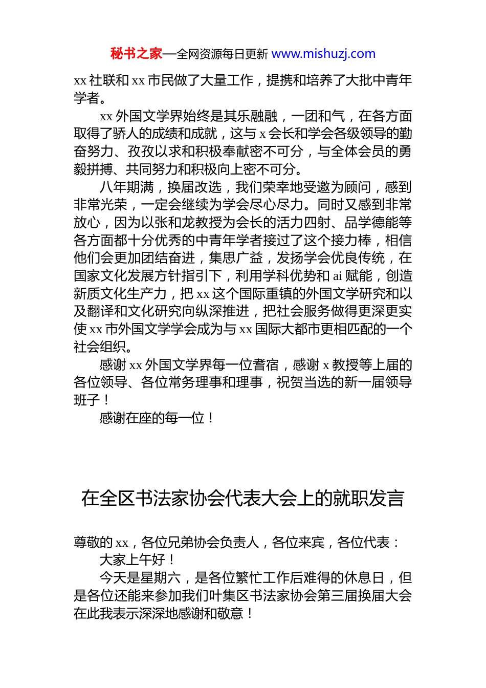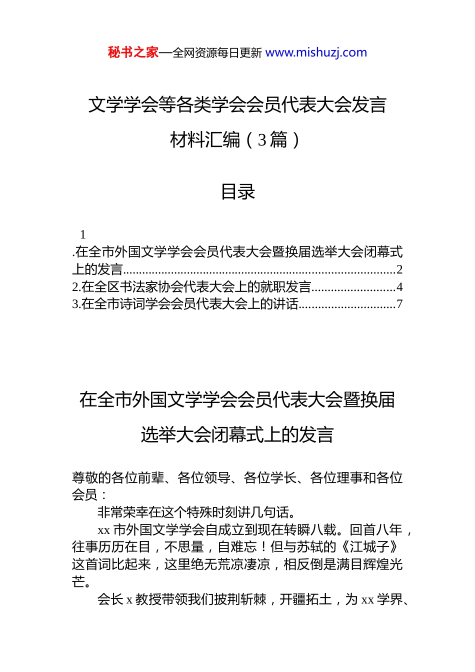 秘书之家—全网资源每日更新 www.mishuzj.com文学学会等各类学会会员代表大会发言材料汇编(3 篇)目录1.在全市外国文学学会会员代表大会暨换届选举大会闭幕式上的发言.....................................................................................22.在全区书法家协会代表大会上的就职发言..........................43.在全市诗词学会会员代表大会上的讲话..............................7在全市外国文学学会会员代表大会暨换届选举大会闭幕式上的发言尊敬的各位前辈、各位领导、各位学长、各位理事和各位会员:非常荣幸在这个特殊时刻讲几句话。xx 市外国文学学会自成立到现在转瞬八载。回首八年,往事历历在目,不思量,自难忘!但与苏轼的《江城子》这首词比起来,这里绝无荒凉凄凉,相反倒是满目辉煌光芒。会长 x 教授带领我们披荆斩棘,开疆拓土,为 xx 学界、秘书之家—全网资源每日更新 www.mishuzj.comxx 社联和 xx 市民做了大量工作,提携和培养了大批中青年学者。xx 外国文学界始终是其乐融融,一团和气,在各方面取得了骄人的成绩和成就,这与 x 会长和学会各级领导的勤奋努力、孜孜以求和积极奉献密不可分,与全体会员的勇毅拼搏、共同努力和积极向上密不可分。八年期满,换届改选,我们荣幸地受邀为顾问,感到非常光荣,一定会继续为学会尽心尽力。同时又感到非常放心,因为以张和龙教授为会长的活力四射、品学德能等各方面都十分优秀的中青年学者接过了这个接力棒,相信他们会更加团结奋进,集思广益,发扬学会优良传统,在国家文化发展方针指引下,利用学科优势和 ai 赋能,创造新质文化生产力,把 xx 这个国际重镇的外国文学研究和以及翻译和文化研究向纵深推进,把社会服务做得更深更实使 xx 市外国文学学会成为与 xx 国际大都市更相匹配的一个社会组织。感谢 xx 外国文学界每一位耆宿,感谢 x 教授等上届的各位领导、各位常务理事和理事,祝贺当选的新一届领导班子!感谢在座的每一位!在全区书法家协会代表大会上的就职发言尊敬的 xx,各位兄弟协会负责人,各位来宾,各位代表:大家上午好!今天是星期六,是各位繁忙工作后难得的休息日,但是各位还能来参加我们叶集区书法家协会第三届换届大会在此我表示深深地感谢和敬意!秘书之家—全网资源每日更新 www.mishuzj.com自协会成立至今,我有幸与诸位书友携手十载。今日,又承幸大家的厚爱,连任第三届主席。这份托付,是情谊是责任,更是有“十年磨一剑,再启新征程”的感慨与敬畏。这十年,我们有“笔落惊风雨”的畅快,也有“为伊消得人憔悴”的坚守。这十年,我与我们的书友结下浓厚的友谊,无拘无束,书法结缘,我见证了你们每一位、一次次的进步。这十年,叶集的校园、军营、社区、敬老院乡村等等处处,留下我们满满的回忆。这十年,我们更是与叶集区建区同步,努力而矫健地走来,虽然我们起步晚人口体量小,但是我们近年来在六安市的各项展赛中,与兄弟县区相比,均取得中等偏优的成绩。这些成绩离不开书法前辈的鼎力托举,也离不开各位书友的辛勤付出。古人云“周虽旧邦,其命维新”,未来五年,我愿与每一位同道,笔墨为舟,文化为楫,做好四件事:一、守本源。我们将继续坚持以***文化思想为中心,以省市区文化工作为指导,完成好组织上交给我们的各项任务,深挖叶集的文化底蕴,将我们的“商贸文化、未名文化、红色文化、美食文化”融入书法创作中,为叶集区的文化建设增砖添瓦。二、育新人。我们将继续在发现新人,培养新人,鼓励帮助新人上下足功夫。书法事业的兴盛与发展,关健在青年。为他们搭建平台,结对名师,不定期举办书法交流沙龙,让更多勤奋而有才情的同道脱颖而出,成为叶集书法的新生力量,扩大叶集书法队伍和社会影响力。三、拓格局。区书协继续秉承走出去、请进来的思路,邀请名家来叶集传经送宝。我们也将继续与全国书法强市强县深度合作交流。目前已有“三县书法联展”“十人书法展”等意向构思,拓宽眼界,共同提高。四、定任务。区书协目前有省书协会员 xx 人,市书协xx 人,目前还没有一位中书协会员。我计划在本届力排众难,突出...