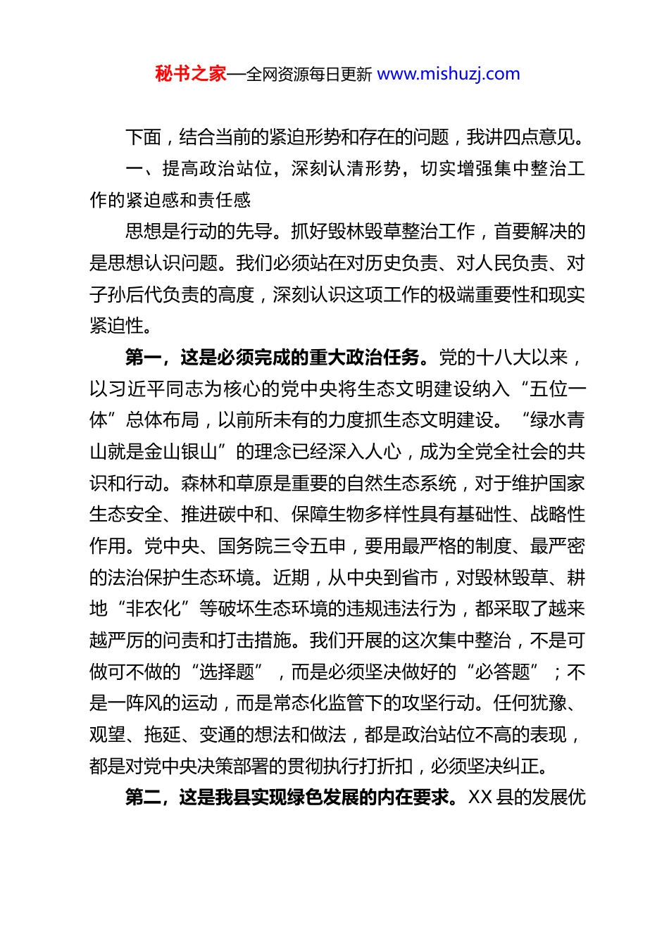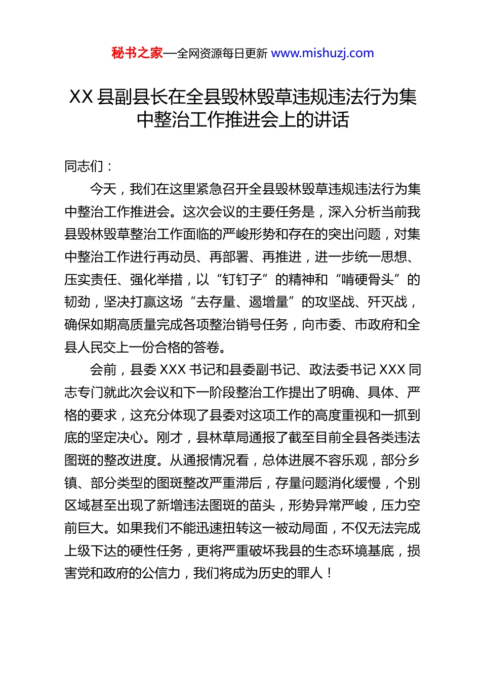 秘书之家—全网资源每日更新 www.mishuzj.comXX 县副县长在全县毁林毁草违规违法行为集中整治工作推进会上的讲话同志们:今天,我们在这里紧急召开全县毁林毁草违规违法行为集中整治工作推进会。这次会议的主要任务是,深入分析当前我县毁林毁草整治工作面临的严峻形势和存在的突出问题,对集中整治工作进行再动员、再部署、再推进,进一步统一思想、压实责任、强化举措,以“钉钉子”的精神和“啃硬骨头”的韧劲,坚决打赢这场“去存量、遏增量”的攻坚战、歼灭战,确保如期高质量完成各项整治销号任务,向市委、市政府和全县人民交上一份合格的答卷。会前,县委 XXX 书记和县委副书记、政法委书记 XXX 同志专门就此次会议和下一阶段整治工作提出了明确、具体、严格的要求,这充分体现了县委对这项工作的高度重视和一抓到底的坚定决心。刚才,县林草局通报了截至目前全县各类违法图斑的整改进度。从通报情况看,总体进展不容乐观,部分乡镇、部分类型的图斑整改严重滞后,存量问题消化缓慢,个别区域甚至出现了新增违法图斑的苗头,形势异常严峻,压力空前巨大。如果我们不能迅速扭转这一被动局面,不仅无法完成上级下达的硬性任务,更将严重破坏我县的生态环境基底,损害党和政府的公信力,我们将成为历史的罪人!秘书之家—全网资源每日更新 www.mishuzj.com下面,结合当前的紧迫形势和存在的问题,我讲四点意见。一、提高政治站位,深刻认清形势,切实增强集中整治工作的紧迫感和责任感思想是行动的先导。抓好毁林毁草整治工作,首要解决的是思想认识问题。我们必须站在对历史负责、对人民负责、对子孙后代负责的高度,深刻认识这项工作的极端重要性和现实紧迫性。第一,这是必须完成的重大政治任务。党的十八大以来,以习近平同志为核心的党中央将生态文明建设纳入“五位一体”总体布局,以前所未有的力度抓生态文明建设。“绿水青山就是金山银山”的理念已经深入人心,成为全党全社会的共识和行动。森林和草原是重要的自然生态系统,对于维护国家生态安全、推进碳中和、保障生物多样性具有基础性、战略性作用。党中央、国务院三令五申,要用最严格的制度、最严密的法治保护生态环境。近期,从中央到省市,对毁林毁草、耕地“非农化”等破坏生态环境的违规违法行为,都采取了越来越严厉的问责和打击措施。我们开展的这次集中整治,不是可做可不做的“选择题”,而是必须坚决做好的“必答题”;不是一阵风的运动,而是常态化监管下的攻坚行动。任何犹豫、观望、拖延、变通的想法和做法,都是政治站位不高的表现,都是对党中央决策部署的贯彻执行打折扣,必须坚决纠正。第二,这是我县实现绿色发展的内在要求。XX 县的发展优秘书之家—全网资源每日更新 www.mishuzj.com势在哪里?未来的核心竞争力在哪里?毫无疑问,良好的生态环境是我们最宝贵的财富、最亮丽的名片,也是我们实现高质量发展、可持续发展的最大本钱。如果我们一边喊着要发展生态旅游、建设美丽乡村、吸引外来投资,另一边却对毁林毁草行为视而不见、查处不力,任由青山被剃头、草原被破坏,那么我们所谓的“绿色发展”就是一句空话,就是自毁长城。这些违法图斑,侵蚀的是我们的生态根基,透支的是我们未来的发展潜力。我们必须清醒地认识到,保护生态就是保护生产力,改善生态就是发展生产力。集中整治毁林毁草行为,就是在保护我们发展的根基和血脉,就是在为 XX 县的永续发展扫清障碍、夯实基础。第三,当前我县面临的形势已经到了退无可退、非严管严治不可的关键时刻。从通报的数据和近期督查情况看,我们的问题主要体现在三个方面:一是“存量”基数大、消化难。历史遗留问题情况复杂,涉及面广,整改需要投入大量的人力、物力和财力,一些乡镇存在畏难情绪,工作推进缓慢。二是“增量”风险高、遏制难。部分区域动态监管不到位,巡查巡护流于形式,导致新的违法问题时有发生,特别是有些违法行为更加隐蔽,给及时发现和制止带来了挑战。三是责任压得不实、协同不力。有的乡镇主要领导没有真正把责任扛在肩上,满足于开会部署、文件传达,缺乏一竿子插到底的狠劲;部门之间信息共享、联动执法...