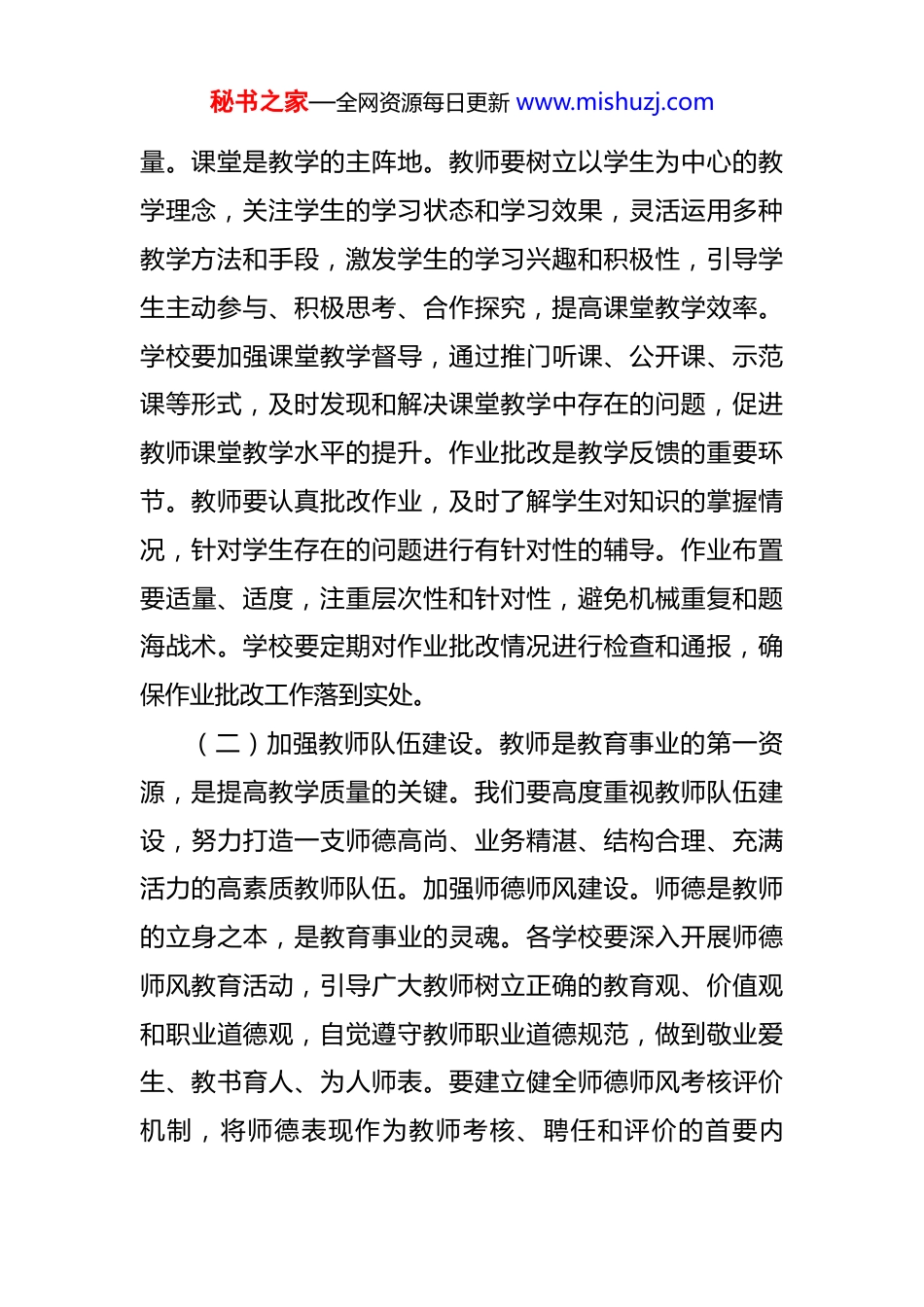 秘书之家—全网资源每日更新 www.mishuzj.com县教育局局长在开学初工作部署会议上的讲话 老师们:我们共同谋划新学期的工作,明确目标,凝聚力量,为全县教育事业的发展开好局、起好步。新学期,新起点,新征程,我们要以更加饱满的热情、更加昂扬的斗志、更加务实的作风,推动全县教育事业再上新台阶。下面,我就新学期的工作讲几点意见。一、聚焦教学质量提升,筑牢教育发展根基教学质量是教育的生命线,是学校生存和发展的核心要素。提升教学质量,是我们教育工作者永恒的追求和不懈的使命。在新学期,要从以下几个方面着手,全力提升教学质量。(一)强化教学常规管理。教学常规是教学工作的基本规范,是提高教学质量的基础保障。各学校要进一步健全教学常规管理制度,加强对备课、上课、作业批改、辅导、考试等各个环节的精细化管理。备课是教学的前提和基础。教师要深入研究教材和教学大纲,结合学生的实际情况,精心设计教学方案,做到目标明确、重点突出、难点突破、方法得当。学校要定期组织备课检查和评比活动,鼓励教师之间相互交流、相互学习,共同提高备课质秘书之家—全网资源每日更新 www.mishuzj.com量。课堂是教学的主阵地。教师要树立以学生为中心的教学理念,关注学生的学习状态和学习效果,灵活运用多种教学方法和手段,激发学生的学习兴趣和积极性,引导学生主动参与、积极思考、合作探究,提高课堂教学效率。学校要加强课堂教学督导,通过推门听课、公开课、示范课等形式,及时发现和解决课堂教学中存在的问题,促进教师课堂教学水平的提升。作业批改是教学反馈的重要环节。教师要认真批改作业,及时了解学生对知识的掌握情况,针对学生存在的问题进行有针对性的辅导。作业布置要适量、适度,注重层次性和针对性,避免机械重复和题海战术。学校要定期对作业批改情况进行检查和通报,确保作业批改工作落到实处。(二)加强教师队伍建设。教师是教育事业的第一资源,是提高教学质量的关键。我们要高度重视教师队伍建设,努力打造一支师德高尚、业务精湛、结构合理、充满活力的高素质教师队伍。加强师德师风建设。师德是教师的立身之本,是教育事业的灵魂。各学校要深入开展师德师风教育活动,引导广大教师树立正确的教育观、价值观和职业道德观,自觉遵守教师职业道德规范,做到敬业爱生、教书育人、为人师表。要建立健全师德师风考核评价机制,将师德表现作为教师考核、聘任和评价的首要内秘书之家—全网资源每日更新 www.mishuzj.com容,对违反师德师风的行为实行“一票否决制”。加大教师培训力度。要根据教师的不同需求和发展阶段,制定个性化的培训方案,为教师提供多样化的培训机会。通过开展校本培训、集中培训、网络培训、外出学习交流等活动,拓宽教师的视野,更新教师的教育观念,提高教师的业务水平和教学能力。鼓励教师参加学历提升教育和各类专业竞赛活动,促进教师的专业成长。完善教师激励机制。要建立健全科学合理的教师激励机制,充分调动广大教师的工作积极性和主动性。对在教学工作中表现优秀、成绩突出的教师,要给予表彰和奖励,在职称评定、岗位晋升、评优评先等方面予以倾斜。要关心教师的工作和生活,为教师解决实际困难,让教师能够安心从教、热心从教。(三)推进教育教学改革。教育教学改革是提高教学质量的动力源泉。要积极适应新时代教育发展的要求,深入推进教育教学改革,探索适合县教育实际的教学模式和方法。深化课程改革。要严格按照国家课程方案和课程标准开齐开足开好各类课程,加强地方课程和校本课程的开发与实施,丰富课程资源,满足学生多样化的学习需求。要注重课程的整合与融合,加强学科之间的联系和渗透,培养学生的综合素养和创新能力。创新教学方法。要积极秘书之家—全网资源每日更新 www.mishuzj.com推广启发式、探究式、讨论式、参与式等教学方法,引导学生自主学习、合作学习、探究学习,培养学生的自主学习能力和创新精神。要充分利用现代信息技术手段,推进信息技术与教育教学的深度融合,探索线上线下相结合的混合式教学模式,提高教学效果和教学质量。加强教学研究。要建立健全教学研究机制,鼓励...