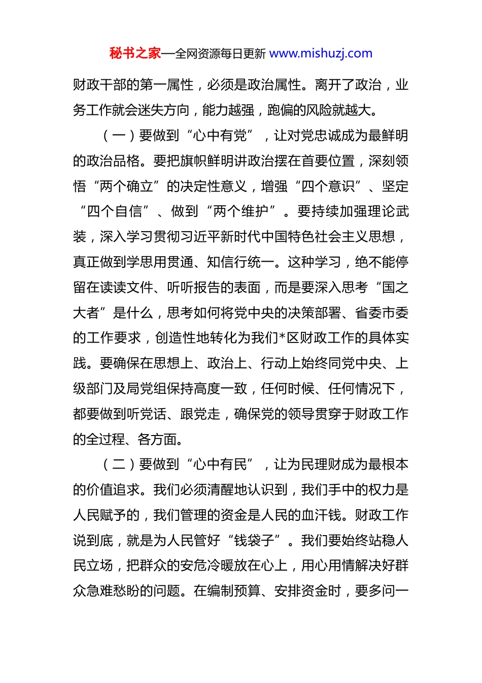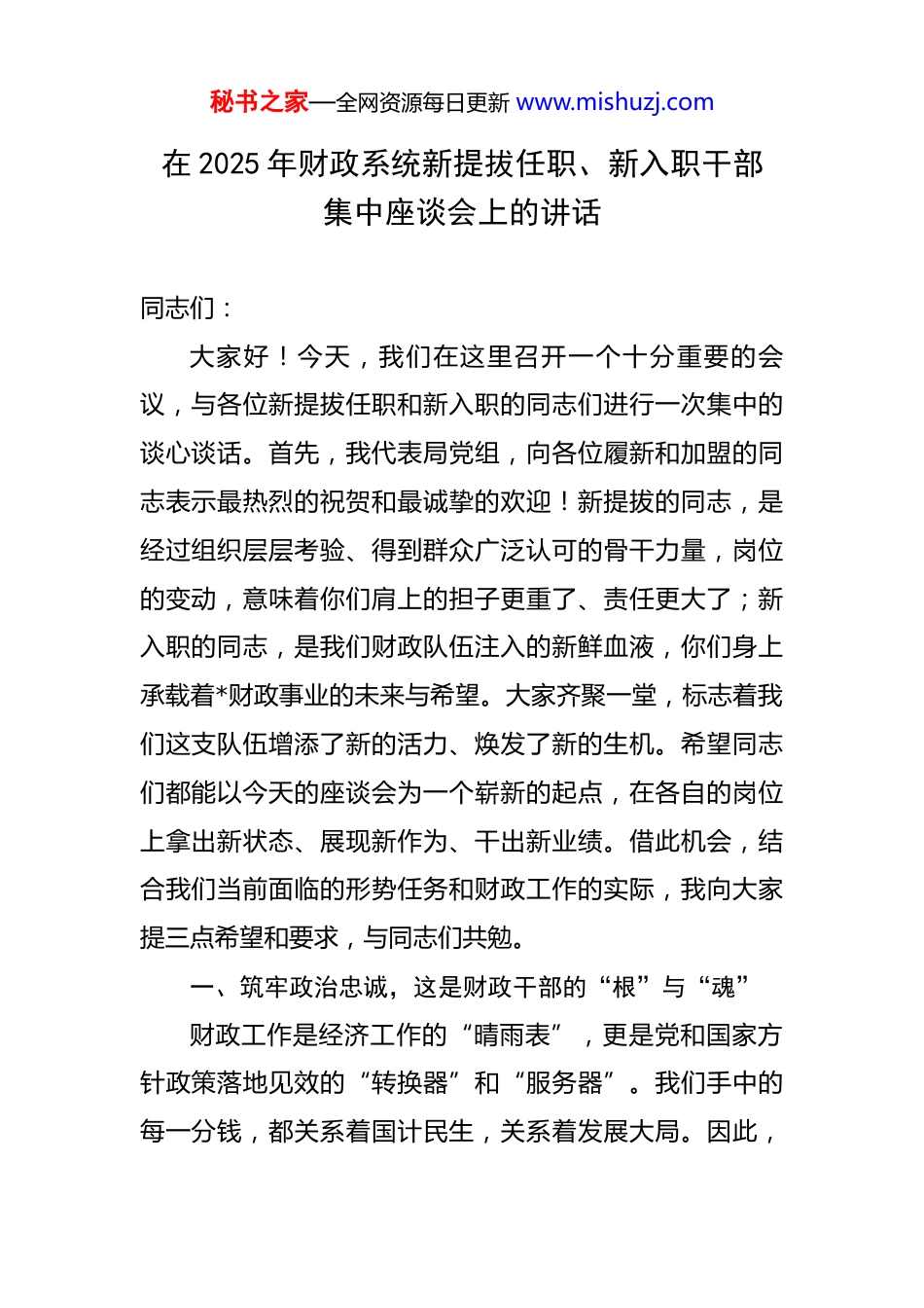 秘书之家—全网资源每日更新 www.mishuzj.com在 2025 年财政系统新提拔任职、新入职干部集中座谈会上的讲话 同志们:大家好!今天,我们在这里召开一个十分重要的会议,与各位新提拔任职和新入职的同志们进行一次集中的谈心谈话。首先,我代表局党组,向各位履新和加盟的同志表示最热烈的祝贺和最诚挚的欢迎!新提拔的同志,是经过组织层层考验、得到群众广泛认可的骨干力量,岗位的变动,意味着你们肩上的担子更重了、责任更大了;新入职的同志,是我们财政队伍注入的新鲜血液,你们身上承载着*财政事业的未来与希望。大家齐聚一堂,标志着我们这支队伍增添了新的活力、焕发了新的生机。希望同志们都能以今天的座谈会为一个崭新的起点,在各自的岗位上拿出新状态、展现新作为、干出新业绩。借此机会,结合我们当前面临的形势任务和财政工作的实际,我向大家提三点希望和要求,与同志们共勉。一、筑牢政治忠诚,这是财政干部的“根”与“魂”财政工作是经济工作的“晴雨表”,更是党和国家方针政策落地见效的“转换器”和“服务器”。我们手中的每一分钱,都关系着国计民生,关系着发展大局。因此,秘书之家—全网资源每日更新 www.mishuzj.com财政干部的第一属性,必须是政治属性。离开了政治,业务工作就会迷失方向,能力越强,跑偏的风险就越大。(一)要做到“心中有党”,让对党忠诚成为最鲜明的政治品格。要把旗帜鲜明讲政治摆在首要位置,深刻领悟“两个确立”的决定性意义,增强“四个意识”、坚定“四个自信”、做到“两个维护”。要持续加强理论武装,深入学习贯彻习近平新时代中国特色社会主义思想,真正做到学思用贯通、知信行统一。这种学习,绝不能停留在读读文件、听听报告的表面,而是要深入思考“国之大者”是什么,思考如何将党中央的决策部署、省委市委的工作要求,创造性地转化为我们*区财政工作的具体实践。要确保在思想上、政治上、行动上始终同党中央、上级部门及局党组保持高度一致,任何时候、任何情况下,都要做到听党话、跟党走,确保党的领导贯穿于财政工作的全过程、各方面。(二)要做到“心中有民”,让为民理财成为最根本的价值追求。我们必须清醒地认识到,我们手中的权力是人民赋予的,我们管理的资金是人民的血汗钱。财政工作说到底,就是为人民管好“钱袋子”。我们要始终站稳人民立场,把群众的安危冷暖放在心上,用心用情解决好群众急难愁盼的问题。在编制预算、安排资金时,要多问一秘书之家—全网资源每日更新 www.mishuzj.com问,这笔钱花出去,老百姓能不能得到真正的实惠?在执行政策、提供服务时,要多想一想,我们的工作方式,群众满不满意、方不方便?要坚持公共财政的性质,优化支出结构,持续加大对教育、医疗、社保、就业等民生领域的投入,全力支持城乡融合发展,让改革发展的成果更多、更公平地惠及全体人民,用我们的“辛苦指数”换取人民群众的“幸福指数”。(三)要做到“心中有责”,让服务大局成为最自觉的使命担当。财政是国家治理的基础和重要支柱。我们不能仅仅把自己看作是“账房先生”,埋头于收收支支的琐碎事务。必须跳出财政看财政,立足全区发展大局谋划工作。当前,我们正处在推动高质量发展的关键时期,面临着诸多机遇和挑战。这就要求我们必须发挥好财政的职能作用,落实好积极的财政政策。我们要集中财力支持现代化产业体系建设,通过有效的财政政策工具,引导和激励更多社会资本投向实体经济、小微企业和创新型产业。我们要精准发力,扩大有效需求,为经济持续回升向好提供坚实支撑。我们还要强化底线思维,积极稳妥防范化解政府债务风险,确保财政安全平稳运行。每一名财政干部,都要将自己的工作放到全区经济社会发展的大棋盘中去考量,确保我们的每一项财政政策的执行、每一笔财政资金秘书之家—全网资源每日更新 www.mishuzj.com的使用,都与区委区政府的中心工作同频共振、同向发力。二、练就过硬本领,这是财政干部的“基”与“石”新岗位意味着新任务,新征程呼唤新本领。面对新形势下的财政挑战,知识和能力的储备显得尤为重要。如果说政治忠诚是方向,那么履职能力就是我们抵达目的地的桥...