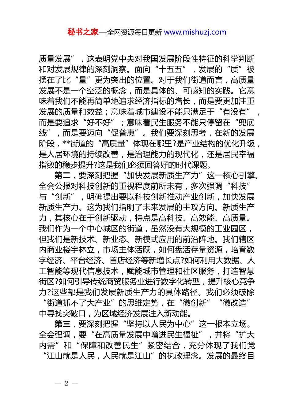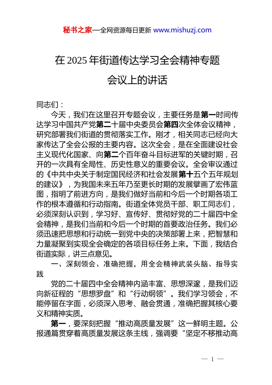 秘书之家—全网资源每日更新 www.mishuzj.com在 2025 年街道传达学习全会精神专题会议上的讲话同志们:今天,我们在这里召开专题会议,主要任务是第一时间传达学习中国共产党第二十届中央委员会第四次全体会议精神,研究部署我们街道的贯彻落实工作。刚才,相关同志已经向大家传达了全会公报的主要内容。这次全会,是在全面建设社会主义现代化国家、向第二个百年奋斗目标进军的关键时期,召开的一次具有全局性、历史性意义的重要会议。全会审议通过的《中共中央关于制定国民经济和社会发展第十五个五年规划的建议》,为我国未来五年乃至更长时期的发展擘画了宏伟蓝图,指明了前进方向,是我们做好当前和今后一个时期各项工作的根本遵循和行动指南。街道全体党员干部、职工同志们,必须深刻认识到,学习好、宣传好、贯彻好党的二十届四中全会精神,是我们当前和今后一个时期的首要政治任务。我们必须迅速把思想和行动统一到党中央的决策部署上来,把智慧和力量凝聚到实现全会确定的各项目标任务上来。下面,我结合街道实际,讲三点意见。一、深刻领会、准确把握,用全会精神武装头脑、指导实践党的二十届四中全会精神内涵丰富、思想深邃,是我们迈向新征程的“思想罗盘”和“行动纲领”。我们学习领会,不能停留在字面,必须深入思考、融会贯通,准确把握其核心要义和精神实质。第一,要深刻把握“推动高质量发展”这一鲜明主题。公报通篇贯穿着高质量发展这条主线,强调要“坚定不移推动高— 1 —秘书之家—全网资源每日更新 www.mishuzj.com质量发展”,这表明党中央对我国发展阶段性特征的科学判断和对发展规律的深刻洞察。面向“十五五”,发展的“质”被摆在了比“量”更为突出的位置。对于我们街道而言,高质量发展不是一个空泛的概念,而是具体的、可感知的实践。它意味着我们不能再简单地追求经济指标的增长,而是要更加注重发展的质量和效益;意味着城市建设不能只满足于“有没有”,而是要追求“好不好”;意味着民生服务不能只停留在“兜底线”,而是要迈向“促普惠”。我们要深刻思考,在新的发展阶段,**街道的“高质量”体现在哪里?是产业结构的优化升级,是人居环境的持续改善,是治理能力的现代化,还是居民幸福指数的稳步提升?这是我们必须回答好的时代课题。第二,要深刻把握“加快发展新质生产力”这一核心引擎。全会公报对科技创新的重视程度前所未有,多次强调“科技”与“创新”,明确提出要以科技创新推动产业创新,加快发展新质生产力。这为我们指明了未来发展的主攻方向。新质生产力,其核心在于创新驱动,特点是高科技、高效能、高质量。我们作为一个中心城区的街道,虽然没有大规模的工业园区,但我们是新技术、新业态、新模式应用的前沿阵地。我们辖区内商业楼宇林立,市场主体活跃,如何盘活存量资源,培育数字经济、平台经济、首店经济等新增长点?如何利用大数据、人工智能等现代信息技术,赋能城市管理和社区服务,打造智慧街区?如何引导传统商贸服务业进行数字化转型,提升核心竞争力?这些都是我们发展新质生产力的具体路径。我们必须破除“街道抓不了大产业”的思维定势,在“微创新”“微改造”中寻找突破口,为区域经济发展注入新动能。第三,要深刻把握“坚持以人民为中心”这一根本立场。全会强调,要“在高质量发展中增进民生福祉”,并将“扩大内需”和“保障和改善民生”紧密结合,充分体现了我们党“江山就是人民,人民就是江山”的执政理念。发展的最终目— 2 —秘书之家—全网资源每日更新 www.mishuzj.com的是为了人民幸福。过去几年,我们街道在老旧小区改造、公共设施完善、困难群体帮扶等方面做了大量工作,取得了一定成效。但我们必须清醒地看到,与人民群众对美好生活的新期待相比,我们的工作还有不少差距。比如,普惠性养老托育服务供给是否充足?“15 分钟社区生活圈”的功能是否完备?群众反映强烈的物业管理、停车难、环境卫生等问题是否得到根本性解决?全会精神为我们指明了方向,就是要坚持问题导向,把群众的“表情包”作为我们工作的“风向标”,把群众的“需求单”变成我们的“任务书”,用心用情用力解决好群...