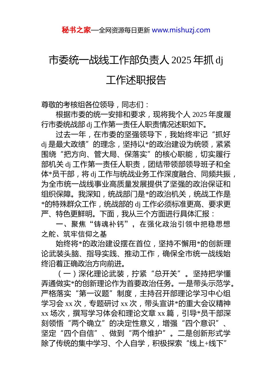 秘书之家—全网资源每日更新 www.mishuzj.com市委统一战线工作部负责人 2025 年抓 dj工作述职报告尊敬的考核组各位领导,同志们:根据市委的统一安排和要求,现将我个人 2025 年度履行市委统战部 dj 工作第一责任人职责情况述职如下。过去一年,在市委的坚强领导下,我始终牢记“抓好dj 是最大政绩”的理念,坚持以*的政治建设为统领,紧紧围绕“把方向、管大局、保落实”的核心职能,切实履行部机关 dj 工作第一责任人职责,团结带领部领导班子和全体*员干部,将 dj 工作与统战业务工作深度融合、同频共振,为全市统一战线事业高质量发展提供了坚强的政治保证和组织保障。我深知,统战部门是*的政治机关,统战工作是*的特殊群众工作,统战部的 dj 工作必须标准更高、要求更严、特色更鲜明。下面,我从三个方面进行具体汇报:一、聚焦“铸魂补钙”,在强化政治引领中把稳思想之舵、筑牢信仰之基始终将*的政治建设摆在首位,坚持不懈用*的创新理论武装头脑、指导实践、推动工作,确保全市统一战线始终沿着正确政治方向前进。(一)深化理论武装,拧紧“总开关”。坚持把学懂弄通做实*的创新理论作为首要政治任务。一是带头示范学。严格落实“第一议题”制度,主持召开部理论学习中心组学习会 xx 次,专题研讨 xx 次,带头宣讲*的重大会议精神xx 场次,撰写学习体会和理论文章 xx 篇,引导*员干部深刻领悟“两个确立”的决定性意义,增强“四个意识”、坚定“四个自信”、做到“两个维护”。二是创新形式学除了传统的集中学习、个人自学,积极探索“线上+线下”秘书之家—全网资源每日更新 www.mishuzj.com“课堂+现场”“研讨+实践”相结合的学习模式。组织举办“同心大讲堂”xx 期,邀请专家学者和先进典型授课;依托本地红色教育资源,开展“追寻红色足迹、凝聚统战力量”主题*日活动 xx 次;利用“学习强国”、干部网络学院等平台,实现学习全覆盖、不断线。三是联系实际学。坚持问题导向,将学习*的创新理论特别是关于做好新时代*的统一战线工作的重要思想,与破解统战工作重点难点问题紧密结合。围绕“如何加强新时代民营经济统战工作”“如何引导新的社会阶层人士发挥作用”等课题开展调研式学习,形成高质量调研报告 xx 篇,推动学习成果转化为谋划工作的思路、促进工作的举措。(二)严守政治规矩,筑牢“压舱石”。始终把讲政治、守规矩作为第一要求。一是严肃*内政治生活。严格执行《关于新形势下*内政治生活的若干准则》,高质量召开年度民主生活会和组织生活会,带头开展批评和自我批评让“红脸出汗”成为常态。严格落实“三会一课”、民主评议*员、谈心谈话等制度,全年主持召开支部*员大会 xx次,讲专题*课 xx 次,与班子成员、科室负责人及普通*员开展谈心谈话 xx 人次,及时掌握思想动态,化解苗头性问题。二是严明政治纪律和政治规矩。教育引导全体*员干部时刻绷紧政治纪律这根弦,牢记“五个必须”,坚决防止“七个有之”。加强对部机关各类会议、文件、活动的政治把关,确保在任何时候、任何情况下都同*中央保持高度一致。三是压实意识形态责任。深刻认识统一战线领域意识形态工作的复杂性和敏感性,定期分析研判意识形态领域风险,特别是密切关注民族、**、涉疆涉藏、涉港澳台海外等领域的舆情动态。加强对统战系统网站、微信公众号、内部刊物等阵地的建设和管理,旗帜鲜明反对和抵制各种错误思潮,牢牢掌握统战领域意识形态工作领导权。(三)凝聚思想共识,画大“同心圆”。将 dj 工作凝聚人心的优势转化为团结引领*外人士的强大力量。一是强秘书之家—全网资源每日更新 www.mishuzj.com化政治共识教育。将学习贯彻*的创新理论和重大决策部署作为各类*外人士培训班、座谈会、情况通报会的核心内容,全年组织面向*外人士的专题学习、国情考察、主题实践等活动 xx 余场,覆盖 xxx 余人次,引导广大统战成员不断增进对中国共产*和中国特色社会主义的政治认同、思想认同、理论认同、情感认同。二是创新思想政治工作方式。针对不同统战对象特点,采取“一把钥匙开一把锁”的方式。对民主*派成员和无*派人士,注重历史传统...