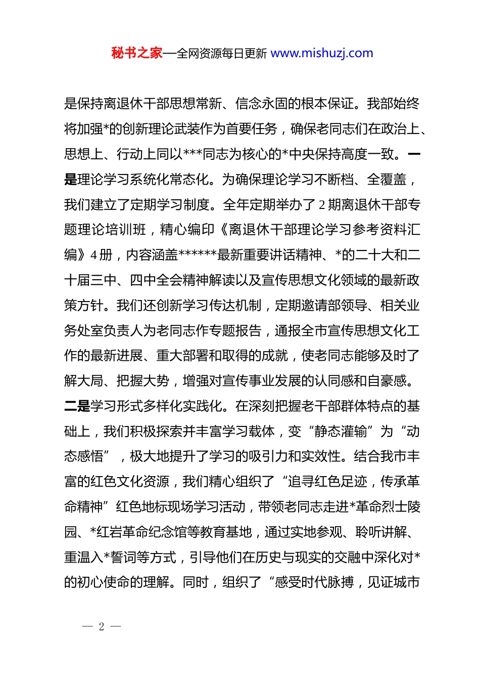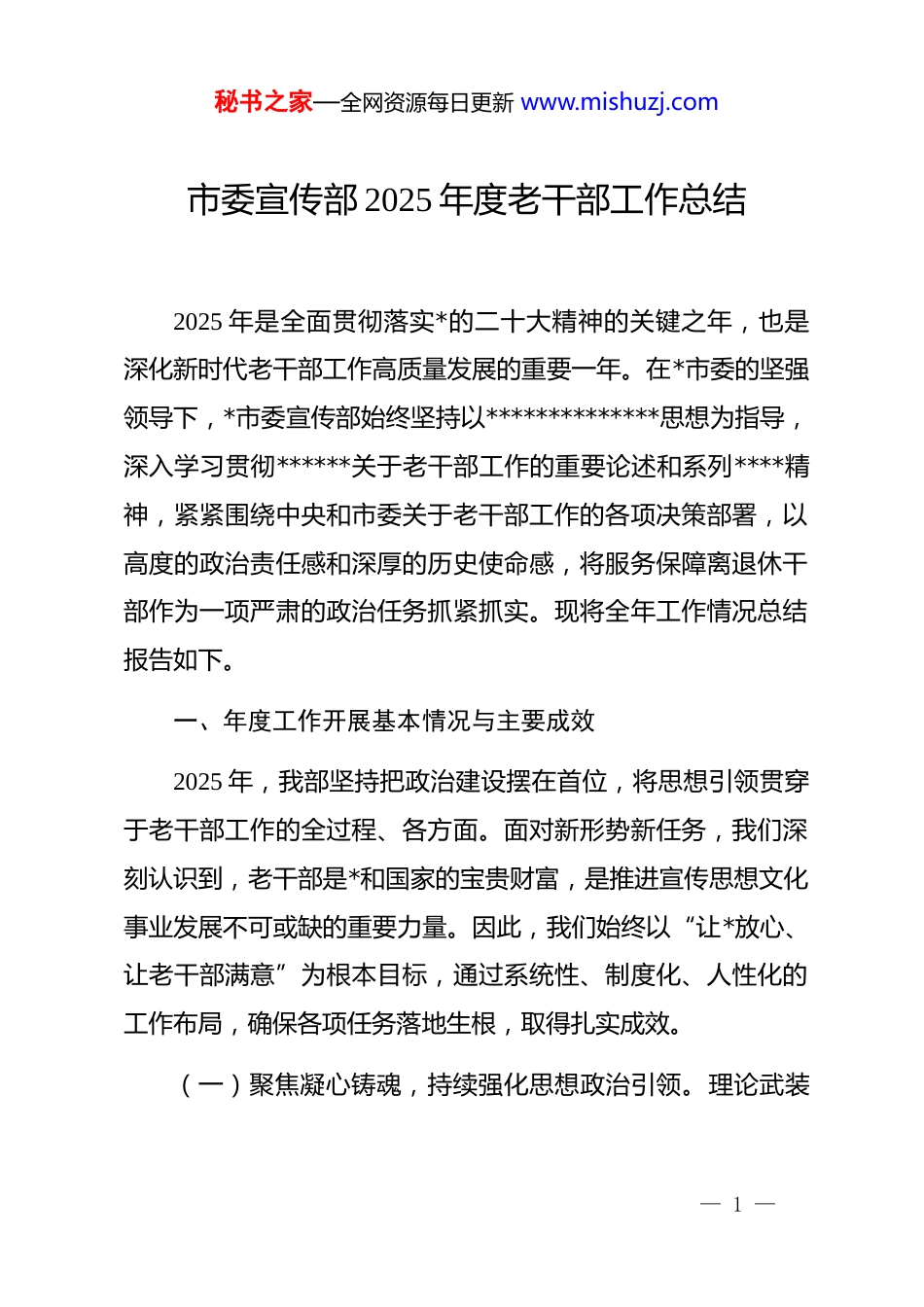 秘书之家—全网资源每日更新 www.mishuzj.com市委宣传部 2025 年度老干部工作总结2025 年是全面贯彻落实*的二十大精神的关键之年,也是深化新时代老干部工作高质量发展的重要一年。在*市委的坚强领导下,*市委宣传部始终坚持以**************思想为指导,深入学习贯彻******关于老干部工作的重要论述和系列****精神,紧紧围绕中央和市委关于老干部工作的各项决策部署,以高度的政治责任感和深厚的历史使命感,将服务保障离退休干部作为一项严肃的政治任务抓紧抓实。现将全年工作情况总结报告如下。一、年度工作开展基本情况与主要成效2025 年,我部坚持把政治建设摆在首位,将思想引领贯穿于老干部工作的全过程、各方面。面对新形势新任务,我们深刻认识到,老干部是*和国家的宝贵财富,是推进宣传思想文化事业发展不可或缺的重要力量。因此,我们始终以“让*放心、让老干部满意”为根本目标,通过系统性、制度化、人性化的工作布局,确保各项任务落地生根,取得扎实成效。(一)聚焦凝心铸魂,持续强化思想政治引领。理论武装— 1 —秘书之家—全网资源每日更新 www.mishuzj.com是保持离退休干部思想常新、信念永固的根本保证。我部始终将加强*的创新理论武装作为首要任务,确保老同志们在政治上、思想上、行动上同以***同志为核心的*中央保持高度一致。一是理论学习系统化常态化。为确保理论学习不断档、全覆盖,我们建立了定期学习制度。全年定期举办了 2 期离退休干部专题理论培训班,精心编印《离退休干部理论学习参考资料汇编》4 册,内容涵盖******最新重要讲话精神、*的二十大和二十届三中、四中全会精神解读以及宣传思想文化领域的最新政策方针。我们还创新学习传达机制,定期邀请部领导、相关业务处室负责人为老同志作专题报告,通报全市宣传思想文化工作的最新进展、重大部署和取得的成就,使老同志能够及时了解大局、把握大势,增强对宣传事业发展的认同感和自豪感。二是学习形式多样化实践化。在深刻把握老干部群体特点的基础上,我们积极探索并丰富学习载体,变“静态灌输”为“动态感悟”,极大地提升了学习的吸引力和实效性。结合我市丰富的红色文化资源,我们精心组织了“追寻红色足迹,传承革命精神”红色地标现场学习活动,带领老同志走进*革命烈士陵园、*红岩革命纪念馆等教育基地,通过实地参观、聆听讲解、重温入*誓词等方式,引导他们在历史与现实的交融中深化对*的初心使命的理解。同时,组织了“感受时代脉搏,见证城市— 2 —秘书之家—全网资源每日更新 www.mishuzj.com变迁”观摩考察活动,赴*新区、*高新技术产业开发区等地,让老同志亲身感受新时代我市经济社会发展的巨大成就和蓬勃生机。此外,我们还将理论学习与主题*日活动紧密结合,开展“实践学”活动,确保理论学习入脑入心、见行见效,有效引导了广大老同志不断增强“四个意识”、坚定“四个自信”、做到“两个维护”,筑牢了信仰之基、补足了精神之钙、把稳了思想之舵。三是服务保障精准化精细化。我们始终将老干部的冷暖放在心上,用心用情用力做好服务保障工作。建立老干部健康档案,定期组织健康体检,邀请专家为老干部举办健康讲座,提供个性化的健康指导。针对老干部生活中的实际困难,及时协调相关部门予以解决,为老干部发放困难补助、慰问品等,让老干部感受到组织的关怀和温暖。同时,积极搭建老干部发挥余热的平台,根据老干部的专业特长和兴趣爱好,组织他们参与关心下一代工作、社区志愿服务等活动,让老干部在奉献中实现自身价值,进一步丰富了老干部的精神文化生活。(二)聚焦固本强基,全面夯实基层组织建设。离退休干部*支部是*联系服务老同志的桥梁和纽带,是确保*的路线方针政策在老干部中得到贯彻落实的战斗堡垒。我部高度重视离退休干部*组织的建设工作,着力增强其政治功能和组织功能。一— 3 —秘书之家—全网资源每日更新 www.mishuzj.com是优化组织设置,建强支部班子。根据《中国共产*支部工作条例(试行)》等*内法规,我们对离退休干部*支部进行了规范化调整和设置。在充分征求老同志意见的基础上,遵循“家庭居住相近、志趣爱好相投、参与活...