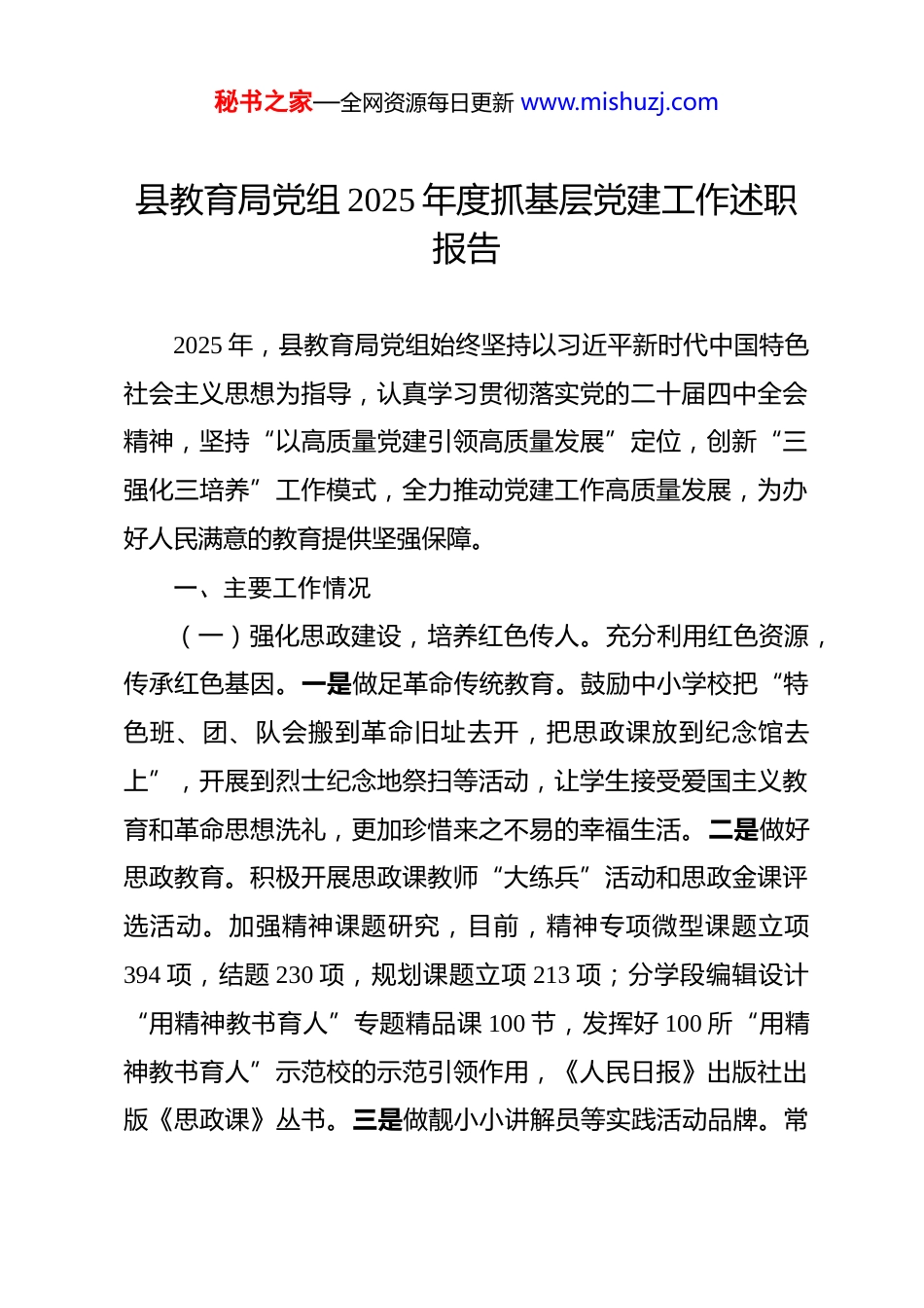 秘书之家—全网资源每日更新 www.mishuzj.com县教育局党组 2025 年度抓基层党建工作述职报告 2025 年,县教育局党组始终坚持以习近平新时代中国特色社会主义思想为指导,认真学习贯彻落实党的二十届四中全会精神,坚持“以高质量党建引领高质量发展”定位,创新“三强化三培养”工作模式,全力推动党建工作高质量发展,为办好人民满意的教育提供坚强保障。一、主要工作情况(一)强化思政建设,培养红色传人。充分利用红色资源,传承红色基因。一是做足革命传统教育。鼓励中小学校把“特色班、团、队会搬到革命旧址去开,把思政课放到纪念馆去上”,开展到烈士纪念地祭扫等活动,让学生接受爱国主义教育和革命思想洗礼,更加珍惜来之不易的幸福生活。二是做好思政教育。积极开展思政课教师“大练兵”活动和思政金课评选活动。加强精神课题研究,目前,精神专项微型课题立项394 项,结题 230 项,规划课题立项 213 项;分学段编辑设计“用精神教书育人”专题精品课 100 节,发挥好 100 所“用精神教书育人”示范校的示范引领作用,《人民日报》出版社出版《思政课》丛书。三是做靓小小讲解员等实践活动品牌。常秘书之家—全网资源每日更新 www.mishuzj.com态化开展读红色经典、唱红色歌曲、讲红色故事、访红色足迹等系列教育实践活动,形成了“精神讲习社”“精神小小讲解团”等一批鲜活新颖的红色主题实践活动品牌。延职附小精神红领巾讲解团(集体)入选全国“新时代好少年”。(二)强化队伍建设,培养履职能人。坚持党建引领,促进教育高质量发展。一是积极开展“党建+业务”系列活动。局机关组织开展“学思践悟守初心立足岗位作贡献”暨“我的业务我来讲”主题活动 5 次,实现作风建设与业务能力双提升;局属各单位(学校)开展“业务大比拼”和“教学大比武”活动 6 次,以党建提业务,以业务促党建,推动党建业务深度融合。二是积极开展“双培养”工作。按照“一选二带三培养”要求,今年以来,全县教育系统在业务骨干中培养入党积极分子 257 名,党员 16 名,在党员中培养业务骨干 79 名,特别是党员教师单婷获评全国优秀教师称号。三是积极开展“三亮三比三评”活动。在党员中开展亮身份、亮职责、亮承诺,比业绩、比创新、比服务,党委综评、支部考评、党员互评,作为评优晋级的重要参考,充分激发党员干事创业信心。目前,教育系统党员假期提前进入岗位,形成吃苦强、作风硬、比学赶超的氛围。四是积极开展教育家精神铸魂强师行动。向“时代楷模”张桂梅学习,两次组织赴华坪女高考察,学习借鉴“党秘书之家—全网资源每日更新 www.mishuzj.com建统领教学、革命传统立校、红色文化育人”的办学特色,与丽江县签订《教育合作交流协议》,向县委提交《关于弘扬践行教育家精神工作开展情况的报告》获得充分肯定。(三)强化五育并举,培养时代新人。坚持为党育人、为国育才的理念,强化五育并举,落实立德树人根本任务。一是开展爱国主义教育等凸显德育为先。通过升国旗、唱国歌、国旗下演讲、国防教育等一系列活动,厚植学生爱国主义情怀,引导学生立报国强国大志向、做挺膺担当奋斗者。建成中小学党史国史教育基地 126 个,研学实践教育基地 53 个,全国国防教育示范校 6 所。二是开展综合改革凸显智育为基。统筹推进“双减”和教育教学质量提升,纵深推进教育综合改革,多措并举扩大高中招生规模,录取比例达到 79.7%,有 6 个县达到80%以上。新高考首考平稳顺利,成绩明显提升,得到了各级领导的充分肯定。6 所职业中学申报国家教育评价改革试点项目,6 月 12 日成功召开全县教育集团化办学现场会。三是开展阳光大课间等凸显体育为重。全县义务教育学校全面实施课间15 分钟、每天一节体育课,确保每天体育活动不少于 2 小时,遴选 31 个“活力大课间”典型案例参加省级评选,举办校园篮球、足球、排球联赛,创建全国校园足球特色学校 12 所。学生身心健康显著改善,肥胖率、近视率下降明显,校园事故率较秘书之家—全网资源每日更新 www.mishuzj.com上年降低 61%。四是开展非遗进校园等凸显美育为要。大力推进民歌、剪...