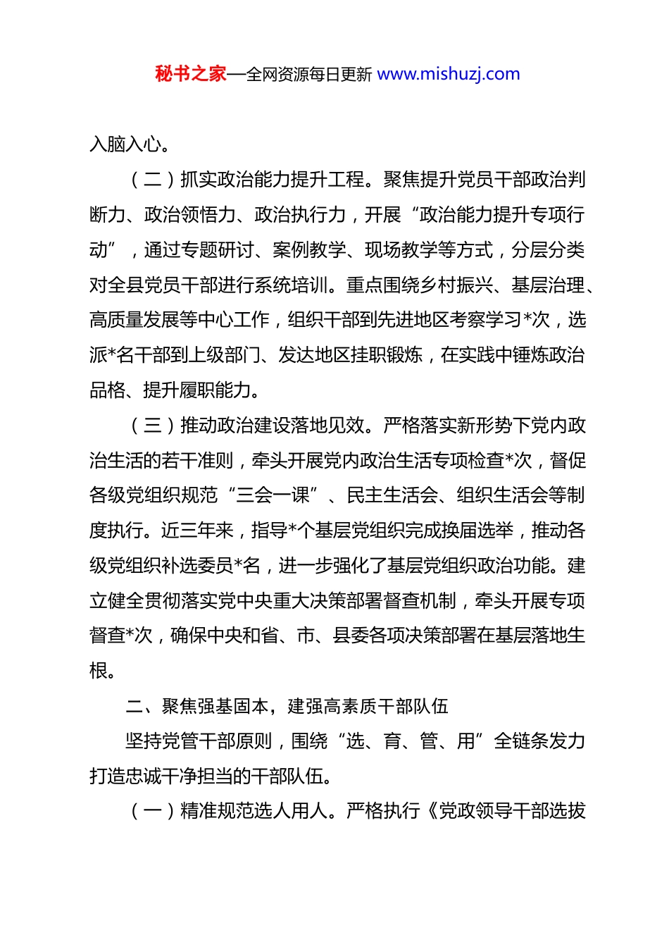 秘书之家—全网资源每日更新 www.mishuzj.com县委组织部长近三年工作总结 近三年来,在市委组织部的精心指导和县委的坚强领导下我始终坚持以习近平新时代中国特色社会主义思想为指导,深入学习贯彻党的二十大及二十届一中、二中、三中、四中全会精神,全面落实新时代党的建设总要求和新时代党的组织路线,聚焦主责主业、强化担当作为,统筹推进干部队伍建设、基层党组织建设、人才队伍建设等各项工作,为全县经济社会高质量发展提供了坚强组织保障。现将近三年履职情况总结如下:一、强化政治引领,筑牢思想建设根基始终把党的政治建设摆在首位,以强化理论武装为抓手,推动全县各级党组织和党员干部坚定拥护“两个确立”、坚决做到“两个维护”。(一)深化理论武装体系建设。牵头制定全县党员干部理论学习计划,建立“第一议题”常态化学习机制,组织各级党组织深入学习习近平新时代中国特色社会主义思想、习近平总书记关于党的建设的重要思想及系列重要指示批示精神。近三年来,共组织县委理论学习中心组专题学习*次,举办县管干部专题培训班*期,培训干部*余人次;开展“送学上门”“线上课堂”等活动*场次,覆盖基层党员*余人,推动党的创新理论秘书之家—全网资源每日更新 www.mishuzj.com入脑入心。(二)抓实政治能力提升工程。聚焦提升党员干部政治判断力、政治领悟力、政治执行力,开展“政治能力提升专项行动”,通过专题研讨、案例教学、现场教学等方式,分层分类对全县党员干部进行系统培训。重点围绕乡村振兴、基层治理、高质量发展等中心工作,组织干部到先进地区考察学习*次,选派*名干部到上级部门、发达地区挂职锻炼,在实践中锤炼政治品格、提升履职能力。(三)推动政治建设落地见效。严格落实新形势下党内政治生活的若干准则,牵头开展党内政治生活专项检查*次,督促各级党组织规范“三会一课”、民主生活会、组织生活会等制度执行。近三年来,指导*个基层党组织完成换届选举,推动各级党组织补选委员*名,进一步强化了基层党组织政治功能。建立健全贯彻落实党中央重大决策部署督查机制,牵头开展专项督查*次,确保中央和省、市、县委各项决策部署在基层落地生根。二、聚焦强基固本,建强高素质干部队伍坚持党管干部原则,围绕“选、育、管、用”全链条发力打造忠诚干净担当的干部队伍。(一)精准规范选人用人。严格执行《党政领导干部选拔秘书之家—全网资源每日更新 www.mishuzj.com任用工作条例》,建立健全干部选拔任用“凡提四必”机制,近三年来,共调整配备县管干部*批次*人,其中提拔重用*人、平职调整*人、交流轮岗*人。注重在乡村振兴、项目建设、应急处突等一线考察识别干部,选拔*名表现突出的干部到关键岗位任职,树立了“重实干、重实绩、重担当”的用人导向。顺利完成县乡两级领导班子换届工作,换届过程风清气正,新班子结构进一步优化,战斗力显著提升。(二)系统推进干部培育。构建“源头培养、跟踪培养、全程培养”的干部培育体系,实施年轻干部“育苗计划”,选拔*名 35 岁以下优秀年轻干部纳入后备干部库,建立“一对一”导师帮带机制。针对干部知识短板、能力弱项,开展“精准滴灌”式培训,举办乡村振兴、招商引资、应急管理等专题培训班*期,培训干部*余人次;组织*名年轻干部到基层一线、艰苦岗位历练,提升解决实际问题的能力。(三)从严加强干部管理。健全干部日常监督管理机制,落实谈心谈话、提醒函询诫勉等制度,近三年来,共开展谈心谈话*人次,发出提醒函*份、诫勉谈话*人。加强对领导干部八小时外的监督,建立干部监督信息共享机制,收集整合纪检监察、审计、信访等方面信息*条,对*名存在苗头性、倾向性问题的干部及时提醒纠正。严格执行干部考核评价机制,优化考秘书之家—全网资源每日更新 www.mishuzj.com核指标体系,将考核结果与干部选拔任用、评优评先、绩效奖励挂钩,充分发挥考核“指挥棒”作用。三、深耕基层治理,提升基层党建工作质效坚持大抓基层的鲜明导向,以提升组织力为重点,推动基层党组织全面进步、全面过硬。(一)筑牢农村党建根基。深入学习运用“千万工程”经验,实施“党建引领乡村振兴...
