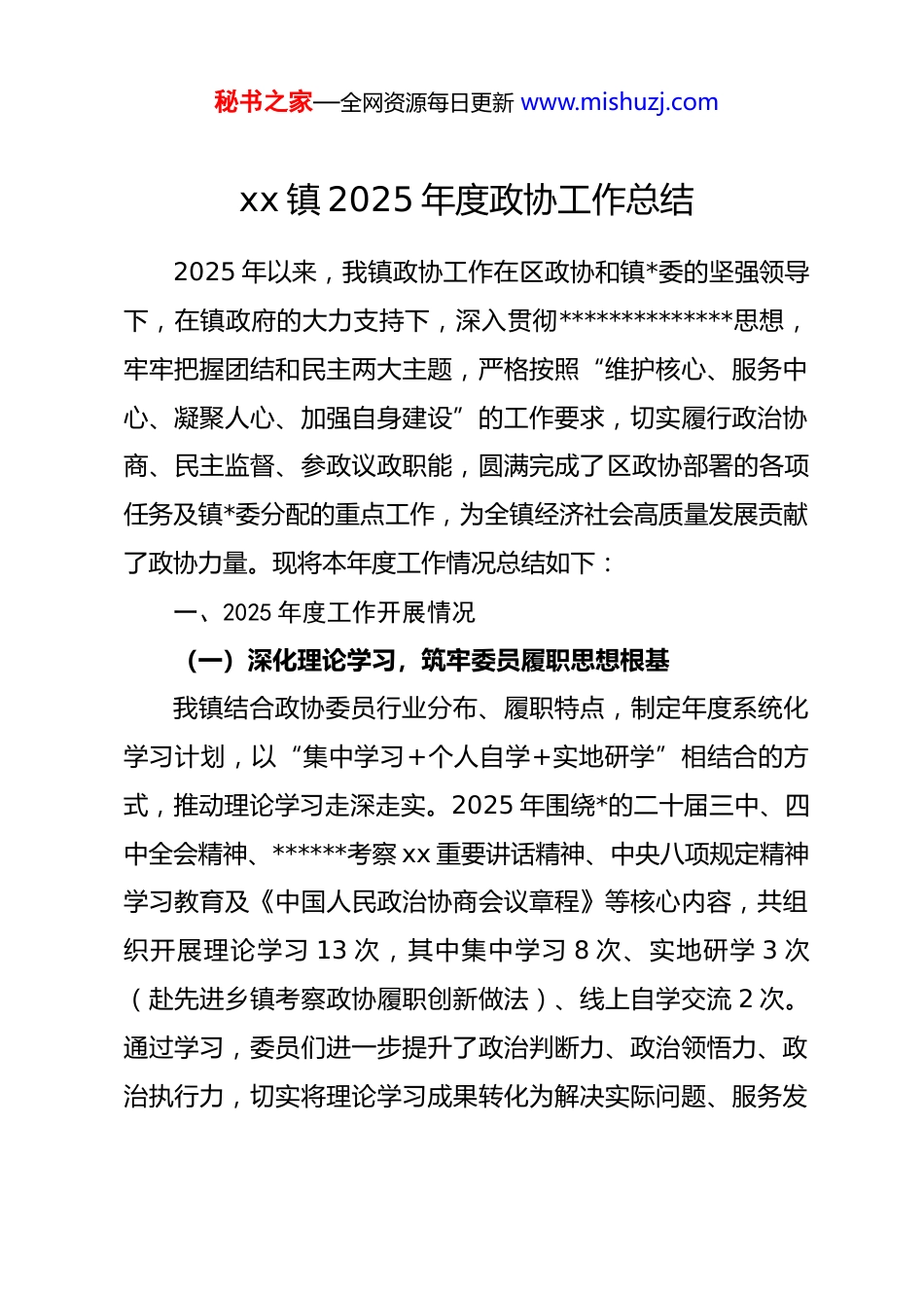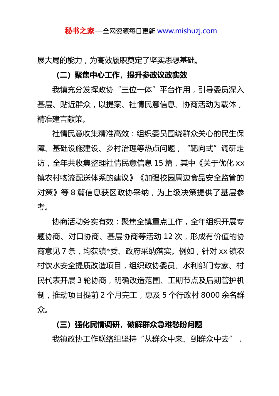 秘书之家—全网资源每日更新 www.mishuzj.comxx 镇 2025 年度政协工作总结2025 年以来,我镇政协工作在区政协和镇*委的坚强领导下,在镇政府的大力支持下,深入贯彻**************思想,牢牢把握团结和民主两大主题,严格按照“维护核心、服务中心、凝聚人心、加强自身建设”的工作要求,切实履行政治协商、民主监督、参政议政职能,圆满完成了区政协部署的各项任务及镇*委分配的重点工作,为全镇经济社会高质量发展贡献了政协力量。现将本年度工作情况总结如下:一、2025 年度工作开展情况(一)深化理论学习,筑牢委员履职思想根基我镇结合政协委员行业分布、履职特点,制定年度系统化学习计划,以“集中学习+个人自学+实地研学”相结合的方式,推动理论学习走深走实。2025 年围绕*的二十届三中、四中全会精神、******考察 xx 重要讲话精神、中央八项规定精神学习教育及《中国人民政治协商会议章程》等核心内容,共组织开展理论学习 13 次,其中集中学习 8 次、实地研学 3 次(赴先进乡镇考察政协履职创新做法)、线上自学交流 2 次。通过学习,委员们进一步提升了政治判断力、政治领悟力、政治执行力,切实将理论学习成果转化为解决实际问题、服务发秘书之家—全网资源每日更新 www.mishuzj.com展大局的能力,为高效履职奠定了坚实思想基础。(二)聚焦中心工作,提升参政议政实效我镇充分发挥政协“三位一体”平台作用,引导委员深入基层、贴近群众,以提案、社情民意信息、协商活动为载体,精准建言献策。社情民意收集精准高效:组织委员围绕群众关心的民生保障、基础设施建设、乡村治理等热点问题,“靶向式”调研走访,全年共收集整理社情民意信息 15 篇,其中《关于优化 xx镇农村物流配送体系的建议》《加强校园周边食品安全监管的对策》等 8 篇信息获区政协采纳,为上级决策提供了基层参考。协商活动务实有效:聚焦全镇重点工作,全年组织开展专题协商、对口协商、基层协商等活动 12 次,形成有价值的协商意见 7 条,均获镇*委、政府采纳落实。例如,针对 xx 镇农村饮水安全提质改造项目,组织政协委员、水利部门专家、村民代表开展 3 轮协商,明确改造范围、工期节点及后期管护机制,推动项目提前 2 个月完工,惠及 5 个行政村 8000 余名群众。(三)强化民情调研,破解群众急难愁盼问题我镇政协工作联络组坚持“从群众中来、到群众中去”,秘书之家—全网资源每日更新 www.mishuzj.com围绕全镇发展难点、民生痛点开展调研视察,全年组织调研 11次,涵盖乡村振兴产业发展、人居环境整治提升、基础设施补短板、安全生产监管等领域,具体包括 xx 镇特色农产品产业链延伸、农村道路硬化提质、养老服务设施建设、s231xx 段后续管护、校园安全隐患排查等重点工作。通过调研推动解决一批民生实事:完成 2 个行政村养老服务站新建、3 条农村断头路打通、4 个自然村庄人居环境整治提升,整治背街小巷 8200余平方米,扩建农村公厕 3 座,切实让群众感受到“政协离我们很近,委员就在身边”。(四)创新联动机制,筑牢全民反诈防线为切实提升辖区群众防范电信网络诈骗意识和能力,2025年我镇政协工作联络组联合镇人大、司法所、派出所、团委等部门,组建“反诈宣传服务队”,创新打造“政协搭台、部门联动、群众参与”的反诈宣传新格局,全年开展系列宣传活动28 次。1.集中宣讲“释疑惑”:在镇文化广场、12 个村(社区)活动中心设立固定宣传点,派出所民警结合辖区真实诈骗案例,详细讲解“刷单返利”“冒充客服退款”“虚假投资”“虚假订单”等常见诈骗手段;司法所工作人员围绕《反电信网络诈骗法》解读法律责任;政协委员、人大代表现场倾听群秘书之家—全网资源每日更新 www.mishuzj.com众疑问,记录意见建议 23 条,均反馈至相关部门办理。2.入户走访“零距离”:宣传队员分成 15 个小组,深入小区、农户、沿街商铺、学校企业,发放宣传手册 1.2 万余份、张贴海报 800 余张。针对商户重点讲解“冒充老板转账”风险,针对学生群体通过趣味问答、反诈情景剧揭露“游戏账号买卖”陷阱,针对留守老人以“方言讲解...