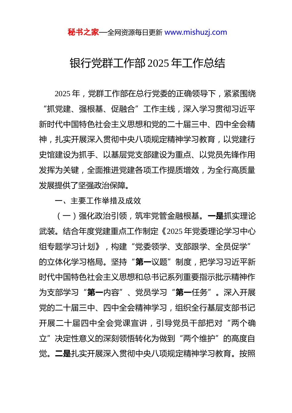 秘书之家—全网资源每日更新 www.mishuzj.com银行党群工作部 2025 年工作总结 2025 年,党群工作部在总行党委的正确领导下,紧紧围绕“抓党建、强根基、促融合”工作主线,深入学习贯彻习近平新时代中国特色社会主义思想和党的二十届三中、四中全会精神,扎实开展深入贯彻中央八项规定精神学习教育,以党建行史馆建设为抓手、以基层党支部建设为重点、以党员先锋作用发挥为关键,全面推进党建各项工作提质增效,为全行高质量发展提供了坚强政治保障。一、主要工作举措及成效(一)强化政治引领,筑牢党管金融根基。一是抓实理论武装。结合年度党建重点工作制定《2025 年党委理论学习中心组专题学习计划》,构建“党委领学、支部跟学、全员促学”的立体化学习格局。坚持“第一议题”制度,把学习习近平新时代中国特色社会主义思想和总书记系列重要指示批示精神作为支部学习“第一内容”、党员学习“第一任务”。深入开展党的二十届三中、四中全会精神学习,组织全行基层支部书记开展二十届四中全会党课宣讲,引导党员干部把对“两个确立”决定性意义的深刻领悟转化为做到“两个维护”的高度自觉。二是扎实开展深入贯彻中央八项规定精神学习教育。按照秘书之家—全网资源每日更新 www.mishuzj.com上级部署要求,认真组织开展专题学习研讨,组织观看警示教育片,引导党员干部知敬畏、存戒惧、守底线,推动中央八项规定精神内化于心、外化于行。三是开展专题培训赋能。组织开展 2025 年基层党建管理培训,提升党务干部履职能力,切实担负起“走在前、挑大梁、多做贡献”的重大责任。(二)建设党建行史馆,增强品牌影响力。一是健全组织保障。成立党建行史馆建设专项工作小组,明确职责分工,制定工作推进计划,确保各项工作有序开展。二是深入挖掘历史资源。面向全行征集党建及行史历史资料,目前已征集到 38 件具有珍贵价值的老物件。按计划对老员工进行访谈,通过口述历史方式,挖掘整理本行发展历程中的重要事件和感人故事。三是学习借鉴先进经验。组织专项工作小组成员赴周边兄弟农商行现场参观学习,借鉴先进做法和建设经验,为本行党建行史馆建设提供有益参考。四是有序推进建设进度。配合相关部门完成党建行史馆设计方案论证和招标工作,为下一步场馆建设奠定基础。(三)深化党业融合,发挥支部战斗堡垒作用。一是完善考核机制。印发 2025 年度党的建设成效评价考核实施方案,深化实施以支部为单位、党建与业务融合的综合考核模式,持续发挥党建引领业务发展的“乘数效应”。二是推进评星定级。秘书之家—全网资源每日更新 www.mishuzj.com对照省联合银行评定细则,有序推进党支部评星定级工作,*党支部、*党支部获评“省属企业五星级党支部”,以点带面提升基层党支部规范化建设水平。三是强化资源统筹。围绕支部强国建设,实行支部柜员、大堂经理调整报备制,加大支部书记对不同工种之间岗位调整的用人话语权,督促指导支部认真落实民主集中制,有效激发支部发展活力。四是打造特色品牌。开展“一支部一品牌”创建,聚焦“十百千”工程,鼓励党支部结合地域资源禀赋和产业特色,打造特色党建名片,成功培育“管通”特色品牌。以娄庄支行为核心阵地,积极探索金融创新,集聚资源打造 LZ 特色支行,助力产业集群做大做强。(四)激发先锋活力,增强党员队伍凝聚力。一是开展先锋创建活动。结合大走访、专项竞赛等活动,在全行组织开展“党员先锋岗、党员责任区、党员突击队”创建活动,通过亮身份、亮职责、亮承诺,引导党员在业务发展中当先锋、作表率。二是丰富教育载体。持续用好主题党日联学、党性教育活动等载体,组织开展形式多样的党员教育活动,增强党员的归属感和荣誉感。三是严把党员发展质量关。按照“控制总量、优化结构、提高质量、发挥作用”的要求,全年完成 6 名党员发展任务,党员队伍结构持续优化。四是创新服务模式。持续丰富“党建+”服务模式,依托政府搭建的政银企对接平台,积秘书之家—全网资源每日更新 www.mishuzj.com极开展产业交流座谈会,推动政策、资金、产业精准对接。(五)守牢思想阵地,强化意识形态管理。一是压实工作...
