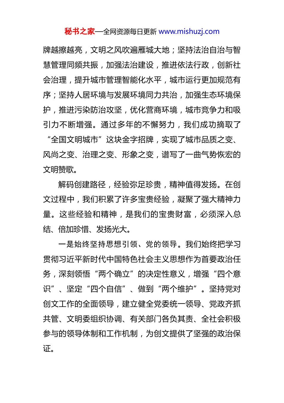 秘书之家—全网资源每日更新 www.mishuzj.com在市创建全国文明城市工作总结暨建设城市文明工作会议讲话 同志们:今天,我们召开 xx 市创建全国文明城市工作总结暨建设城市文明工作会议,主要目的是深入学习贯彻习近平总书记关于精神文明建设的重要论述,总结创文成功经验,巩固深化创建成果,动员全市上下以归零心态、奋进姿态,奋力推动全市文明建设再上新台阶。在此,我代表市委、市政府,向所有为创文付出辛勤努力的单位和个人,向积极参与创文的广大市民,表示最衷心的感谢!向受到表彰的先进集体和个人,表示最热烈的祝贺!回首创建历程,荣誉来之不易,荣耀属于人民。自开展创文工作以来,全市上下以“不创则已、创则必成”的信心和决心,举全市之力、集全民之智,打响了一场轰轰烈烈的创文攻坚战。我们坚持城市面貌与民生福祉同步跃升,实施了一系列城市建设和改造项目,老旧小区焕然一新,背街小巷整洁有序,公共设施日益完善,群众生活更加便捷舒适;坚持价值引领与以文化人同向发力,大力培育和践行社会主义核心价值观,广泛开展道德模范、身边好人等评选表彰和学习宣传活动,“xx 群众”志愿服务品秘书之家—全网资源每日更新 www.mishuzj.com牌越擦越亮,文明之风吹遍雁城大地;坚持法治自治与智慧管理同频共振,加强法治建设,推进依法行政,创新社会治理,提升城市管理智能化水平,城市运行更加规范有序;坚持人居环境与发展环境同力共治,加强生态环境保护,推进污染防治攻坚,优化营商环境,城市竞争力和吸引力不断增强。通过多年的不懈努力,我们成功摘取了“全国文明城市”这块金字招牌,实现了城市品质之变、风尚之变、治理之变、形象之变,谱写了一曲气势恢宏的文明赞歌。解码创建路径,经验弥足珍贵,精神值得发扬。在创文过程中,我们积累了许多宝贵经验,凝聚了强大精神力量。这些经验和精神,是我们的宝贵财富,必须深入总结、倍加珍惜、发扬光大。一是始终坚持思想引领、党的领导。我们始终把学习贯彻习近平新时代中国特色社会主义思想作为首要政治任务,深刻领悟“两个确立”的决定性意义,增强“四个意识”、坚定“四个自信”、做到“两个维护”。坚持党对创文工作的全面领导,建立健全党委统一领导、党政齐抓共管、文明委组织协调、有关部门各负其责、全社会积极参与的领导体制和工作机制,为创文提供了坚强的政治保证。秘书之家—全网资源每日更新 www.mishuzj.com二是始终坚持全民参与、全域协同。创文是一项系统工程,需要全市上下齐心协力、共同参与。我们充分发挥群众的主体作用,广泛开展宣传发动,引导市民群众积极投身创文实践,形成了“人人都是创文主体、个个都是雁城形象”的浓厚氛围。坚持全域创建,统筹城乡发展,推动文明创建向基层延伸、向农村覆盖,实现了城乡文明建设一体化推进。三是始终坚持顽强拼搏、勇争一流。创文之路充满艰辛和挑战,但全市上下不畏困难、迎难而上,发扬顽强拼搏、连续作战的精神,以绣花功夫抓创建,以一流标准促提升,攻克了一个又一个难关,取得了一个又一个胜利。正是这种勇争一流的精神,激励着我们在创文征程中不断前行,最终实现了创建目标。四是始终坚持锲而不舍、持之以恒。创文工作非一朝一夕之功,需要长期坚持、久久为功。我们保持战略定力,咬定青山不放松,一任接着一任干,一年接着一年抓,持续用力、常抓不懈,不断巩固和提升创建成果,推动文明建设不断取得新成效。未来任重道远,必须砥砺奋进,续写文明荣光。创建全国文明城市,是我们迈向更高目标的新起点。我们要以习近平新时代中国特色社会主义思想为指导,深入贯彻落秘书之家—全网资源每日更新 www.mishuzj.com实党的二十大精神,坚持以人民为中心的发展思想,以更高站位、更大格局、更高标准、更实举措、更优机制,奋力推动全市文明建设再上新台阶,让文明成为 xx 最亮丽的底色。一、要以更高站位建设有信仰、有梦想的文明之城文明,是一座城市的内在气质,更是一座城市的精神信仰。我们要筑牢理论根基,深入学习贯彻习近平新时代中国特色社会主义思想,持续开展“衡有道理”等特色理论宣讲活动,让党的创新理论“飞入寻常...