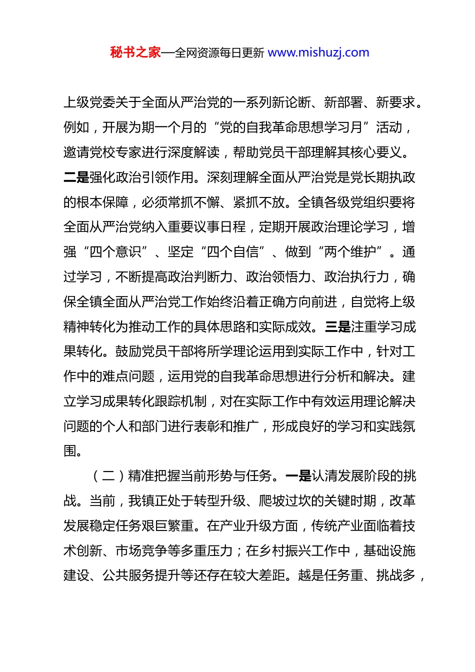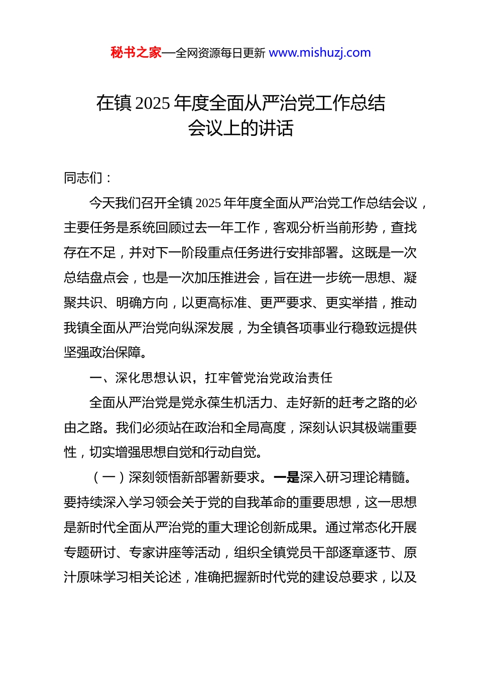 秘书之家—全网资源每日更新 www.mishuzj.com在镇 2025 年度全面从严治党工作总结会议上的讲话 同志们:今天我们召开全镇 2025 年年度全面从严治党工作总结会议,主要任务是系统回顾过去一年工作,客观分析当前形势,查找存在不足,并对下一阶段重点任务进行安排部署。这既是一次总结盘点会,也是一次加压推进会,旨在进一步统一思想、凝聚共识、明确方向,以更高标准、更严要求、更实举措,推动我镇全面从严治党向纵深发展,为全镇各项事业行稳致远提供坚强政治保障。一、深化思想认识,扛牢管党治党政治责任全面从严治党是党永葆生机活力、走好新的赶考之路的必由之路。我们必须站在政治和全局高度,深刻认识其极端重要性,切实增强思想自觉和行动自觉。(一)深刻领悟新部署新要求。一是深入研习理论精髓。要持续深入学习领会关于党的自我革命的重要思想,这一思想是新时代全面从严治党的重大理论创新成果。通过常态化开展专题研讨、专家讲座等活动,组织全镇党员干部逐章逐节、原汁原味学习相关论述,准确把握新时代党的建设总要求,以及秘书之家—全网资源每日更新 www.mishuzj.com上级党委关于全面从严治党的一系列新论断、新部署、新要求。例如,开展为期一个月的“党的自我革命思想学习月”活动,邀请党校专家进行深度解读,帮助党员干部理解其核心要义。二是强化政治引领作用。深刻理解全面从严治党是党长期执政的根本保障,必须常抓不懈、紧抓不放。全镇各级党组织要将全面从严治党纳入重要议事日程,定期开展政治理论学习,增强“四个意识”、坚定“四个自信”、做到“两个维护”。通过学习,不断提高政治判断力、政治领悟力、政治执行力,确保全镇全面从严治党工作始终沿着正确方向前进,自觉将上级精神转化为推动工作的具体思路和实际成效。三是注重学习成果转化。鼓励党员干部将所学理论运用到实际工作中,针对工作中的难点问题,运用党的自我革命思想进行分析和解决。建立学习成果转化跟踪机制,对在实际工作中有效运用理论解决问题的个人和部门进行表彰和推广,形成良好的学习和实践氛围。(二)精准把握当前形势与任务。一是认清发展阶段的挑战。当前,我镇正处于转型升级、爬坡过坎的关键时期,改革发展稳定任务艰巨繁重。在产业升级方面,传统产业面临着技术创新、市场竞争等多重压力;在乡村振兴工作中,基础设施建设、公共服务提升等还存在较大差距。越是任务重、挑战多,秘书之家—全网资源每日更新 www.mishuzj.com越要发挥全面从严治党的引领保障作用,为各项工作的顺利推进提供坚实的政治基础。二是正视党风廉政建设的严峻形势。必须清醒看到,党风廉政建设和反腐败斗争形势依然严峻复杂。一些基层干部在工作中存在形式主义、官僚主义现象,对群众的诉求敷衍塞责;个别领域存在腐败隐患,如工程项目建设、惠农资金发放等方面,一些深层次问题尚未根本解决,新的风险挑战不断出现。三是坚定应对挑战的决心。要科学研判形势,保持战略定力,把严的基调、严的措施、严的氛围长期坚持下去。镇纪委要加强对重点领域和关键环节的监督检查,建立风险预警机制,及时发现和化解潜在风险。以全面从严治党新成效应对风险挑战、护航高质量发展,确保全镇经济社会发展目标顺利实现。(三)压紧压实主体责任链条。一是明确主体责任内容。全面从严治党,核心是加强党的领导,关键在落实责任。镇党委要切实担负起主体责任,坚持把党建工作与中心工作同谋划、同部署、同推进、同考核。制定详细的责任清单,明确党委书记、班子成员以及各部门、各党支部在全面从严治党中的具体职责,确保责任清晰、任务明确。二是发挥领导带头作用。党委书记要认真履行第一责任人职责,以身作则,带头遵守党的纪律和规矩,带头落实全面从严治党各项任务。定期主持召开秘书之家—全网资源每日更新 www.mishuzj.com专题会议研究党建工作,加强对全面从严治党工作的统筹协调和指导。班子成员要严格落实“一岗双责”,既抓好分管业务工作,又抓好分管领域管党治党工作,定期向党委汇报分管领域党风廉政建设情况。三是健全责任落实机制。要健全责任分解、检查监督、倒查追究的完整链条,...