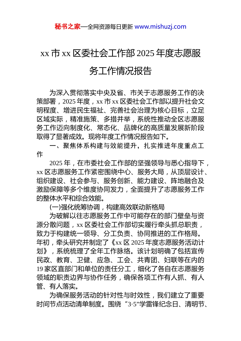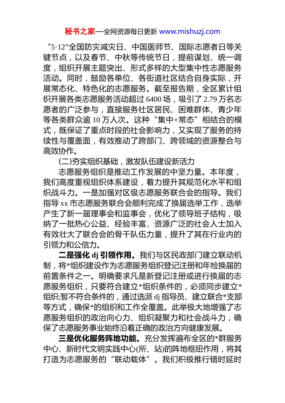 秘书之家—全网资源每日更新 www.mishuzj.comxx 市 xx 区委社会工作部 2025 年度志愿服务工作情况报告为深入贯彻落实中央及省、市关于志愿服务工作的决策部署,2025 年度,xx 市 xx 区委社会工作部以提升社会文明程度、增进民生福祉、完善社会治理为核心目标,立足区域实际,精准施策、多措并举,系统性推动全区志愿服务工作迈向制度化、常态化、品牌化的高质量发展新阶段取得了显著成效。现将年度工作情况报告如下。一、聚焦体系构建与效能提升,扎实推进年度重点工作2025 年,在市委社会工作部的坚强领导与悉心指导下,xx 区志愿服务工作紧密围绕中心、服务大局,从顶层设计、组织建设、社会参与、服务创新、能力建设、阵地融合及激励保障等多个维度协同发力,全面提升了志愿服务工作的整体水平和综合效能。(一)强化统筹协调,构建高效联动新格局为破解以往志愿服务工作中可能存在的部门壁垒与资源分散问题,xx 区委社会工作部切实履行牵头抓总职责,致力于构建统一领导、分工负责、协同推进的工作格局。年初,牵头研究并制定了《xx 区 2025 年度志愿服务活动计划》,系统梳理了全年工作脉络。该计划明确了包括宣传民政、教育、卫健、应急、工会、共青团、妇联等在内的19 家区直部门和单位的责任分工,细化了各自在志愿服务领域的职责边界与协作任务,确保各项工作有人抓、有人管、有人落实。为确保服务活动的针对性与时效性,我们建立了重要时间节点活动清单制度。围绕“3·5”学雷锋纪念日、清明节、秘书之家—全网资源每日更新 www.mishuzj.com“5·12”全国防灾减灾日、中国医师节、国际志愿者日等关键节点,以及春节、中秋等传统节日,提前谋划、统一调度,组织开展主题突出、形式多样的大型集中性志愿服务活动。同时,鼓励各单位、各街道社区结合自身实际,开展常态化、特色化的志愿服务。截至报告期,全区累计组织开展各类志愿服务活动超过 6400 场,吸引了 2.79 万名志愿者的广泛参与,直接服务社区居民、困难群体、青少年等各类群众逾 10 万人次。这种“集中+常态”相结合的模式,既保证了重点时段的社会影响力,又实现了服务的持续性与覆盖面,有效推动了跨部门、跨领域的资源整合与高效协作。(二)夯实组织基础,激发队伍建设新活力志愿服务组织是推动工作发展的中坚力量。本年度,我们高度重视组织体系建设,着力提升其规范化水平和组织战斗力。一是加强对区级志愿服务联合会的指导。我们指导 xx 市志愿服务联合会顺利完成了换届选举工作,选举产生了新一届理事会和监事会,优化了领导班子结构,吸纳了一批热心公益、经验丰富、资源广泛的社会人士加入有效壮大了联合会的骨干队伍力量,提升了其在行业内的引领力和公信力。二是强化 dj 引领作用。我们与区民政部门建立联动机制,将*组织建设作为志愿服务组织登记注册和年检换届的前置条件之一。明确要求凡是新登记注册或进行换届的志愿服务组织,只要符合建立*组织条件的,必须同步建立*组织;暂不符合条件的,通过选派 dj 指导员、建立联合*支部等方式,确保*的组织和工作全覆盖。此举极大地增强了志愿服务组织的政治向心力、组织凝聚力和社会战斗力,确保了志愿服务事业始终沿着正确的政治方向健康发展。三是优化服务阵地功能。充分发挥遍布全区的*群服务中心、新时代文明实践中心(所、站)的阵地枢纽作用,将其打造为志愿服务的“联动载体”。我们积极推行错时延时秘书之家—全网资源每日更新 www.mishuzj.com特色服务,鼓励这些阵地采取错峰、延时等灵活方式,在工作日早晚非工作时间以及法定节假日延长开放时间。这不仅为志愿者开展活动、交流学习提供了便利的物理空间也为周边居民和上班族参与或接受志愿服务创造了有利条件,有效破解了“上班没空、下班没处”的难题。(三)拓宽参与渠道,开创多元融合新模式为最大限度地动员社会各界力量参与志愿服务,我们积极探索并推广了多种创新融合模式,有效拓展了志愿服务的参与广度和深度。一是创新“两企三新+志愿”模式。我们积极推动在非公有制企业、社会组织以及新经济组织、新社会组织、新就业群体中建立*员志愿服务队。结合不同领域...
