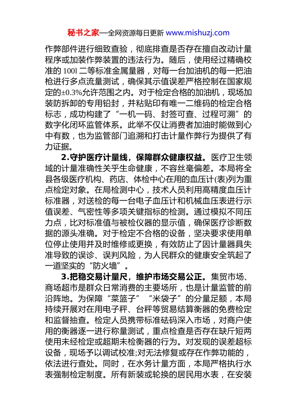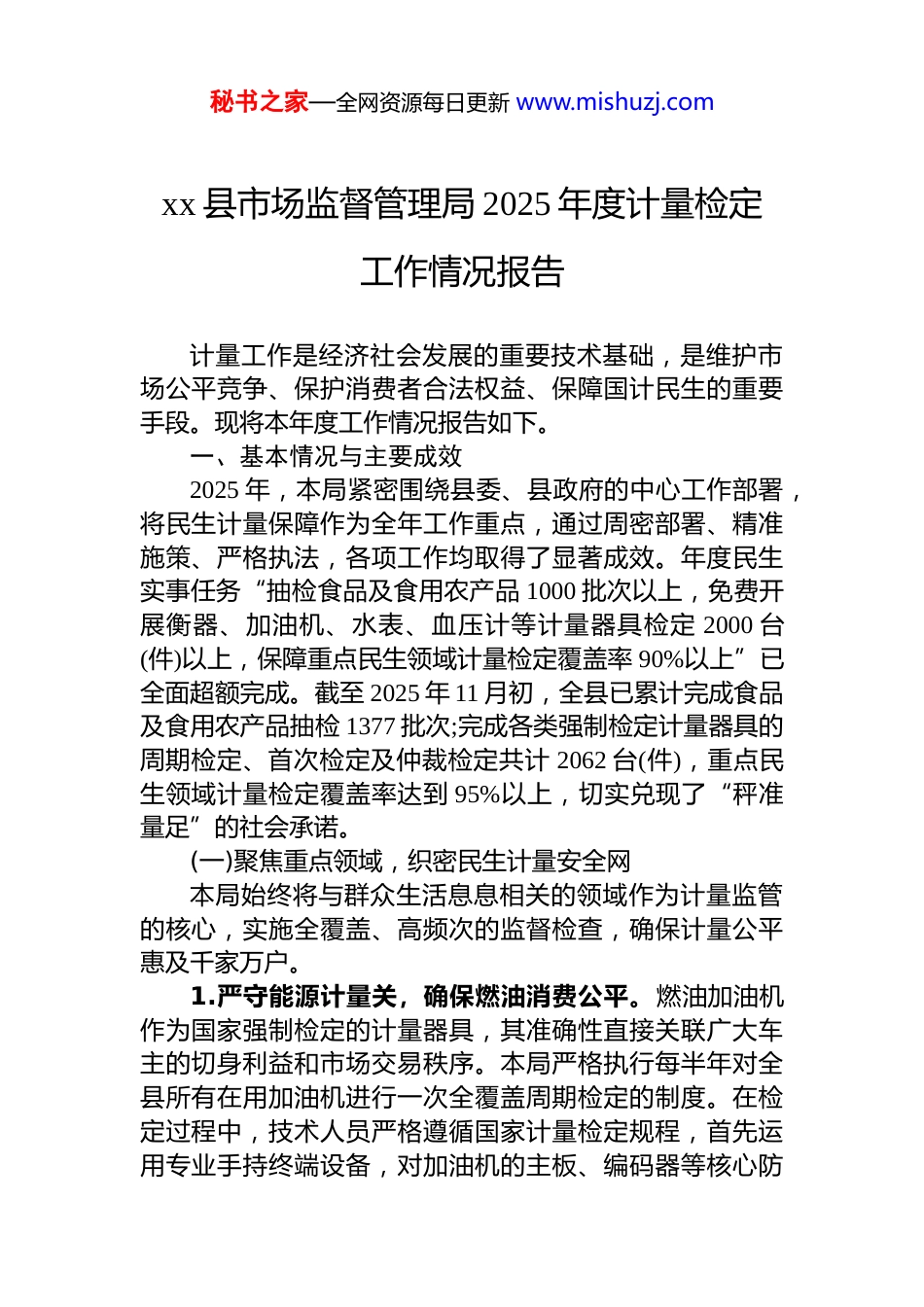 秘书之家—全网资源每日更新 www.mishuzj.comxx 县市场监督管理局 2025 年度计量检定工作情况报告计量工作是经济社会发展的重要技术基础,是维护市场公平竞争、保护消费者合法权益、保障国计民生的重要手段。现将本年度工作情况报告如下。一、基本情况与主要成效2025 年,本局紧密围绕县委、县政府的中心工作部署,将民生计量保障作为全年工作重点,通过周密部署、精准施策、严格执法,各项工作均取得了显著成效。年度民生实事任务“抽检食品及食用农产品 1000 批次以上,免费开展衡器、加油机、水表、血压计等计量器具检定 2000 台(件)以上,保障重点民生领域计量检定覆盖率 90%以上”已全面超额完成。截至 2025 年 11 月初,全县已累计完成食品及食用农产品抽检 1377 批次;完成各类强制检定计量器具的周期检定、首次检定及仲裁检定共计 2062 台(件),重点民生领域计量检定覆盖率达到 95%以上,切实兑现了“秤准量足”的社会承诺。(一)聚焦重点领域,织密民生计量安全网本局始终将与群众生活息息相关的领域作为计量监管的核心,实施全覆盖、高频次的监督检查,确保计量公平惠及千家万户。1.严守能源计量关,确保燃油消费公平。燃油加油机作为国家强制检定的计量器具,其准确性直接关联广大车主的切身利益和市场交易秩序。本局严格执行每半年对全县所有在用加油机进行一次全覆盖周期检定的制度。在检定过程中,技术人员严格遵循国家计量检定规程,首先运用专业手持终端设备,对加油机的主板、编码器等核心防秘书之家—全网资源每日更新 www.mishuzj.com作弊部件进行细致查验,彻底排查是否存在擅自改动计量程序或加装作弊装置的违法行为。随后,使用经过精确校准的 100l 二等标准金属量器,对每一台加油机的每一把油枪进行多点流量测试,确保其示值误差严格控制在国家规定的±0.3%允许范围之内。对于检定合格的加油机,现场加装防拆卸的专用铅封,并粘贴印有唯一二维码的检定合格标志,成功构建了“一机一码、封签可查、过程可溯”的数字化闭环监管体系。此举不仅让消费者加油时能做到心中有数,也为监管部门追溯和打击计量作弊行为提供了有力证据。2.守护医疗计量线,保障群众健康权益。医疗卫生领域的计量准确性关乎生命健康,不容丝毫偏差。本局将全县各级医疗机构、药店、体检中心在用的血压计(表)列为重点检定对象。在局检测中心,技术人员利用高精度血压计标准器,对送检的每一台电子血压计和机械血压表进行示值误差、气密性等多项关键指标的检测。通过模拟不同压力点,比对标准值与被检仪器的显示值,确保医疗诊断数据的源头准确。对于检定不合格的设备,坚决要求使用单位停止使用并及时维修或更换,有效防止了因计量器具失准导致的误诊、误判风险,为人民群众的健康安全筑起了一道坚实的“防火墙”。3.把稳交易计量尺,维护市场交易公正。集贸市场、商场超市是群众日常消费的主要场所,也是计量监管的前沿阵地。为保障“菜篮子”“米袋子”的分量足额,本局持续开展对在用电子秤、台秤等贸易结算衡器的免费检定和监督抽查。检定人员携带标准砝码深入市场,对商户使用的衡器逐一进行称量测试,重点检查是否存在缺斤短两使用未经检定或超期未检衡器的行为。对发现的误差超标设备,现场予以调试校准;对无法修复或存在作弊功能的,依法进行查处。同时,在水务计量方面,本局严格执行水表强制检定制度。所有新装或轮换的居民用水表,在安装秘书之家—全网资源每日更新 www.mishuzj.com入户前必须送至本局水表检定装置进行“入职体检”。通过全自动水表检定系统,对水表的外观结构、密封性能以及在多个常用流量点下的示值误差进行全面检测。只有所有指标均符合国家标准的水表,方可获得检定合格标签,准予接入供水管网,从源头上保证了居民用水计量的公平公正与透明。全年检定各类贸易结算衡器超过 1000 台,合格率达到 98%以上,有效遏制了计量欺诈行为。(二)夯实技术基础,提升计量服务能力本局深刻认识到,先进的技术能力是履行计量监管职责的根本保障。年度内,全局持续加强计量标准体系建设和技术能力提升。1.优化设备与标准配置。依据全县产业发...