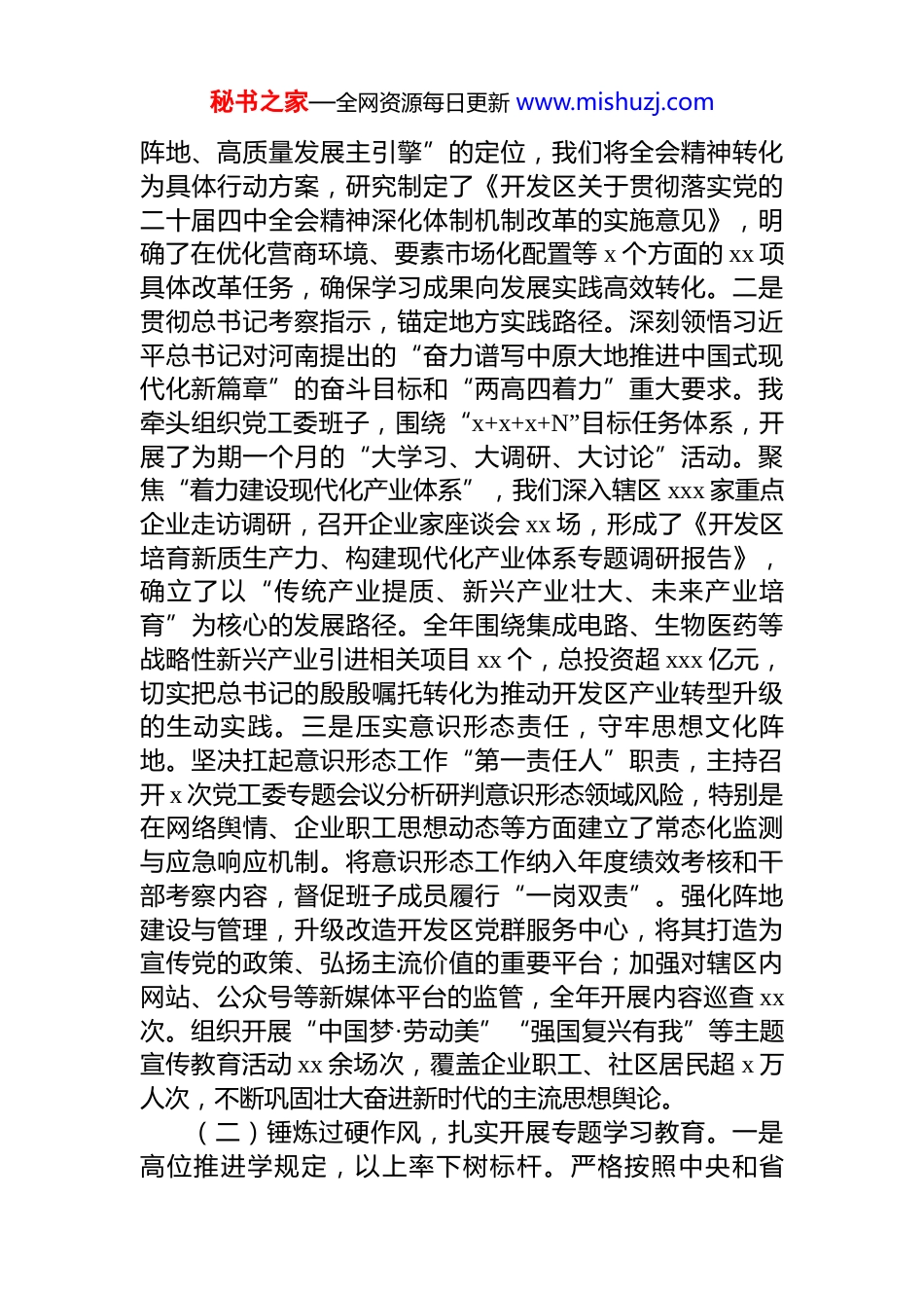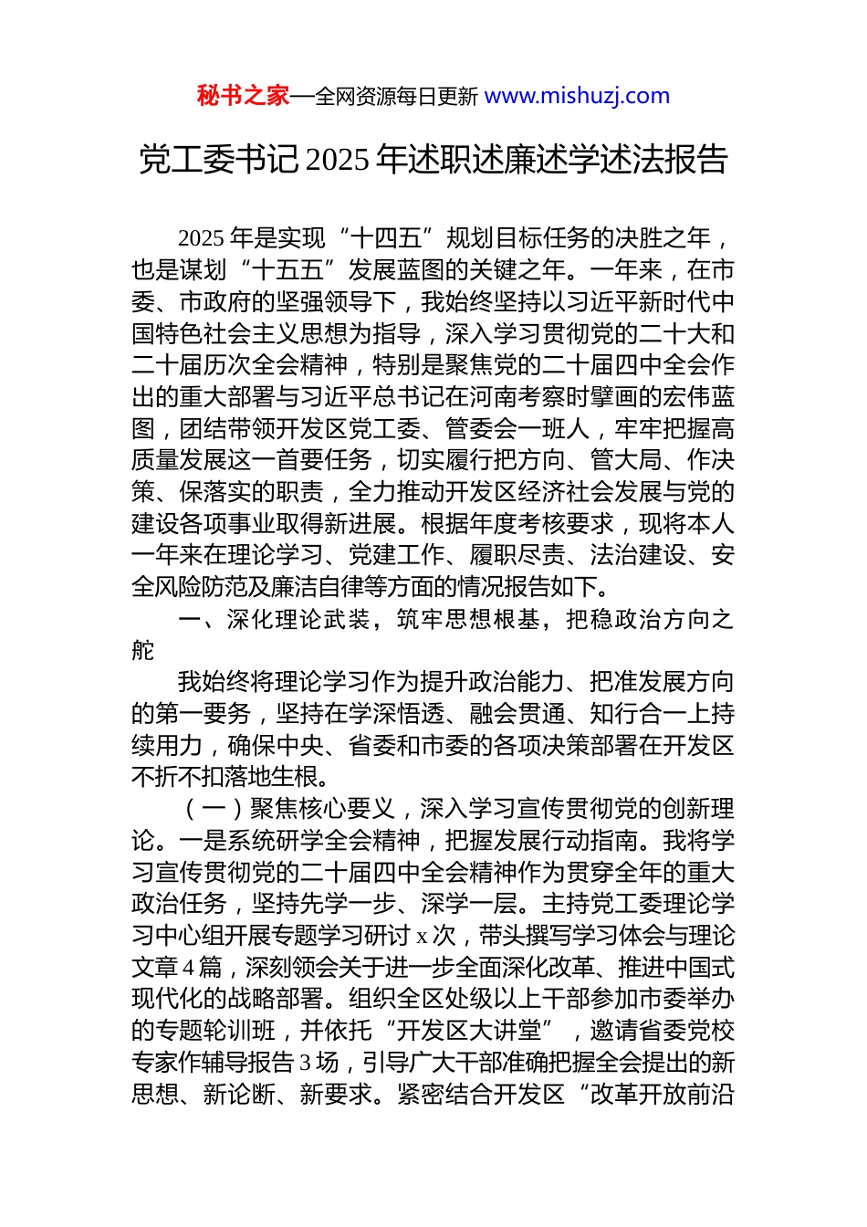 秘书之家—全网资源每日更新 www.mishuzj.com党工委书记 2025 年述职述廉述学述法报告2025 年是实现“十四五”规划目标任务的决胜之年,也是谋划“十五五”发展蓝图的关键之年。一年来,在市委、市政府的坚强领导下,我始终坚持以习近平新时代中国特色社会主义思想为指导,深入学习贯彻党的二十大和二十届历次全会精神,特别是聚焦党的二十届四中全会作出的重大部署与习近平总书记在河南考察时擘画的宏伟蓝图,团结带领开发区党工委、管委会一班人,牢牢把握高质量发展这一首要任务,切实履行把方向、管大局、作决策、保落实的职责,全力推动开发区经济社会发展与党的建设各项事业取得新进展。根据年度考核要求,现将本人一年来在理论学习、党建工作、履职尽责、法治建设、安全风险防范及廉洁自律等方面的情况报告如下。一、深化理论武装,筑牢思想根基,把稳政治方向之舵我始终将理论学习作为提升政治能力、把准发展方向的第一要务,坚持在学深悟透、融会贯通、知行合一上持续用力,确保中央、省委和市委的各项决策部署在开发区不折不扣落地生根。(一)聚焦核心要义,深入学习宣传贯彻党的创新理论。一是系统研学全会精神,把握发展行动指南。我将学习宣传贯彻党的二十届四中全会精神作为贯穿全年的重大政治任务,坚持先学一步、深学一层。主持党工委理论学习中心组开展专题学习研讨 x 次,带头撰写学习体会与理论文章 4 篇,深刻领会关于进一步全面深化改革、推进中国式现代化的战略部署。组织全区处级以上干部参加市委举办的专题轮训班,并依托“开发区大讲堂”,邀请省委党校专家作辅导报告 3 场,引导广大干部准确把握全会提出的新思想、新论断、新要求。紧密结合开发区“改革开放前沿秘书之家—全网资源每日更新 www.mishuzj.com阵地、高质量发展主引擎”的定位,我们将全会精神转化为具体行动方案,研究制定了《开发区关于贯彻落实党的二十届四中全会精神深化体制机制改革的实施意见》,明确了在优化营商环境、要素市场化配置等 x 个方面的 xx 项具体改革任务,确保学习成果向发展实践高效转化。二是贯彻总书记考察指示,锚定地方实践路径。深刻领悟习近平总书记对河南提出的“奋力谱写中原大地推进中国式现代化新篇章”的奋斗目标和“两高四着力”重大要求。我牵头组织党工委班子,围绕“x+x+x+N”目标任务体系,开展了为期一个月的“大学习、大调研、大讨论”活动。聚焦“着力建设现代化产业体系”,我们深入辖区 xxx 家重点企业走访调研,召开企业家座谈会 xx 场,形成了《开发区培育新质生产力、构建现代化产业体系专题调研报告》,确立了以“传统产业提质、新兴产业壮大、未来产业培育”为核心的发展路径。全年围绕集成电路、生物医药等战略性新兴产业引进相关项目 xx 个,总投资超 xxx 亿元,切实把总书记的殷殷嘱托转化为推动开发区产业转型升级的生动实践。三是压实意识形态责任,守牢思想文化阵地。坚决扛起意识形态工作“第一责任人”职责,主持召开 x 次党工委专题会议分析研判意识形态领域风险,特别是在网络舆情、企业职工思想动态等方面建立了常态化监测与应急响应机制。将意识形态工作纳入年度绩效考核和干部考察内容,督促班子成员履行“一岗双责”。强化阵地建设与管理,升级改造开发区党群服务中心,将其打造为宣传党的政策、弘扬主流价值的重要平台;加强对辖区内网站、公众号等新媒体平台的监管,全年开展内容巡查 xx次。组织开展“中国梦·劳动美”“强国复兴有我”等主题宣传教育活动 xx 余场次,覆盖企业职工、社区居民超 x 万人次,不断巩固壮大奋进新时代的主流思想舆论。(二)锤炼过硬作风,扎实开展专题学习教育。一是高位推进学规定,以上率下树标杆。严格按照中央和省秘书之家—全网资源每日更新 www.mishuzj.com委、市委部署,将深入开展贯彻中央八项规定精神学习教育作为纵深推进全面从严治党的重要举措。我切实履行第一责任人职责,主持制定开发区学习教育实施方案,并担任领导小组组长。坚持带头学,利用两天时间举办党工委读书班,原原本本研读《习近平关于加强党的作风建设论述摘编》等书目;坚持带头...