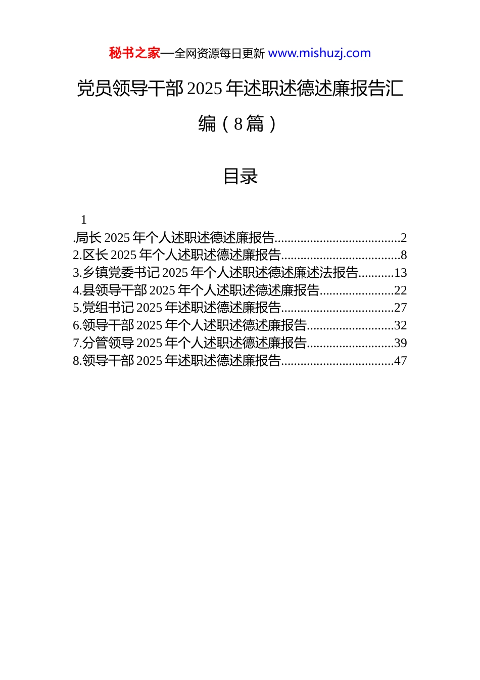 秘书之家—全网资源每日更新 www.mishuzj.com党员领导干部 2025 年述职述德述廉报告汇编(8 篇)目录1.局长 2025 年个人述职述德述廉报告.......................................22.区长 2025 年个人述职述德述廉报告.....................................83.乡镇党委书记 2025 年个人述职述德述廉述法报告...........134.县领导干部 2025 年个人述职述德述廉报告.......................225.党组书记 2025 年述职述德述廉报告...................................276.领导干部 2025 年个人述职述德述廉报告...........................327.分管领导 2025 年个人述职述德述廉报告...........................398.领导干部 2025 年述职述德述廉报告...................................47秘书之家—全网资源每日更新 www.mishuzj.com局长 2025 年个人述职述德述廉报告2025 年在市委、市政府的坚强领导下,在省民政厅的有力指导下,我始终坚持以人民为中心的发展思想,牢记“民政为民、民政爱民”工作理念,团结带领全市民政系统干部职工,聚焦基本民生保障、基层社会治理、基本社会服务三大主责主业,用心用情用力办好每一件民生实事,努力让困难群众有依靠、基层治理有温度、社会服务有质感。现将一年来个人履职尽责、崇德修身、廉洁从政情况汇报如下:一、坚持政治统领,把稳思想之舵,在服务大局中锤炼绝对忠诚民政工作关系民生、连着民心,是党和政府联系群众的重要桥梁。作为民政部门主要负责人,我始终把讲政治摆在首位,深刻领悟“两个确立”的决定性意义,坚决做到“两个维护”,自觉在思想上政治上行动上同党中央保持高度一致。一是强化理论武装。坚持把学习贯彻习近平新时代中国特色社会主义思想作为首要政治任务,深入学习党的二十大和二十届四中全会精神,认真研读《习近平关于民政工作论述摘编》,全年参加中心组学习 xx 次,主持党组专题学习 xx 次,带头讲党课 x 次,推动理论学习走深走实。二是把准民政定位。深刻把握新时代民政工作的职责使命,准确理解“国之大者”与“民之关切”的内在统一,坚持从政治上看民政、从民生上抓民政、从全局中谋民政,确保各项工作始终沿着正确方向前进。三是推动落地见效。注重把上级决策部署转化为具体行动,围绕健全分层分类社会救助体系、推进养老服务高质量发展、加强基层治理现代化建设等重点任务,制定实施方案,建立工作台账,实行清单化管理、项目化推进,确保件件有落秘书之家—全网资源每日更新 www.mishuzj.com实、事事见成效。二、聚焦主责主业,扛起民生之责,在实干担当中提升幸福成色民政工作桩桩件件连着百姓冷暖。一年来,我始终把群众满意作为最高标准,紧盯群众急难愁盼问题,扎实推进各项重点工作落地见效。(一)织密兜牢基本民生保障网,让困难群众生活更有底气。始终坚持应保尽保、应救尽救,不断完善覆盖全面、分层分类、综合高效的社会救助体系。一是提升救助精准度。依托低收入人口动态监测信息平台,整合医保、教育、住建等部门数据资源,实现对低保对象、特困人员、低保边缘家庭等群体的常态化监测与主动发现。全年新纳入城乡低保对象 xxxx 人,实施临时救助 xxxx 人次,发放救助资金 x.x 亿元,切实做到“不漏一户、不落一人”。二是拓展救助覆盖面。推动救助政策向低收入群体延伸,出台《关于加强低收入人口动态监测做好分层分类社会救助工作的实施意见》,将符合条件的因病、因残、因学致困家庭纳入专项救助范围。开展“救急难”专项行动,为遭遇突发重大困难的家庭发放应急救助金 xxx 万元。三是增强服务可及性。在乡镇(街道)全面建立“一门受理、协同办理”服务窗口,推广“掌上办”“网上办”,简化审批流程,压缩办理时限,群众满意度达 xx.x%。(二)加快构建养老服务体系,让老年群体安享幸福晚年。积极应对人口老龄化趋势,着力构建居家社区机构相协调、医养康养相结合的养老服务体系。一是夯实居家社区基础。持续推进社区养老服务设施建设,全年新建街道综合养老服务中心 x 个、社区养老服务站 xx 个,实现城市社区养老服务设施全覆盖。...