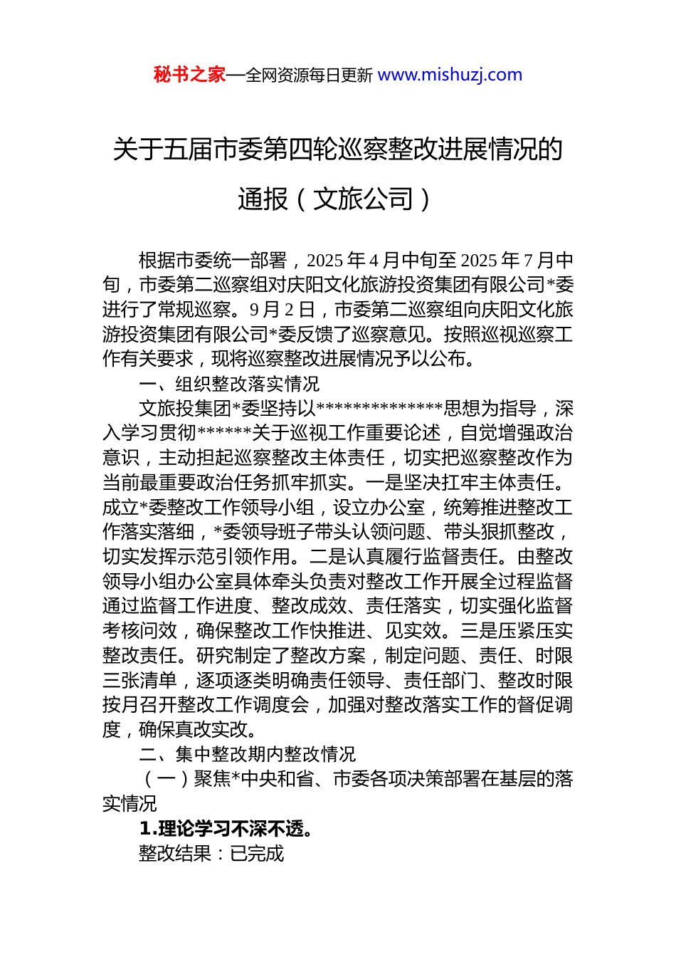 秘书之家—全网资源每日更新 www.mishuzj.com关于五届市委第四轮巡察整改进展情况的通报(文旅公司) 根据市委统一部署,2025 年 4 月中旬至 2025 年 7 月中旬,市委第二巡察组对庆阳文化旅游投资集团有限公司*委进行了常规巡察。9 月 2 日,市委第二巡察组向庆阳文化旅游投资集团有限公司*委反馈了巡察意见。按照巡视巡察工作有关要求,现将巡察整改进展情况予以公布。一、组织整改落实情况文旅投集团*委坚持以**************思想为指导,深入学习贯彻******关于巡视工作重要论述,自觉增强政治意识,主动担起巡察整改主体责任,切实把巡察整改作为当前最重要政治任务抓牢抓实。一是坚决扛牢主体责任。成立*委整改工作领导小组,设立办公室,统筹推进整改工作落实落细,*委领导班子带头认领问题、带头狠抓整改,切实发挥示范引领作用。二是认真履行监督责任。由整改领导小组办公室具体牵头负责对整改工作开展全过程监督通过监督工作进度、整改成效、责任落实,切实强化监督考核问效,确保整改工作快推进、见实效。三是压紧压实整改责任。研究制定了整改方案,制定问题、责任、时限三张清单,逐项逐类明确责任领导、责任部门、整改时限按月召开整改工作调度会,加强对整改落实工作的督促调度,确保真改实改。二、集中整改期内整改情况(一)聚焦*中央和省、市委各项决策部署在基层的落实情况1.理论学习不深不透。整改结果:已完成秘书之家—全网资源每日更新 www.mishuzj.com整改情况:重新完善了集团公司 2024 年度干部职工理论学习计划,建立健全“线上+线下”学习机制。线上利用“学习强国”、甘肃 djapp 开展网络学习培训,线下通过“*委理论学习中心组”学习 17 次,交流研讨 9 次、干部职工周二集中学、支部“三会一课”、开展*委会 16 次、召开*员大会 10 次、领导讲*课 13 次、主题*日学习活动 31 次、个人自学等方式,组织干部紧扣学习省第十四次*代会、市第五次*代会和全省文旅工作会议主题,作了交流研讨,形成认识和体会 15 篇,*委班子成员结合各自的分管工作提出了贯彻落实的思路举措,形成进一步推动文旅投事业高质量发展的思想共识。2.文旅市场拓展不足。整改结果:已完成整改情况:组织公司*委班子成员学习******关于文化和旅游的重要论述及中央、省市委关于加快文旅融合及国有企业改革发展相关文件精神,*委班子成员对分管领域工作进行深入分析研判,集团公司结合自身发展实际,成立了 1 个一级子公司(酒店管理公司)和 1 个二级子公司(交响乐演艺有限公司)。同时,在文旅项目建设上积极谋划计划实施南梁红色教育研习中心项目,目前已取得林业准入许可证、项目建设意见书,已完成勘测定界、可行性研究报告、地勘等前期手续办理工作。3.投资项目收益差。整改结果:已完成整改情况:鉴于项目收益不佳,终止了与庆城县黑河大峡谷景区的合作;与甘肃文旅产业集团合作的塬乡音乐节和塬上露营部落项目积极对接,制定出合作退出方案,确保及时止损。同时,为强化项目前期论证,从源头把控投资风险,研究制定了《投资项目可行性研究管理办法》明确了“收益测算、风险评估、市场前景、合规性审查”四大核心评估指标,降低了投资风险,确保投资的合理性秘书之家—全网资源每日更新 www.mishuzj.com合规性。4.经营效益不佳。整改结果:已完成整改情况:针对新办的奶茶店项目经营效益欠佳的问题,文化传媒公司经过认真分析,为降低成本、确保国有资产保值增值,决定将奶茶店的现有设备搬迁至南梁干部学院,在进一步丰富华池风桦公司经营业态,迎合培训需要同时,盘活现有资产,实现盈利。同时为激活员工创业干事积极性在薪酬与考核挂钩,实行差异化管理,2024 年度表彰先进部室 4 个,优秀个人 4 人。5.经营活动有风险。整改结果:已完成整改情况:督促旅行社对 2023 年 12 月 19 日与甘肃润至信装饰公司、12 月 28 日与王某等 41 人签订的《团队境内旅游合同》附件等资料进行了完善,充分利用旅游行业的淡季时间,开展业务提升培训班 2 期,提升员工的专业技能和服务水平。6.人员管理有漏洞。整改结果:已完成整...
