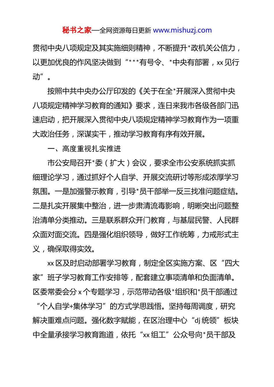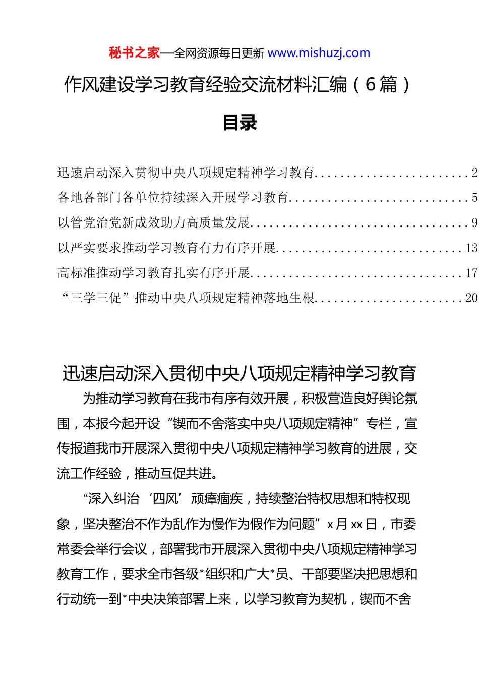 秘书之家—全网资源每日更新 www.mishuzj.com作风建设学习教育经验交流材料汇编(6 篇)目录迅速启动深入贯彻中央八项规定精神学习教育........................2各地各部门各单位持续深入开展学习教育............................5以管党治党新成效助力高质量发展..................................9以严实要求推动学习教育有力有序开展.............................13高标准推动学习教育扎实有序开展.................................17“三学三促”推动中央八项规定精神落地生根.......................20迅速启动深入贯彻中央八项规定精神学习教育为推动学习教育在我市有序有效开展,积极营造良好舆论氛围,本报今起开设“锲而不舍落实中央八项规定精神”专栏,宣传报道我市开展深入贯彻中央八项规定精神学习教育的进展,交流工作经验,推动互促共进。“深入纠治‘四风’顽瘴痼疾,持续整治特权思想和特权现象,坚决整治不作为乱作为慢作为假作为问题”x 月 xx 日,市委常委会举行会议,部署我市开展深入贯彻中央八项规定精神学习教育工作,要求全市各级*组织和广大*员、干部要坚决把思想和行动统一到*中央决策部署上来,以学习教育为契机,锲而不舍秘书之家—全网资源每日更新 www.mishuzj.com贯彻中央八项规定及其实施细则精神,不断提升*政机关公信力,以更加优良的作风坚决做到“***有号令、*中央有部署,xx 见行动”。按照中共中央办公厅印发的《关于在全*开展深入贯彻中央八项规定精神学习教育的通知》要求,连日来我市各级各部门迅速启动,把开展深入贯彻中央八项规定精神学习教育作为一项重大政治任务,深谋实干,推动学习教育有序有效开展。一、高度重视扎实推进市公安局召开*委(扩大)会议,要求全市公安系统抓实抓细理论学习,通过抓好个人自学、开展交流研讨等形成浓厚学习氛围。一是加强警示教育,引导*员干部举一反三找准问题症结。二是扎实开展集中整治,进一步肃清流毒影响,明晰突出问题整治清单分类推动。三是联系群众开门教育,与基层民警、人民群众面对面交流。四是强化组织领导,做好工作统筹,力戒形式主义,确保取得实效。xx 区及时启动部署学习教育,制定全区实施方案、区“四大家”班子学习教育工作安排等,配套建立事项清单和负面清单。区委常委会分 x 个专题学习,示范带动各级*组织和*员干部通过“个人自学+集体学习”的方式学思践悟。坚持每周调度,研究解决重难点问题。强化数字赋能,在区治理中心“dj 统领”板块中全量承接学习教育跑道,依托“xx 组工”公众号向*员干部及秘书之家—全网资源每日更新 www.mishuzj.com时推送有关重要评论和权威解读文章。二、找准重点学深悟透xx 区 x 个市管领导班子、xxx 个处级领导班子、xxxx 个基层*组织全部启动学习教育,精心制定各级*组织学习教育重点任务清单扎实推进。区级领导干部带头开展自学,示范带动处级领导班子及时跟进学习,依托*校开设作风建设专题课程,推动基层*组织每月开展集中学习、*员“线上+线下”常态化学习。该区精细抓好学习教育的组织统筹,强化行业系统*委统筹协调作用,确保学习教育有力有效开展。xx 区以“四为”问题整治为先导迅速启动学习教育,持续巩固深化 dj 学习教育成果,部署开展“乱作为、不作为、不敢为、不善为”问题整治,梳理清单问题 xxxx 项,为学习教育打下坚实基础。区委常委会举行会议启动部署,全区 xx 个县处级领导班子和 xxxx 个基层*组织已全面启动学习教育。该区还组建工作专班指导机关、国资、教育、卫生、非公等行业领域*委细化工作举措。三、梳理问题务求实效xx 区建立“一把手”亲自抓、“专班推进+行业指导”工作机制,推动 xxx 个处级以上领导班子动员部署全覆盖,xxxx 个基层*组织通过“三会一课”、主题*日开展学习教育,并将开展学习教育同贯彻落实******视察 xx 重要讲话****精神、巩固拓展 dj秘书之家—全网资源每日更新 www.mishuzj.com学习教育成果、落实全区重大任务结合起来,构建“学、查、改、立”闭环体系,以作风建设新成效推动现代化新 xx 枢纽之城建设。xx 区聚焦一体推进学查改,从...
