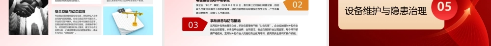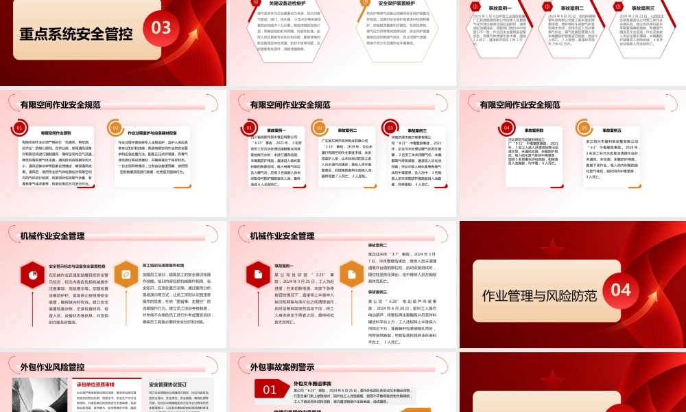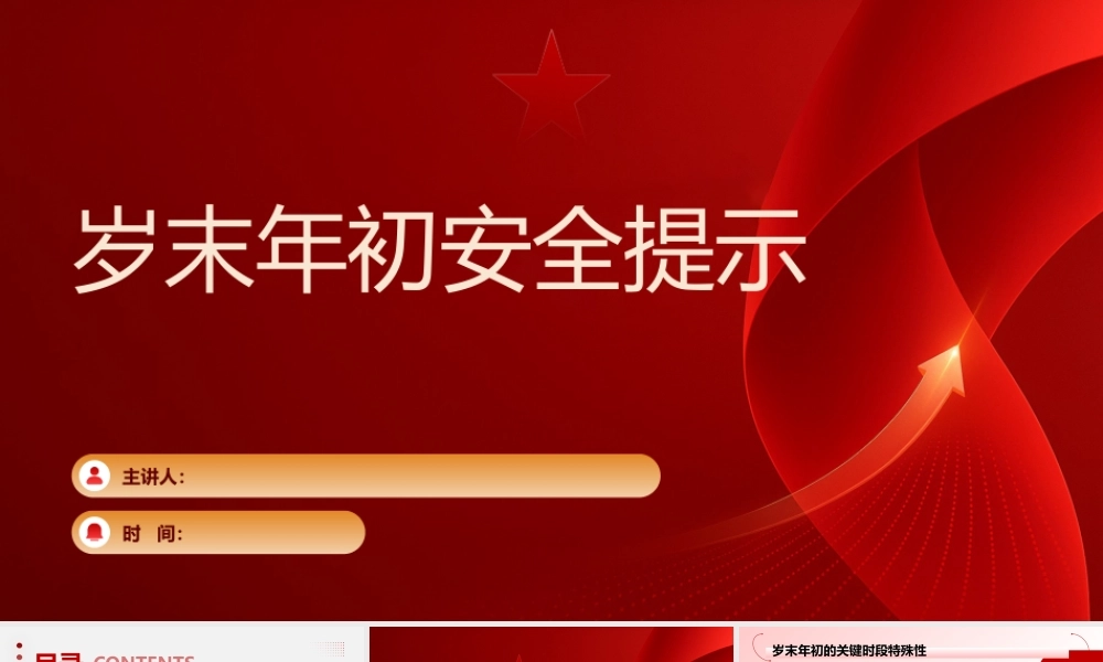 岁末年初安全提示主讲人:时 间:目录 CONTENTSPART01企业岁末年初安全形势剖析PART02低温天气安全防控措施PART03重点系统安全管控PART03作业管理与风险防范PART05设备维护与隐患治理PART06结语企业岁末年初安全形势剖析01岁末年初,处于生产经营收尾冲刺与新年筹备并行的关键阶段,企业往往为完成年度目标而加快生产节奏,赶进度、抢工期现象普遍,这使得生产负荷大幅攀升。同时,新年筹备工作也分散了企业部分精力,易导致安全管理出现漏洞。此阶段涉及设备设施的年度检修维护、新设备的安装调试以及人员的岗位调整、培训安排等多项工作,工作内容繁杂,增加了安全管理的复杂性。岁末年初的关键时段特殊性低温冰冻雨雪天气频发,工业企业大跨度厂房,严重积雪可能超过厂房承载能力,导致屋顶局部或大面积垮塌,造成群死群伤。大风可能导致厂区围板、棚架、广告牌、临时搭建物等设施倒塌引发物体打击事故。生产现场、厂区道路积水结冰易导致人员滑倒受伤、车辆附着力差引发事故。各类高温炉体配套的水冷设备可能因低温冰冻而失效,引起炉体烧穿造成高温熔融物质泄漏,进而导致爆炸、灼烫等事故。涉爆粉尘领域中位于室外的湿式除尘器内部的水,因气温过低结冰,造成湿式除尘“干式运行”,在无相应控爆措施情况下,存在粉尘爆炸风险;干式除尘器风压差、温度监测监控装置容易失灵,可能导致监测预警系统无法正常运行。危险化学品储存和使用设备冻裂易引发危险化学品泄漏事故。自然因素风险不利因素交织下的安全风险满负荷、超强度生产,极易造成机械故障、电气故障和人员疲劳,从而引发生产安全事故。检维修作业集中,若作业流程不规范、安全措施不到位,容易引发火灾、爆炸、中毒等事故。承发包作业增多,交叉作业风险增大,如管理不善,易导致不同作业团队之间的协调配合出现问题,引发安全事故。生产作业因素风险不利因素交织下的安全风险低温天气安全防控措施020201铝加工(深井铸造)企业设备防护铝加工(深井铸造)企业要重点排查应急水池、高位水塔及输送管道的保温措施。安排专人定期检查保温层是否完好,对发现破损的保温层及时进行修复或更换。在管道上加装伴热装置,并设置温度监测报警系统,实时监控管道温度,当温度过低时及时报警,以便采取相应措施,防止管道冻结,保障应急状态下冷却水能够及时输送到位,避免高温设备因冷却中断引发安全事故。湿式除尘系统防冻对于采用湿式除尘系统的粉尘涉爆企业,提前检查并启动室外循环水加热装置至关重要。在冬季来临前,安排专业人员对加热装置进行全面检查和维护,确保其正常运行。设定合理的水温阈值,一旦水温低于设定值,自动启动加热装置,确保水温保持在冰点以上,避免循环水结冰导致除尘器“干式运行”,引发粉尘积聚爆炸风险。设备设施防冻防凝重点湖北五鼎泵业中频炉事故详情2022 年湖北省五鼎泵业制造有限公司“ 5·8” 中频炉漏炉事故,在冬季熔炼作业中,车间主任开炉前未按规程检查炉衬厚度,炉衬已存在局部缺陷未被发现,且冷却系统缺乏必要的温度、压力监测报警装置。高温钢液穿透受损炉衬后与冷却水直接接触,引发两次钢液喷溅,最终造成 1 人死亡、 1 人受伤,直接经济损失 238 万元。事故教训与启示该事故警示企业,冬季设备维护需兼顾防冻与关键部件检测。企业应建立完善的设备维护制度,明确设备维护的责任人和流程,加强对设备维护工作的监督和考核。在冬季,增加对设备的巡检频次,不仅要关注设备的防冻措施,还要对设备的关键部件进行全面检测,及时发现并修复潜在缺陷,杜绝因“重生产、轻维护”忽视设备潜在隐患,避免低温与设备隐患叠加引发惨剧。低温设备维护案例警示企业需建立极端天气应急预案,安排专人负责及时关注气象预警信息。通过多种渠道获取气象信息,如与当地气象部门建立合作关系,接收专业的气象预警短信、邮件等;在企业内部设置气象信息显示屏,实时显示气象变化情况。气象预警信息关注遇强降温、雨雪天气时,根据实际情况适当调整生产计划。对于室外高危作业,如高处作业、户外设备安装等,必要时暂停作业,确保人员安全。组织相关部门和人员对生产计划调整进行评估...