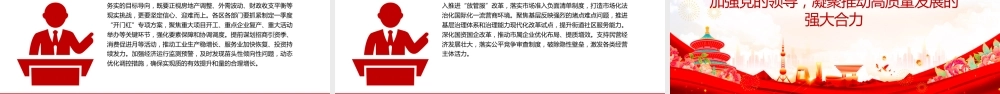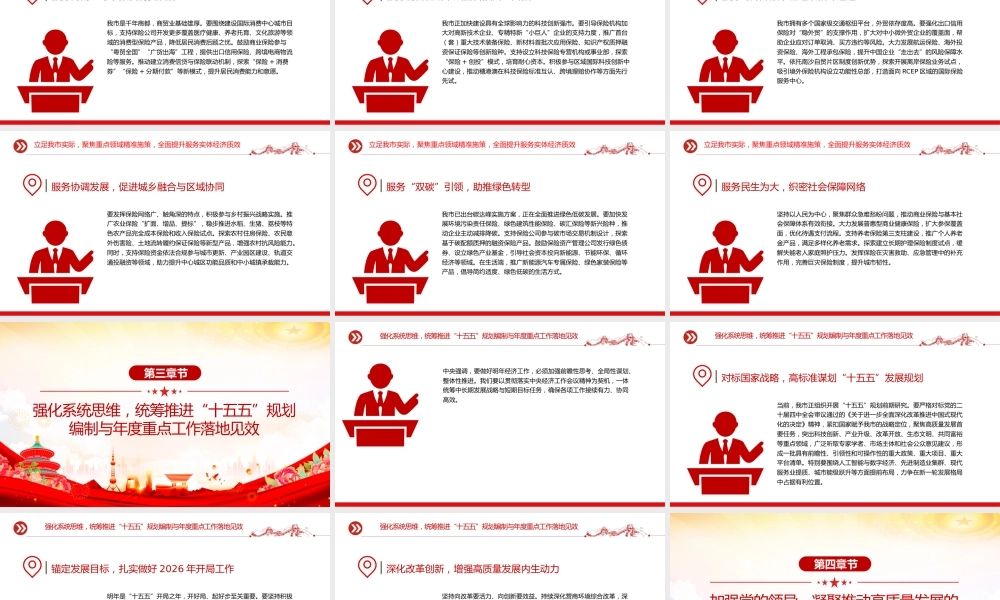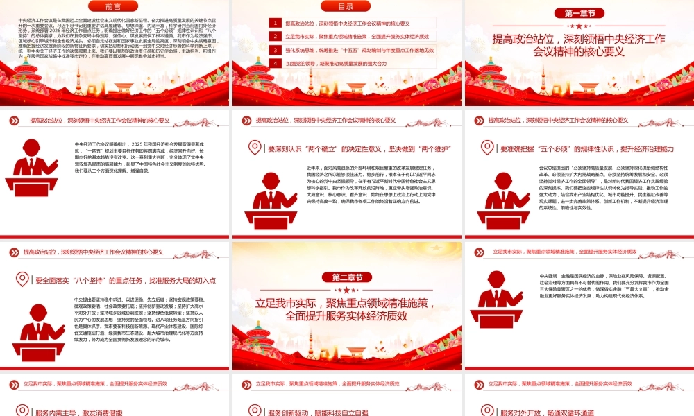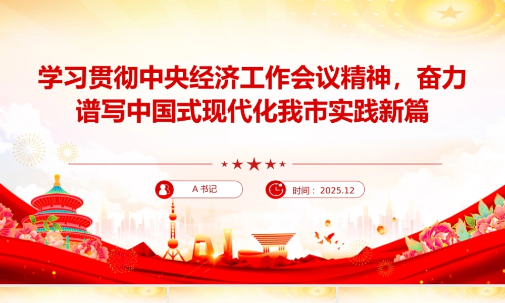 学习贯彻中央经济工作会议精神,奋力谱写中国式现代化我市实践新篇A 书记时间: 2025.12前言中央经济工作会议是在我国迈上全面建设社会主义现代化国家新征程、奋力推进高质量发展的关键节点召开的一次重要会议。习近平总书记的重要讲话高屋建瓴、思想深邃、内涵丰富,科学研判当前国内外经济形势,系统部署 2026 年经济工作重点任务,明确提出做好经济工作的“五个必须”规律性认识和“八个坚持”的总体要求,为我们在复杂变局中稳预期、强信心、谋发展提供了根本遵循。我市作为经济强市、区域核心引擎城市和全省经济龙头,必须自觉站在党和国家事业发展全局的高度,深刻领会中央战略意图,准确把握经济发展新阶段的新特征新要求,切实把思想和行动统一到党中央对经济形势的科学判断上来,统一到中央关于经济工作的决策部署上来。我们要以强烈的政治责任感和历史使命感,主动担当、积极作为,在服务国家战略中找准我市定位,在推动高质量发展中展现省会城市担当。目录1提高政治站位,深刻领悟中央经济工作会议精神的核心要义2立足我市实际,聚焦重点领域精准施策,全面提升服务实体经济质效3强化系统思维,统筹推进“十五五”规划编制与年度重点工作落地见效4加强党的领导,凝聚推动高质量发展的强大合力第一章节提高政治站位,深刻领悟中央经济工作会议精神的核心要义中央经济工作会议明确指出, 2025 年我国经济社会发展取得显著成就,“十四五”规划主要目标任务即将圆满完成,经济回升向好、长期向好的基本趋势没有改变。这一系列重大判断,充分体现了党中央驾驭复杂局面的高超能力,彰显了中国特色社会主义制度的独特优势。我们要从三个方面深化理解、增强自觉。提高政治站位,深刻领悟中央经济工作会议精神的核心要义要深刻认识“两个确立”的决定性意义,坚决做到“两个维护” 近年来,面对风高浪急的外部环境和艰巨繁重的改革发展稳定任务,我国经济之所以能够顶住压力、稳步前行,根本在于有以习近平同志为核心的党中央坚强领导,在于有习近平新时代中国特色社会主义思想科学指引。我市作为改革开放前沿阵地,更应带头增强政治意识、大局意识、核心意识、看齐意识,始终在思想上政治上行动上同党中央保持高度一致,确保我市各项工作始终沿着正确方向前进。提高政治站位,深刻领悟中央经济工作会议精神的核心要义要准确把握“五个必须”的规律性认识,提升经济治理能力 会议总结提出的“必须坚持高质量发展、必须坚持深化供给侧结构性改革、必须坚持扩大内需战略基点、必须坚持统筹发展和安全、必须坚持党对经济工作的全面领导”,是对新时代我国经济工作实践经验的深刻提炼。我们要把这些规律性认识转化为指导实践、推动工作的强大动力,结合我市产业结构优化、城市功能提升、民生福祉改善等现实课题,进一步完善政策体系、创新工作机制,不断提升经济治理的系统性、前瞻性与实效性。提高政治站位,深刻领悟中央经济工作会议精神的核心要义要全面落实“八个坚持”的重点任务,找准服务大局的切入点 中央提出要坚持稳中求进、以进促稳、先立后破;坚持宏观政策要稳、微观政策要活、社会政策要托底;坚持创新驱动发展;坚持扩大高水平对外开放;坚持城乡区域协调发展;坚持绿色低碳转型;坚持以人民为中心的发展思想;坚持党的全面领导。这八项任务既是方向指引,也是具体抓手。我市要在科技创新策源、现代产业体系建设、国际综合交通枢纽打造、绿美我市生态建设、超大城市治理现代化等方面持续发力,努力成为全国贯彻新发展理念的示范城市。提高政治站位,深刻领悟中央经济工作会议精神的核心要义第二章节立足我市实际,聚焦重点领域精准施策,全面提升服务实体经济质效中央强调,金融是国民经济的血脉,保险业在风险保障、资源配置、社会治理等方面具有不可替代的作用。我们要充分发挥我市作为全国三大保险集聚区之一的优势,做深做实金融“五篇大文章”,推动金融业更好服务实体经济发展,助力构建现代化经济体系。立足我市实际,聚焦重点领域精准施策,全面提升服务实体经济质效服务内需主导,激发消费潜能 我市是千年商都,商贸业基础雄厚。要围绕建设国际消...