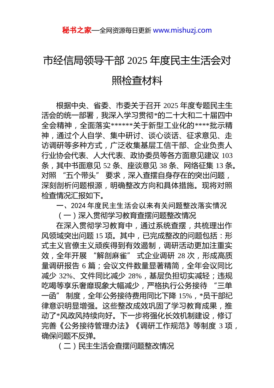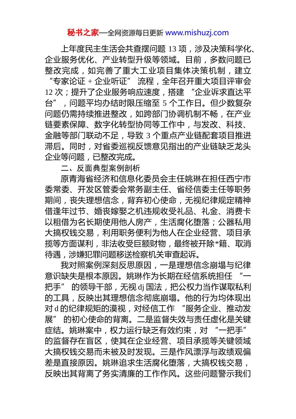 秘书之家—全网资源每日更新 www.mishuzj.com市经信局领导干部 2025 年度民主生活会对照检查材料根据中央、省委、市委关于召开 2025 年度专题民主生活会的统一部署,我深入学习贯彻*的二十大和二十届四中全会精神,全面落实******关于新型工业化的****批示精神,通过个人自学、集中研讨、谈心谈话、征求意见、走访调研等多种方式,广泛收集基层工信干部、企业负责人行业协会代表、人大代表、政协委员等各方面意见建议 103条,其中书面意见 52 条、座谈意见 38 条、网络征集 13 条。对照 “五个带头” 要求,深入查摆自身存在的突出问题,深刻剖析问题根源,明确整改方向和具体措施。现将对照检查情况汇报如下。一、2024 年度民主生活会以来有关问题整改落实情况(一)深入贯彻学习教育查摆问题整改情况在深入贯彻学习教育中,通过系统查摆,共梳理出作风领域突出问题 15 项。其中,已完成整改的问题包括:形式主义官僚主义顽疾得到有效遏制,调研活动更加注重实效,全年开展 “解剖麻雀” 式企业调研 28 次,形成高质量调研报告 6 篇;会议文件数量显著精简,全年会议同比减少 32%、文件同比减少 28%,基层负担切实减轻;违规吃喝等享乐奢靡现象大幅减少,严格执行公务接待 “三单一函” 制度,全年公务接待费用同比下降 15%,*员干部纪律意识明显增强。这些整改成效巩固了学习教育成果,推动了*风政风持续向好。下一步将强化长效机制建设,修订完善《公务接待管理办法》《调研工作规范》等制度 3 项,确保问题不反弹。(二)民主生活会查摆问题整改情况秘书之家—全网资源每日更新 www.mishuzj.com上年度民主生活会共查摆问题 13 项,涉及决策科学化、企业服务优化、产业转型升级等领域。目前,多数问题已整改完成,如完善了重大工业项目集体决策机制,建立“专家论证 + 企业听证” 流程,全年召开重大项目评审会12 次;提升了企业服务响应速度,搭建 “企业诉求直达平台”,问题平均办结时限压缩至 5 个工作日。但少数复杂问题仍需持续推进整改,如跨部门协调机制不畅,在产业链要素保障、数字化转型协同等工作中,与发改、科技、金融等部门联动不足,导致 3 个重点产业链配套项目推进滞后。同时,对省委巡视反馈意见指出的产业链缺乏龙头企业等问题,已整改完成。二、反面典型案例剖析原青海省经济和信息化委员会主任姚琳在担任西宁市委常委、开发区管委会常务副主任、省经信委主任等职务期间,丧失理想信念,背弃初心使命,无视纪律规定精神借逢年过节、婚丧嫁娶之机违规收受礼品、礼金、消费卡以租借为名长期使用他人房产,生活腐化堕落;公器私用大搞权钱交易,利用职务便利为他人在企业经营、项目承揽等方面谋利,非法收受巨额财物,最终被开除*籍、取消待遇,涉嫌犯罪问题移送检察机关审查起诉。我对照案例深刻反思原因,一是理想信念崩塌与纪律意识缺失是根本原因。姚琳作为长期在经信系统担任 “一把手” 的领导干部,无视 dj 国法,把公权力当作谋取私利的工具,反映出其理想信念彻底崩塌。他的行为均体现出对 d 的纪律规矩的漠视,对经信工作 “服务企业、推动发展” 的初心使命的背离。二是监督失效与责任虚化是关键症结。姚琳案中,权力运行缺乏有效约束,对 “一把手”的监督存在盲区,使其在企业经营、项目承揽等关键领域大搞权钱交易而未被及时发现。三是作风漂浮与政绩观偏差是直接原因。姚琳追求生活腐化堕落,大搞权钱交易,反映出其背离了务实清廉的工作作风。这些问题警示我们秘书之家—全网资源每日更新 www.mishuzj.com经信工作直接关系企业发展和工业经济大局,作风不实、为政不廉将严重损害营商环境和*和政府形象。针对上述案例,我坚持举一反三、深刻反思,具体做到:一是强化思想铸魂,筑牢纪律防线。将案例纳入*组理论学习中心组学习和干部警示教育内容,每季度开展 1 次专题研讨,推动*员干部以案为鉴、自我警醒,将纪律意识内化于心、外化于行。二是完善制度执行,构建监督合力聚焦工业项目审批、资金奖补、企业服务等关键环节,堵塞制度漏洞,修订《工业项目资金管理办法》《干部履职监督...