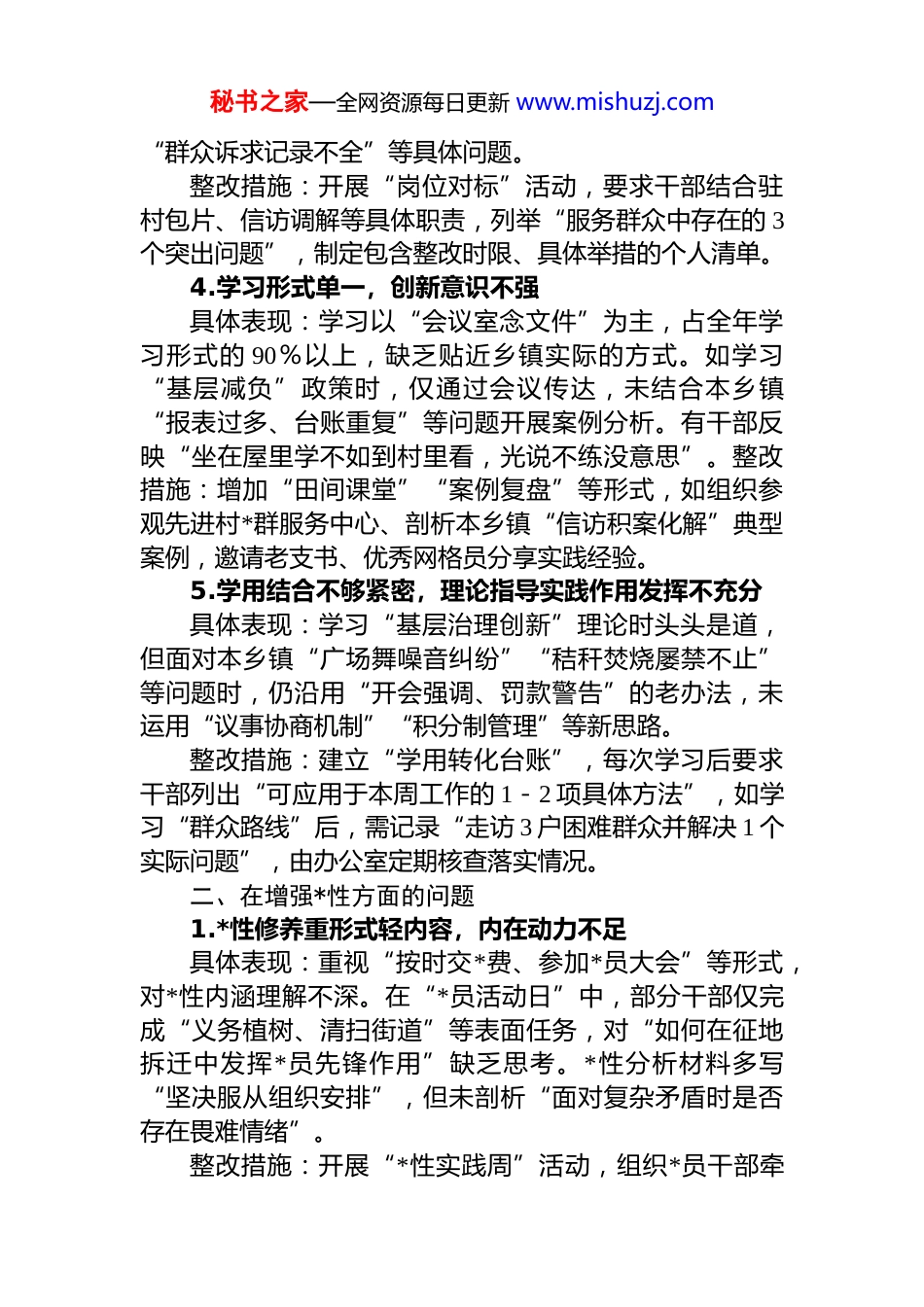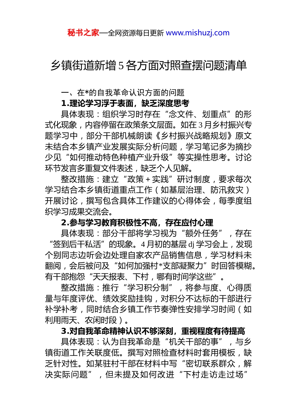 秘书之家—全网资源每日更新 www.mishuzj.com乡镇街道新增 5 各方面对照查摆问题清单一、在*的自我革命认识方面的问题1.理论学习浮于表面,缺乏深度思考具体表现:组织学习时存在“念文件、划重点”的形式化现象,内容停留在政策条文层面。如在 3 月乡村振兴专题学习中,部分干部机械朗读《乡村振兴战略规划》原文未结合本乡镇产业发展实际分析问题,学习笔记多为摘抄少见“如何推动特色种植产业升级”等实操性思考。讨论环节发言多重复文件表述,缺乏个人见解。整改措施:建立“政策+实践”研讨制度,要求每次学习结合本乡镇街道重点工作(如基层治理、防汛救灾)开展讨论,撰写包含具体工作建议的心得体会,每季度组织学习成果交流会。2.参与学习教育积极性不高,存在应付心理具体表现:部分干部将学习视为“额外任务”,存在“签到后干私活”的现象。4 月初的基层 dj 学习会上,发现个别同志边听会边处理自家农产品销售信息,学习材料未翻阅,会后被问及“如何加强村*支部凝聚力”时回答模糊。有干部抱怨“天天报表、下村,哪有时间学这些”。整改措施:推行“学习积分制”,将参与度、心得质量与年度评优、绩效奖励挂钩,对积分不达标的干部进行补学补考,同时结合乡镇工作节奏弹性安排学习时间(如利用雨天、农闲时段)。3.对自我革命精神认识不够深刻,重视程度有待提高具体表现:认为自我革命是“机关干部的事”,与乡镇街道工作关联度低。撰写对照检查材料时套用模板,缺乏针对性。如某驻村干部在材料中写“密切联系群众,解决实际问题”,但未提及如何改进“下村走访走过场”秘书之家—全网资源每日更新 www.mishuzj.com“群众诉求记录不全”等具体问题。整改措施:开展“岗位对标”活动,要求干部结合驻村包片、信访调解等具体职责,列举“服务群众中存在的 3个突出问题”,制定包含整改时限、具体举措的个人清单。4.学习形式单一,创新意识不强具体表现:学习以“会议室念文件”为主,占全年学习形式的 90%以上,缺乏贴近乡镇实际的方式。如学习“基层减负”政策时,仅通过会议传达,未结合本乡镇“报表过多、台账重复”等问题开展案例分析。有干部反映“坐在屋里学不如到村里看,光说不练没意思”。整改措施:增加“田间课堂”“案例复盘”等形式,如组织参观先进村*群服务中心、剖析本乡镇“信访积案化解”典型案例,邀请老支书、优秀网格员分享实践经验。5.学用结合不够紧密,理论指导实践作用发挥不充分具体表现:学习“基层治理创新”理论时头头是道,但面对本乡镇“广场舞噪音纠纷”“秸秆焚烧屡禁不止”等问题时,仍沿用“开会强调、罚款警告”的老办法,未运用“议事协商机制”“积分制管理”等新思路。整改措施:建立“学用转化台账”,每次学习后要求干部列出“可应用于本周工作的 1-2 项具体方法”,如学习“群众路线”后,需记录“走访 3 户困难群众并解决 1 个实际问题”,由办公室定期核查落实情况。二、在增强*性方面的问题1.*性修养重形式轻内容,内在动力不足具体表现:重视“按时交*费、参加*员大会”等形式,对*性内涵理解不深。在“*员活动日”中,部分干部仅完成“义务植树、清扫街道”等表面任务,对“如何在征地拆迁中发挥*员先锋作用”缺乏思考。*性分析材料多写“坚决服从组织安排”,但未剖析“面对复杂矛盾时是否存在畏难情绪”。整改措施:开展“*性实践周”活动,组织*员干部牵秘书之家—全网资源每日更新 www.mishuzj.com头解决 1 件群众反映强烈的问题(如修复破损村道、协调子女入学),并在专题会上汇报“如何用*性原则破解难题”,倒逼深入自我剖析。2.理想信念教育重视不够,学习主动性有待加强具体表现:认为理想信念教育“虚”,不如“种养殖技术培训”实用。*课学习中,部分干部注意力不集中,课后讨论时称“这些大道理对解决村民纠纷没用”。某社区干部甚至表示“只要把低保发准了,学不学理论无所谓”整改措施:开展“初心故事分享会”,邀请参与过脱贫攻坚、抗疫的*员讲述“如何用信念支撑工作”,结合乡镇实际设计“理想信念与具体工作”对照表(如“在违建拆除中如何坚守原则”)。3.*员意识有所淡...