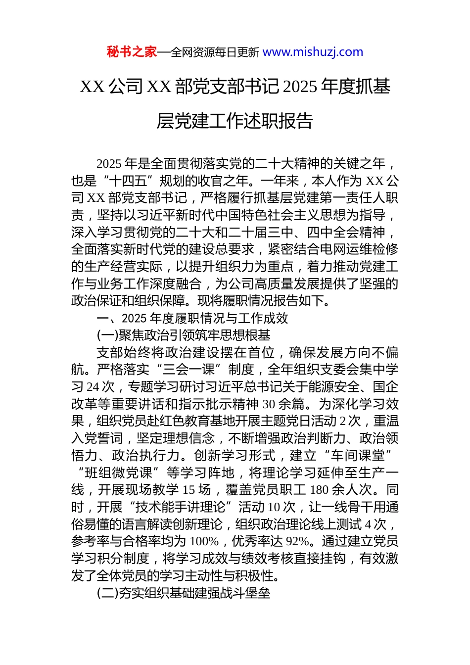 秘书之家—全网资源每日更新 www.mishuzj.comXX 公司 XX 部党支部书记 2025 年度抓基层党建工作述职报告2025 年是全面贯彻落实党的二十大精神的关键之年,也是“十四五”规划的收官之年。一年来,本人作为 XX 公司 XX 部党支部书记,严格履行抓基层党建第一责任人职责,坚持以习近平新时代中国特色社会主义思想为指导,深入学习贯彻党的二十大和二十届三中、四中全会精神,全面落实新时代党的建设总要求,紧密结合电网运维检修的生产经营实际,以提升组织力为重点,着力推动党建工作与业务工作深度融合,为公司高质量发展提供了坚强的政治保证和组织保障。现将履职情况报告如下。一、2025 年度履职情况与工作成效(一)聚焦政治引领筑牢思想根基支部始终将政治建设摆在首位,确保发展方向不偏航。严格落实“三会一课”制度,全年组织支委会集中学习 24 次,专题学习研讨习近平总书记关于能源安全、国企改革等重要讲话和指示批示精神 30 余篇。为深化学习效果,组织党员赴红色教育基地开展主题党日活动 2 次,重温入党誓词,坚定理想信念,不断增强政治判断力、政治领悟力、政治执行力。创新学习形式,建立“车间课堂”“班组微党课”等学习阵地,将理论学习延伸至生产一线,开展现场教学 15 场,覆盖党员职工 180 余人次。同时,开展“技术能手讲理论”活动 10 次,让一线骨干用通俗易懂的语言解读创新理论,组织政治理论线上测试 4 次,参考率与合格率均为 100%,优秀率达 92%。通过建立党员学习积分制度,将学习成效与绩效考核直接挂钩,有效激发了全体党员的学习主动性与积极性。(二)夯实组织基础建强战斗堡垒秘书之家—全网资源每日更新 www.mishuzj.com支部着力优化组织设置,将党小组建在专业班组和重点工程项目上,实现了党组织在基层单元的全覆盖。年内圆满完成支部换届选举,新一届支委 5 人中,技术骨干占比达到 80%,平均年龄 38 岁,本科及以上学历占比 100%,队伍结构更趋年轻化、专业化。严格党员发展与管理,全年发展生产一线技术骨干 2 名,培养入党积极分子 5 名。深入开展“党员先锋指数”考评,实施动态积分管理,设立党员责任区 12 个、党员示范岗 8 个,实现了关键岗位有党员、重要任务靠党员的良好局面。加强阵地建设,全年召开党员大会 4 次、支委会 12 次、党小组会 48 次,开展主题党日活动 12 次。支部党员活动室经过标准化升级,新增学习书籍 300 余册,为组织生活提供了坚实保障。年内,支部获评市级“五星级党支部”荣誉称号,3 名党员荣获公司级“技术能手”称号。(三)深化党建融合驱动中心工作支部坚持围绕生产经营抓党建,抓好党建促发展。建立“党建+中心工作”深度融合机制,将党建要求嵌入电网运维、抢修保电、技术改造等核心业务流程,制定并落实融合任务清单 45 项。组织开展“技术攻关党旗红”活动,成立党员技术攻关小组 3 个,聚焦高海拔地区设备运维难题,成功解决技术难题 11 项,其中一项获得公司技术革新三等奖,创造直接经济效益约 60 万元。搭建“党员金点子”平台,全年征集到关于提质增效、安全生产等方面的合理化建议 58 条,经评估采纳实施 22 条,年化经济效益超过 80 万元。深入实施“党员带徒”计划,16 名经验丰富的党员师傅与青年员工结成对子,成功培养技术骨干 9 名。通过党建引领,部门年度设备故障抢修到达时间缩短 15%,电网设备健康水平稳步提升,客户满意度提升至 99.8%。(四)严抓作风纪律涵养清风正气支部深入开展学习教育,持之以恒加强作风建设。组织全体党员专题学习中央八项规定及其实施细则精神 4 次,秘书之家—全网资源每日更新 www.mishuzj.com开展警示教育 2 次,观看警示教育片,用身边事教育身边人。聚焦“四风”问题隐形变异新动向,组织开展自查自纠,排查整改苗头性问题 6 项,建立健全长效防范机制 3项。大力精简会议文件,全年会议数量同比减少 20%,文件数量减少 15%。加强廉政风险防控,针对物资采购、工程外委等关键环节,排查廉政风险点 25 个,制定防控措施30 项。坚持抓早抓小,支部书记与支委委员、...