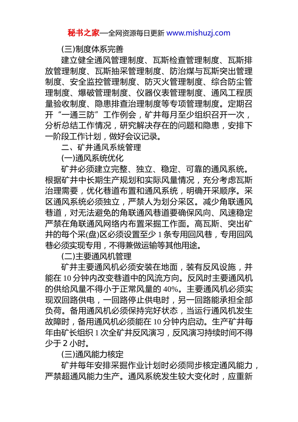 秘书之家—全网资源每日更新 www.mishuzj.comxx 煤矿企业(扩大)一通三防管理制度煤矿安全生产的核心在于瓦斯、煤尘、火灾等重大灾害的有效防治。“一通三防”工作是煤矿安全生产的生命线,关系到每一位矿工的生命安全和矿井的可持续发展。为深入贯彻新修订的《煤矿安全规程》精神,落实“安全第一、预防为主、综合治理”的方针,强化矿井通风、瓦斯、煤尘、火灾防治工作,构建“通风可靠、抽采达标、监控有效、管理到位”的瓦斯综合治理体系,结合本矿实际,特制定本制度。一、组织机构与责任体系(一)组织机构设置矿井必须建立健全“一通三防”管理体系,设置专门的通风、瓦斯、防尘、防灭火管理机构。高瓦斯矿井、煤与瓦斯突出矿井必须设置专职通风副总工程师,协助总工程师开展“一通三防”技术管理工作。通风科(部)作为“一通三防”专业管理部门,配备满足工作需要的专业技术人员和管理人员。高瓦斯矿井至少配备 1 名第一学历为通风类专业全日制本科以上学历的专业技术人员,建立瓦斯实验室,配齐配足实验设施设备和专职实验人员。(二)责任体系建设建立以矿长为第一责任人的“一通三防”责任体系和以总工程师为首的技术管理体系。矿长对全矿“一通三防”工作全面负责,把防止瓦斯、煤尘爆炸和火灾事故作为安全工作的重中之重。总工程师负责“一通三防”技术管理工作,组织编制矿井通风、瓦斯、防突、防尘、防灭火等专项设计和安全技术措施。各级管理人员、各部门、各岗位必须明确“一通三防”安全职责,层层签订安全生产责任书,建立健全考核奖惩机制。秘书之家—全网资源每日更新 www.mishuzj.com(三)制度体系完善建立健全通风管理制度、瓦斯检查管理制度、瓦斯排放管理制度、瓦斯抽采管理制度、防治煤与瓦斯突出管理制度、安全监控管理制度、防灭火管理制度、综合防尘管理制度、爆破管理制度、仪器仪表管理制度、通风工程质量验收制度、隐患排查治理制度等专项管理制度。定期召开“一通三防”工作例会,矿井每月至少组织召开一次,分析总结工作情况,研究解决存在的问题和隐患,安排下一阶段工作计划,做好会议记录。二、矿井通风系统管理(一)通风系统优化矿井必须建立完整、独立、稳定、可靠的通风系统。根据矿井中长期生产规划和实际风量情况,充分考虑瓦斯治理需要,优化巷道布置和通风系统,明确开采顺序。采区通风系统必须独立,严禁人为划分采区。减少角联通风巷道,对无法避免的角联通风巷道要确保风向、风速稳定严禁在角联通风网络内布置采掘工作面。高瓦斯、突出矿井的每个采(盘)区必须设置至少 1 条专用回风巷,专用回风巷必须实现专用,不得兼做运输等其他用途。(二)主要通风机管理矿井主要通风机必须安装在地面,装有反风设施,并能在 10 分钟内改变巷道中的风流方向。反风时主要通风机的供给风量不得小于正常风量的 40%。主要通风机必须实现双回路供电,一回路停止供电时,另一回路能承担全部负荷。备用通风机必须保持完好状态,当运行通风机发生故障时,备用通风机必须能在 10 分钟内启动。生产矿井每年由矿长组织 1 次全矿井反风演习,反风演习持续时间不得少于 2 小时。(三)通风能力核定矿井每年安排采掘作业计划时必须同步核定通风能力,严禁超通风能力生产。通风系统发生较大变化时,应重新秘书之家—全网资源每日更新 www.mishuzj.com进行通风能力核定。矿井有效风量率不得低于 85%,配风合格率应达到 100%。主要通风机外部漏风率在无提升任务时不得超过 5%,有提升任务时不得超过 15%。井下各用风地点必须按规定配足风量,确保风量充足、风流稳定,风速符合规程规定。(四)局部通风管理掘进工作面必须采用局部通风机供风,局部通风机必须采用“三专两闭锁”。高瓦斯矿井、煤与瓦斯突出矿井的煤巷、半煤岩巷和有瓦斯涌出的岩巷掘进工作面必须按规定安装双风机、双电源并能自动切换。风筒出口距工作面的距离必须符合作业规程规定,确保工作面风量充足、风流稳定。采煤工作面必须采用全风压通风,严禁使用局部通风机供风或稀释瓦斯。(五)通风设施管理矿井通风设施包括风门、风桥、风窗、密闭、挡风墙等,必须按照设计要求设置,确保构...