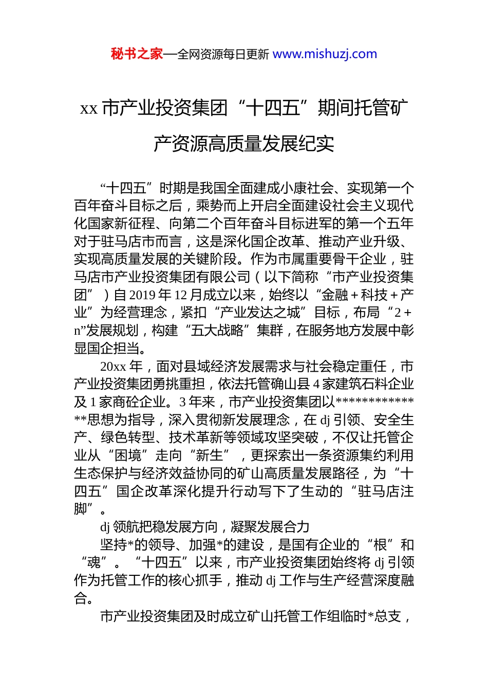 秘书之家—全网资源每日更新 www.mishuzj.comxx 市产业投资集团“十四五”期间托管矿产资源高质量发展纪实“十四五”时期是我国全面建成小康社会、实现第一个百年奋斗目标之后,乘势而上开启全面建设社会主义现代化国家新征程、向第二个百年奋斗目标进军的第一个五年对于驻马店市而言,这是深化国企改革、推动产业升级、实现高质量发展的关键阶段。作为市属重要骨干企业,驻马店市产业投资集团有限公司(以下简称“市产业投资集团”)自 2019 年 12 月成立以来,始终以“金融+科技+产业”为经营理念,紧扣“产业发达之城”目标,布局“2+n”发展规划,构建“五大战略”集群,在服务地方发展中彰显国企担当。20xx 年,面对县域经济发展需求与社会稳定重任,市产业投资集团勇挑重担,依法托管确山县 4 家建筑石料企业及 1 家商砼企业。3 年来,市产业投资集团以**************思想为指导,深入贯彻新发展理念,在 dj 引领、安全生产、绿色转型、技术革新等领域攻坚突破,不仅让托管企业从“困境”走向“新生”,更探索出一条资源集约利用生态保护与经济效益协同的矿山高质量发展路径,为“十四五”国企改革深化提升行动写下了生动的“驻马店注脚”。dj 领航把稳发展方向,凝聚发展合力坚持*的领导、加强*的建设,是国有企业的“根”和“魂”。“十四五”以来,市产业投资集团始终将 dj 引领作为托管工作的核心抓手,推动 dj 工作与生产经营深度融合。市产业投资集团及时成立矿山托管工作组临时*总支,秘书之家—全网资源每日更新 www.mishuzj.com下设 4 个临时*支部,将*支部建在矿上,确保*的领导贯穿托管全流程。通过开展元宵节文化、登山健身、植树节、爱心助考等主题*日活动,强化*员责任意识;设立*员示范岗,选优配强*员干部和技术骨干,组建攻坚组、先锋队,在安全生产、降本增效等关键任务中冲锋在前。同时,注重*风廉政建设,严守政治纪律规矩,营造忠诚、过硬、清廉的干事氛围,为托管事业注入强劲红色动能。在 dj 引领下,托管工作组临时*总支凝聚起心往一处想、劲往一处使的强大合力,成为推动矿山高质量发展的“主心骨”。管理革新科学规范运营,激活内生动力托管初期,面对 5 家企业历史遗留问题多、管理松散、经营困难的局面,市产业投资集团以“破立并举”的决心推进管理革新,仅用 1 个月便实现复工复产,为后续发展奠定基础。建强专业团队:从集团系统内抽调经营、金融、法务、业务骨干,聘请管理经验丰富的大型国企专家和行业资深人士,组建专业化管理团队,快速梳理业务流程,建立健全行政、人事、财务、安全等全环节规章制度,形成科学高效管理体系。创新管理模式:推行“6s+军事化”管理(整理、整顿、清扫、清洁、素养、安全+晨训、内务军事化),制定标准化工作流程,压缩中间环节;实施“网格化”治理,*员带头亮身份、践承诺,当好“贴心人”“跑腿人”,化解职工心结、排查隐患、宣传政策,实现“小事不出网格、大事不出企业”。集聚专业人才:成立矿山劳模创新工作室,汇聚全国劳模 1 名、省级劳模 1 名、市级劳模 1 名、“五一劳动奖章”获得者 2 名,通过社会公开招聘形式引进采矿、地质、测绘、注册安全工程师等专业人员 200 多人,形成资源获取、安全生产、营销管理三大团队,构建“资源全生命周期管秘书之家—全网资源每日更新 www.mishuzj.com理”体系,为矿山可持续发展提供“智力”支撑。安全为基筑牢生命防线,守牢发展底线“人民至上、生命至上。”市产业投资集团始终将安全生产作为托管工作的“生命线”,统筹发展与安全,构建本质安全型企业。严格落实全员安全生产责任制,推行安全风险分级管控,构建横向到边、纵向到底的安全管理体系;在矿山开采中率先采用电子数码微差爆破技术,大幅降低了爆破震动、爆破飞石的危害,装运效率得到显著提升。同时,健全应急救援体系,与当地公安、消防、医院建立共建机制2024 年 11 月代表驻马店市参加河南省矿山救援队伍大比武荣获“优秀组织奖”“医疗急救第三名”,应急能力获权威认可。一系列举措推动安全管理从“被动应对”转向“主动防控”,为生...
