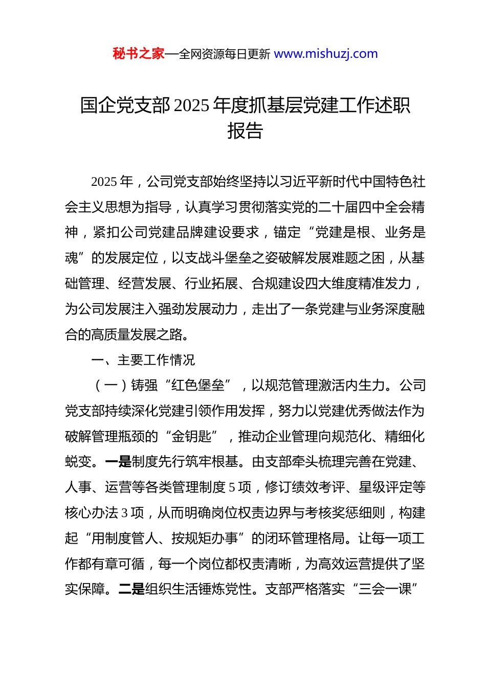 秘书之家—全网资源每日更新 www.mishuzj.com国企党支部 2025 年度抓基层党建工作述职报告 2025 年,公司党支部始终坚持以习近平新时代中国特色社会主义思想为指导,认真学习贯彻落实党的二十届四中全会精神,紧扣公司党建品牌建设要求,锚定“党建是根、业务是魂”的发展定位,以支战斗堡垒之姿破解发展难题之困,从基础管理、经营发展、行业拓展、合规建设四大维度精准发力,为公司发展注入强劲发展动力,走出了一条党建与业务深度融合的高质量发展之路。一、主要工作情况(一)铸强“红色堡垒”,以规范管理激活内生力。公司党支部持续深化党建引领作用发挥,努力以党建优秀做法作为破解管理瓶颈的“金钥匙”,推动企业管理向规范化、精细化蜕变。一是制度先行筑牢根基。由支部牵头梳理完善在党建、人事、运营等各类管理制度 5 项,修订绩效考评、星级评定等核心办法 3 项,从而明确岗位权责边界与考核奖惩细则,构建起“用制度管人、按规矩办事”的闭环管理格局。让每一项工作都有章可循,每一个岗位都权责清晰,为高效运营提供了坚实保障。二是组织生活锤炼党性。支部严格落实“三会一课”秘书之家—全网资源每日更新 www.mishuzj.com制度,创新推行“理论学习+实践研讨”模式,由党支部书记每月主持党员大会,每季度讲授专题党课,全年累计召开党员大会 15 次、主题党日活动 11 次、专题党课 4 次,开展红色现场教育与专题研讨 30 余次。以高质量的组织生活会开展让支部真正成为淬炼党员党性的“大熔炉”,筑牢了基层党组织战斗堡垒。三是理论武装凝聚共识。支部建立“线上+线下”立体化学习机制,组织党员干部深学细悟习近平新时代中国特色社会主义思想和党的二十大精神,结合通信行业政策开展专题学习 20 余次。全年人均线上学习时长超 20 小时,推动理论学习成果转化为破解发展难题的具体举措,实现全员政治素养与业务能力同步提升。(二)亮明“先锋旗帜”,以精准施策跑出加速度。公司党支部将党员先锋模范作用融入经营一线,以务实举措推动提质增效。一是精准研判靶向发力。支部建立核心指标周分析制度,每周梳理用户增长、营收数据,定期组织党员骨干开展市场调研,精准掌握竞争态势与客户需求,确保经营策略不偏航、不走样。二是党员攻坚突破瓶颈。针对用户保有、营收增长等重点任务,党支部迅速成立党员突击队,实行“周调度、月复盘”机制,将任务分解到岗、责任落实到人。在党员带动下,“岗区队室”融合成效显著,截至三季度,党员先锋岗完成企秘书之家—全网资源每日更新 www.mishuzj.com宽*户,党员责任区与突击队累计发展宽带*余户,创新工作室实现收入贡献*余万元。三是优质服务赢得民心。支部坚守“以客户为根、服务为本”理念,设立党员先锋服务岗,开展客户满意度专项提升行动。通过优化服务流程、提升响应效率,及时解决客户急难愁盼问题,截至 10 月客户服务满意度斩获满分10 分,以服务口碑筑牢经营发展根基。(三)拓展“融合路径”,以多元拓展夯实发展根基。围绕“稳收入、扩规模、提质量”目标,公司党支部以党建为纽带,全方位拓展业务版图,将组织优势转化为发展优势。一是党建联建深化集团合作。支部建立党政机关、企事业单位常态化拜访机制,由党支部书记带队每月走访关键客户,深入挖掘信息化合作商机。全年累计走访单位 100 余家,达成合作 10 多项,成功签订 2 项党建强链集团业务协议,涵盖 6 类业务,实现收入*万余元,以党建“红纽带”联结发展“新商机”。二是精准对接抢占行业高地。支部依托资源优势,聚焦教育、医疗、政务等重点领域,组织党员技术骨干组建专项小组,量身定制智慧校园、远程医疗等解决方案。全年成功拓展 4 家行业客户,贡献收入*余万元,实现行业市场份额稳步提升。三是细分市场挖掘增长潜力。针对沿街商铺、小微企业需求,党支部推出专线接入、智慧安防等个性化套餐,组织党员营销团队开展上门秘书之家—全网资源每日更新 www.mishuzj.com服务,累计实现专线延伸业务收入*万元、云业务收入*万余元,为公司收入增长注入持续动力。(四)筑牢“廉洁防线”,以合规建设护航长远...