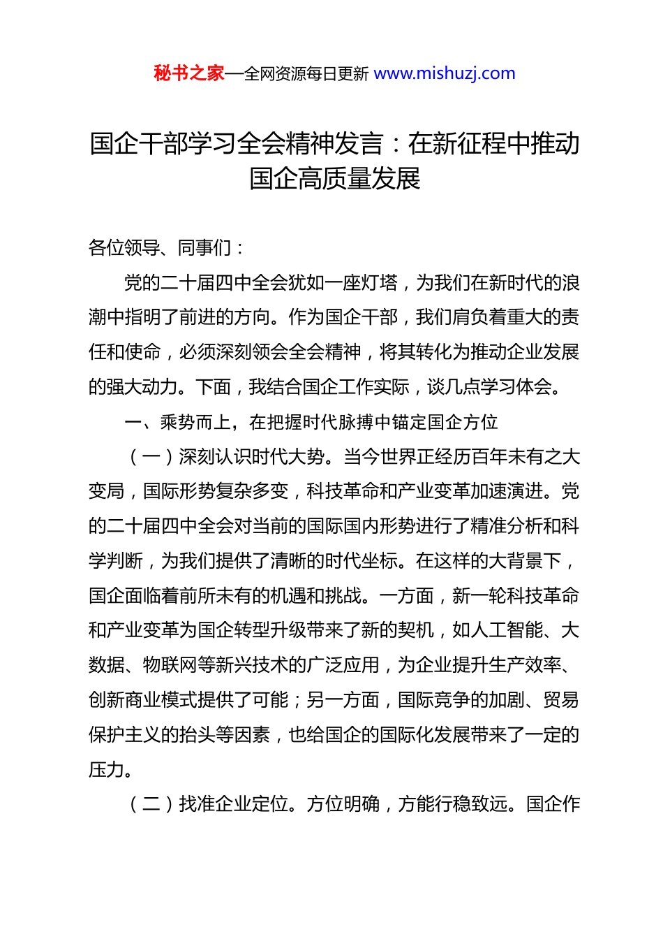 秘书之家—全网资源每日更新 www.mishuzj.com国企干部学习全会精神发言:在新征程中推动国企高质量发展 各位领导、同事们:党的二十届四中全会犹如一座灯塔,为我们在新时代的浪潮中指明了前进的方向。作为国企干部,我们肩负着重大的责任和使命,必须深刻领会全会精神,将其转化为推动企业发展的强大动力。下面,我结合国企工作实际,谈几点学习体会。一、乘势而上,在把握时代脉搏中锚定国企方位(一)深刻认识时代大势。当今世界正经历百年未有之大变局,国际形势复杂多变,科技革命和产业变革加速演进。党的二十届四中全会对当前的国际国内形势进行了精准分析和科学判断,为我们提供了清晰的时代坐标。在这样的大背景下,国企面临着前所未有的机遇和挑战。一方面,新一轮科技革命和产业变革为国企转型升级带来了新的契机,如人工智能、大数据、物联网等新兴技术的广泛应用,为企业提升生产效率、创新商业模式提供了可能;另一方面,国际竞争的加剧、贸易保护主义的抬头等因素,也给国企的国际化发展带来了一定的压力。(二)找准企业定位。方位明确,方能行稳致远。国企作秘书之家—全网资源每日更新 www.mishuzj.com为国民经济的重要支柱,必须在时代大势中找准自己的定位。我们要紧紧围绕国家战略需求,聚焦主责主业,积极参与国家重大项目建设,为国家的经济发展和社会稳定做出贡献。例如,在基础设施建设领域,国企要加大对交通、能源、水利等重大项目的投资和建设力度,提高国家的基础设施水平;在科技创新领域,国企要发挥引领作用,加大研发投入,突破关键核心技术,推动产业升级。同时,国企还要积极履行社会责任,关注民生福祉,促进社会公平正义。二、坚定自信,在增强战略定力中走好国企发展之路(一)坚定制度自信。党的二十届四中全会强调了中国特色社会主义制度的显著优势,为我们坚定制度自信提供了坚实的理论基础。国企是中国特色社会主义制度的重要物质基础和政治基础,我们要深刻认识到中国特色社会主义制度的优越性,坚定走中国特色国有企业改革发展道路的信心。在企业发展过程中,我们要坚持党的领导,加强党的建设,充分发挥党组织的政治核心和领导核心作用,确保企业的发展方向与国家战略保持一致。(二)增强战略定力。在复杂多变的市场环境中,国企要保持战略定力,不为短期的市场波动所左右。我们要制定科学合理的发展战略,明确企业的发展目标和方向,并持之以恒地秘书之家—全网资源每日更新 www.mishuzj.com加以推进。例如,在产业布局方面,国企要根据自身的优势和市场需求,选择具有发展潜力的产业进行投资和布局,避免盲目跟风和多元化扩张。同时,国企还要加强风险管理,建立健全风险预警机制,及时应对各种风险挑战,确保企业的稳健发展。三、担当实干,在落实目标任务中办好国企之事(一)聚焦主责主业,推动产业升级。国企要聚焦主责主业,集中资源和精力,做强做优做大核心业务。我们要加大对传统产业的技术改造和升级力度,提高产业的附加值和竞争力。例如,在制造业领域,国企要推进智能制造,提高生产自动化、智能化水平,降低生产成本,提高产品质量;在服务业领域,国企要加强服务创新,提高服务质量和效率,满足客户的多样化需求。同时,国企还要积极培育新兴产业,抢占未来产业发展的制高点。例如,在新能源、新材料、生物医药等领域,国企要加大研发投入,培育一批具有自主知识产权和核心竞争力的新兴产业集群。(二)强化科技创新,引领新质生产力发展科技创新是企业发展的第一动力。国企要强化科技创新,加大研发投入,建立健全科技创新体系,提高企业的自主创新能力。我们要加强与高校、科研机构的合作,建立产学研用协同创新机制,促进秘书之家—全网资源每日更新 www.mishuzj.com科技成果的转化和应用。例如,在人工智能领域,国企要加强与高校和科研机构的合作,开展人工智能技术的研发和应用,推动人工智能与实体经济的深度融合;在新能源领域,国企要加大对新能源技术的研发投入,提高新能源的利用效率,推动能源结构的优化升级。同时,国企还要加强人才培养和引进,吸引一批高素质的科技人才和管理人才,为企业的科...