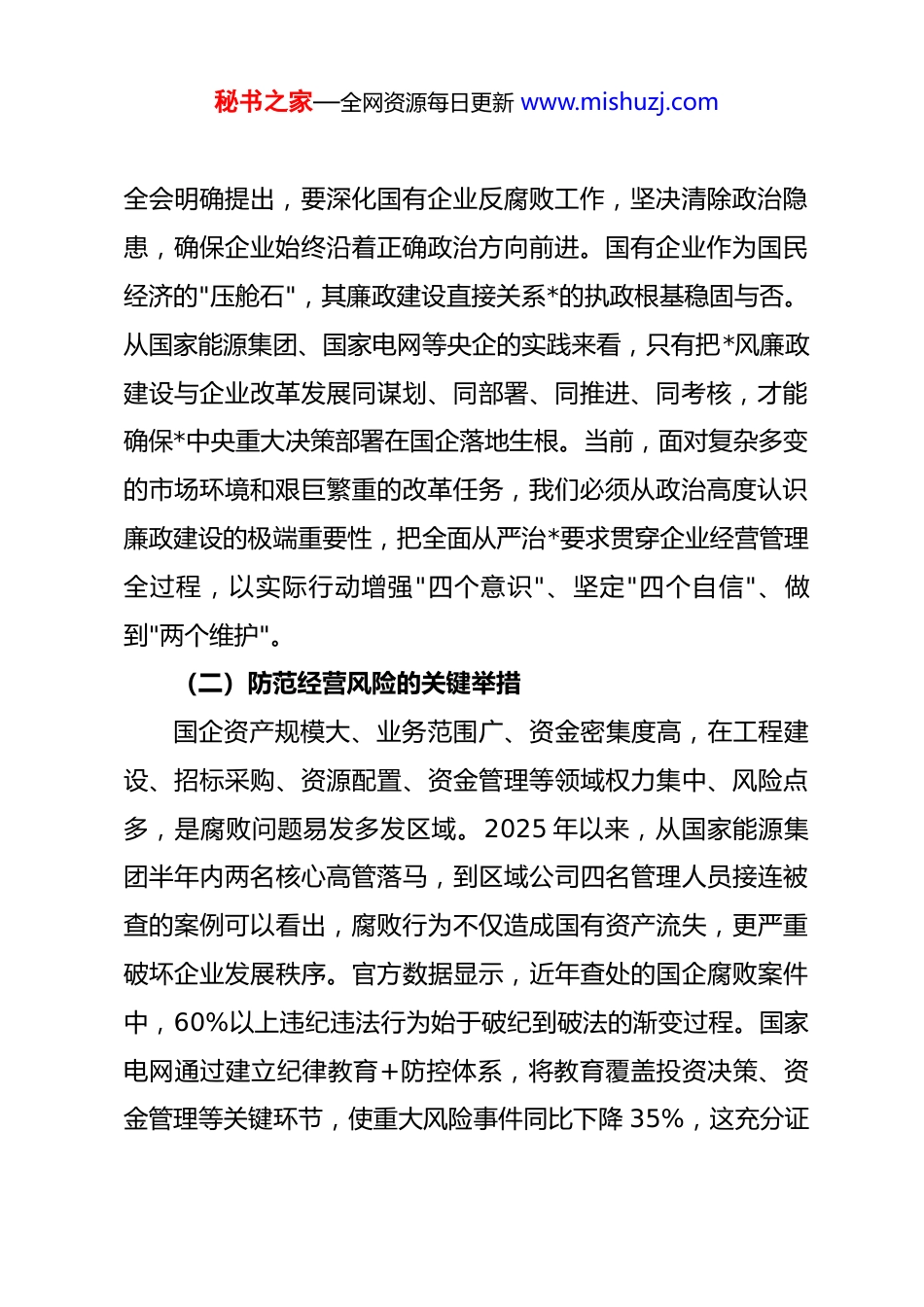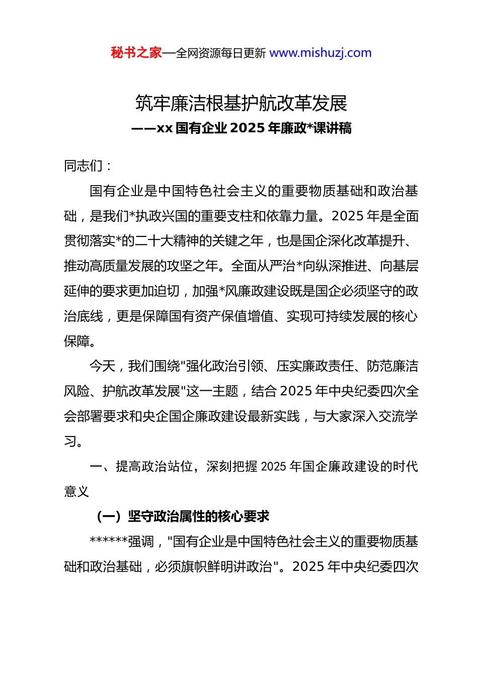 秘书之家—全网资源每日更新 www.mishuzj.com筑牢廉洁根基护航改革发展——xx 国有企业 2025 年廉政*课讲稿同志们:国有企业是中国特色社会主义的重要物质基础和政治基础,是我们*执政兴国的重要支柱和依靠力量。2025 年是全面贯彻落实*的二十大精神的关键之年,也是国企深化改革提升、推动高质量发展的攻坚之年。全面从严治*向纵深推进、向基层延伸的要求更加迫切,加强*风廉政建设既是国企必须坚守的政治底线,更是保障国有资产保值增值、实现可持续发展的核心保障。今天,我们围绕"强化政治引领、压实廉政责任、防范廉洁风险、护航改革发展"这一主题,结合 2025 年中央纪委四次全会部署要求和央企国企廉政建设最新实践,与大家深入交流学习。一、提高政治站位,深刻把握 2025 年国企廉政建设的时代意义(一)坚守政治属性的核心要求******强调,"国有企业是中国特色社会主义的重要物质基础和政治基础,必须旗帜鲜明讲政治"。2025 年中央纪委四次秘书之家—全网资源每日更新 www.mishuzj.com全会明确提出,要深化国有企业反腐败工作,坚决清除政治隐患,确保企业始终沿着正确政治方向前进。国有企业作为国民经济的"压舱石",其廉政建设直接关系*的执政根基稳固与否。从国家能源集团、国家电网等央企的实践来看,只有把*风廉政建设与企业改革发展同谋划、同部署、同推进、同考核,才能确保*中央重大决策部署在国企落地生根。当前,面对复杂多变的市场环境和艰巨繁重的改革任务,我们必须从政治高度认识廉政建设的极端重要性,把全面从严治*要求贯穿企业经营管理全过程,以实际行动增强"四个意识"、坚定"四个自信"、做到"两个维护"。(二)防范经营风险的关键举措国企资产规模大、业务范围广、资金密集度高,在工程建设、招标采购、资源配置、资金管理等领域权力集中、风险点多,是腐败问题易发多发区域。2025 年以来,从国家能源集团半年内两名核心高管落马,到区域公司四名管理人员接连被查的案例可以看出,腐败行为不仅造成国有资产流失,更严重破坏企业发展秩序。官方数据显示,近年查处的国企腐败案件中,60%以上违纪违法行为始于破纪到破法的渐变过程。国家电网通过建立纪律教育+防控体系,将教育覆盖投资决策、资金管理等关键环节,使重大风险事件同比下降 35%,这充分证秘书之家—全网资源每日更新 www.mishuzj.com明廉政建设是防范经营风险的有效屏障。2025 年,我们必须以"时时放心不下"的责任感,把廉洁风险防控嵌入业务流程各环节,筑牢国有资产安全防线。(三)深化改革发展的重要保障当前,国企正处于深化改革提升的关键阶段,混合所有制改革、产业链整合、数字化转型等重大举措密集推进,更需要严明的纪律作风作保障。宝武集团在混合所有制改革中,同步开展纪律教育,确保改制过程规范透明,员工信访量下降58%,这一实践充分说明廉政建设与改革发展不是对立关系,而是相互促进的有机整体。2025 年,国资委将"清廉国企建设"纳入国企改革深化提升行动考核体系,要求通过完善廉政制度、强化监督执纪、培育廉洁文化,为改革发展扫清障碍。我们必须深刻认识到,只有营造风清气正的从业环境,才能激发干部职工干事创业的积极性,才能吸引优质资源、凝聚发展合力,确保改革不偏向、不走样,实现企业高质量发展。(四)回应职工群众的殷切期盼国有企业的干部职工是企业发展的主力军,对公平公正的工作环境、清正廉洁的企业氛围有着强烈期盼。基层"蝇贪蚁腐"、吃拿卡要等问题,直接侵害职工群众切身利益,损害企业公信力。2025 年央企反腐坚持"打虎""拍蝇"一起抓,既查处高秘书之家—全网资源每日更新 www.mishuzj.com管层违纪违法问题,也整治基层侵害职工利益的不正之风,充分体现了以人民为中心的发展思想。中国石油集团开展纪律教育月活动后,违纪问题发生率下降 42%,职工满意度显著提升。我们必须把维护职工群众利益作为廉政建设的出发点和落脚点,坚决整治群众身边的腐败和作风问题,让职工群众感受到公平正义就在身边,不断增强企业的凝聚力和向心力。二、正视现实挑战,清醒认识 2025 年国企廉政建设的严峻形势(一)2025 年国企反腐的重点领...