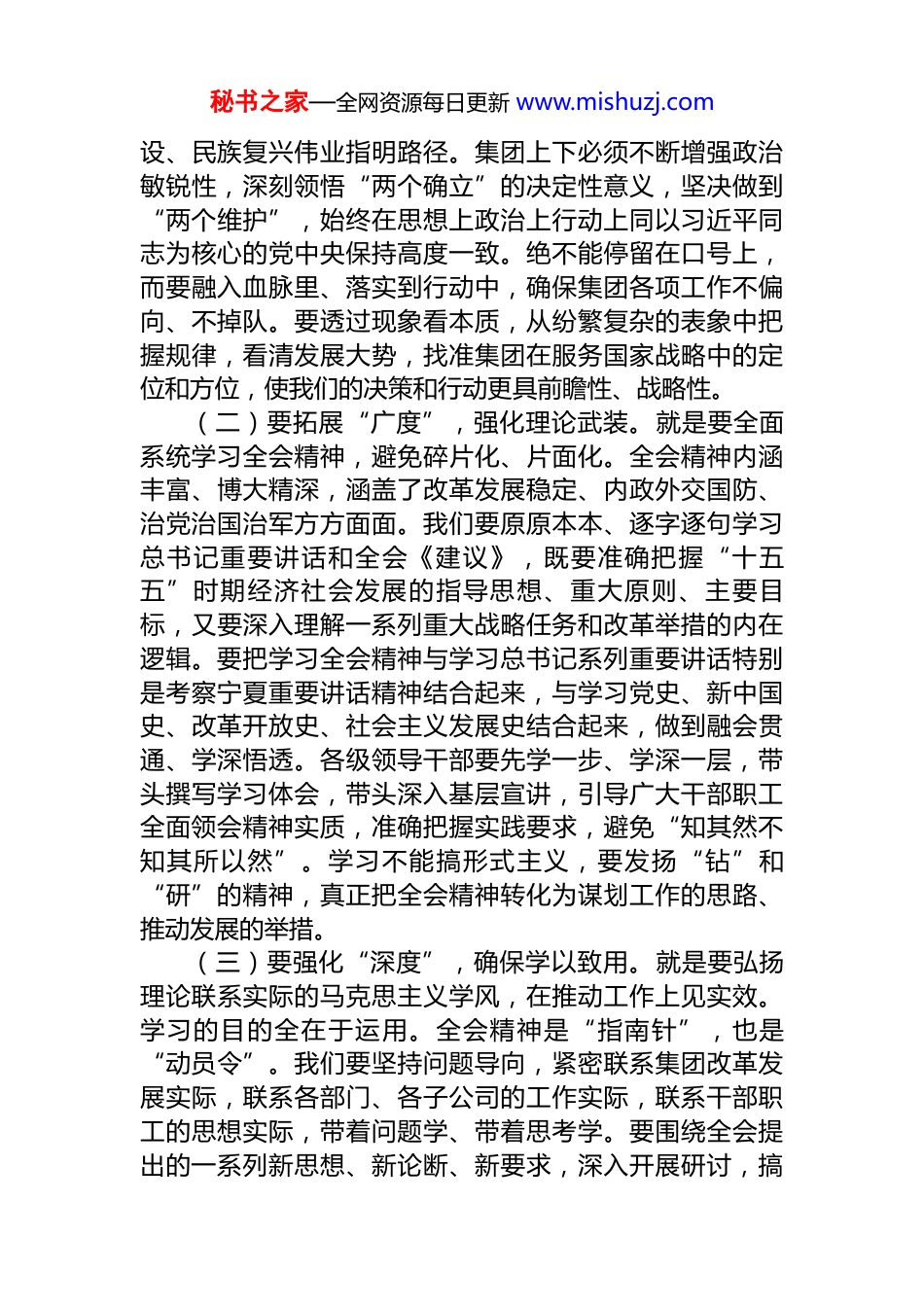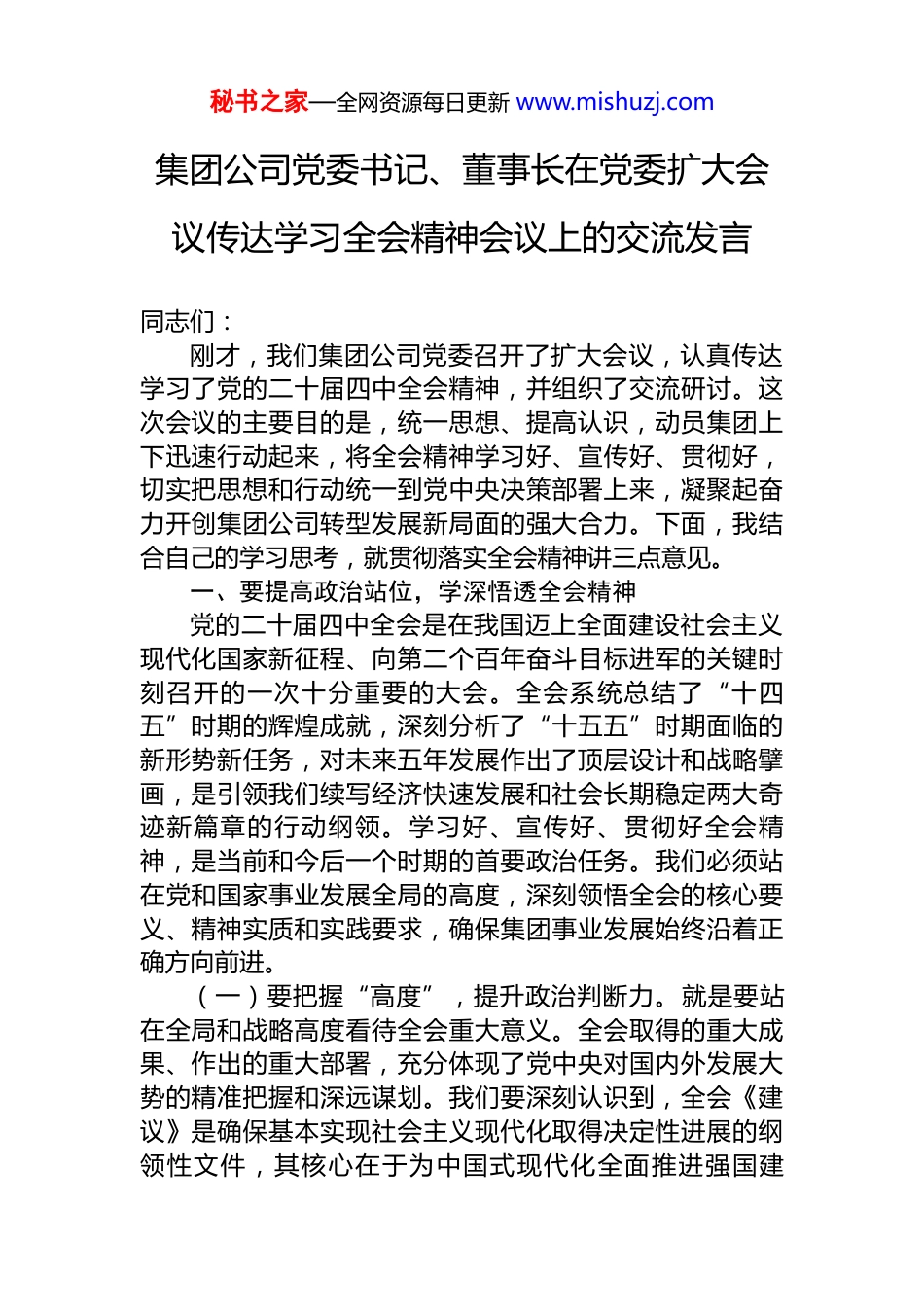 秘书之家—全网资源每日更新 www.mishuzj.com集团公司党委书记、董事长在党委扩大会议传达学习全会精神会议上的交流发言同志们:刚才,我们集团公司党委召开了扩大会议,认真传达学习了党的二十届四中全会精神,并组织了交流研讨。这次会议的主要目的是,统一思想、提高认识,动员集团上下迅速行动起来,将全会精神学习好、宣传好、贯彻好,切实把思想和行动统一到党中央决策部署上来,凝聚起奋力开创集团公司转型发展新局面的强大合力。下面,我结合自己的学习思考,就贯彻落实全会精神讲三点意见。一、要提高政治站位,学深悟透全会精神党的二十届四中全会是在我国迈上全面建设社会主义现代化国家新征程、向第二个百年奋斗目标进军的关键时刻召开的一次十分重要的大会。全会系统总结了“十四五”时期的辉煌成就,深刻分析了“十五五”时期面临的新形势新任务,对未来五年发展作出了顶层设计和战略擘画,是引领我们续写经济快速发展和社会长期稳定两大奇迹新篇章的行动纲领。学习好、宣传好、贯彻好全会精神,是当前和今后一个时期的首要政治任务。我们必须站在党和国家事业发展全局的高度,深刻领悟全会的核心要义、精神实质和实践要求,确保集团事业发展始终沿着正确方向前进。(一)要把握“高度”,提升政治判断力。就是要站在全局和战略高度看待全会重大意义。全会取得的重大成果、作出的重大部署,充分体现了党中央对国内外发展大势的精准把握和深远谋划。我们要深刻认识到,全会《建议》是确保基本实现社会主义现代化取得决定性进展的纲领性文件,其核心在于为中国式现代化全面推进强国建秘书之家—全网资源每日更新 www.mishuzj.com设、民族复兴伟业指明路径。集团上下必须不断增强政治敏锐性,深刻领悟“两个确立”的决定性意义,坚决做到“两个维护”,始终在思想上政治上行动上同以习近平同志为核心的党中央保持高度一致。绝不能停留在口号上,而要融入血脉里、落实到行动中,确保集团各项工作不偏向、不掉队。要透过现象看本质,从纷繁复杂的表象中把握规律,看清发展大势,找准集团在服务国家战略中的定位和方位,使我们的决策和行动更具前瞻性、战略性。(二)要拓展“广度”,强化理论武装。就是要全面系统学习全会精神,避免碎片化、片面化。全会精神内涵丰富、博大精深,涵盖了改革发展稳定、内政外交国防、治党治国治军方方面面。我们要原原本本、逐字逐句学习总书记重要讲话和全会《建议》,既要准确把握“十五五”时期经济社会发展的指导思想、重大原则、主要目标,又要深入理解一系列重大战略任务和改革举措的内在逻辑。要把学习全会精神与学习总书记系列重要讲话特别是考察宁夏重要讲话精神结合起来,与学习党史、新中国史、改革开放史、社会主义发展史结合起来,做到融会贯通、学深悟透。各级领导干部要先学一步、学深一层,带头撰写学习体会,带头深入基层宣讲,引导广大干部职工全面领会精神实质,准确把握实践要求,避免“知其然不知其所以然”。学习不能搞形式主义,要发扬“钻”和“研”的精神,真正把全会精神转化为谋划工作的思路、推动发展的举措。(三)要强化“深度”,确保学以致用。就是要弘扬理论联系实际的马克思主义学风,在推动工作上见实效。学习的目的全在于运用。全会精神是“指南针”,也是“动员令”。我们要坚持问题导向,紧密联系集团改革发展实际,联系各部门、各子公司的工作实际,联系干部职工的思想实际,带着问题学、带着思考学。要围绕全会提出的一系列新思想、新论断、新要求,深入开展研讨,搞秘书之家—全网资源每日更新 www.mishuzj.com清楚哪些是我们已经在做、需要深化提升的,哪些是存在短板、需要加紧补上的,哪些是未来方向、需要提前布局的。要把学习成果转化为破解发展难题、推动转型升级的有效方法,转化为激发干事创业热情、提振担当精神的强大动力。要避免学用脱节“两张皮”,坚决防止“会上热、会下冷”的现象,确保全会精神在集团落地生根、开花结果。学习的效果最终要体现在高质量发展成效上,体现在核心竞争力提升上,体现在职工群众获得感幸福感安全感增强上。(四)要加大“力度”,抓好宣传宣讲。...