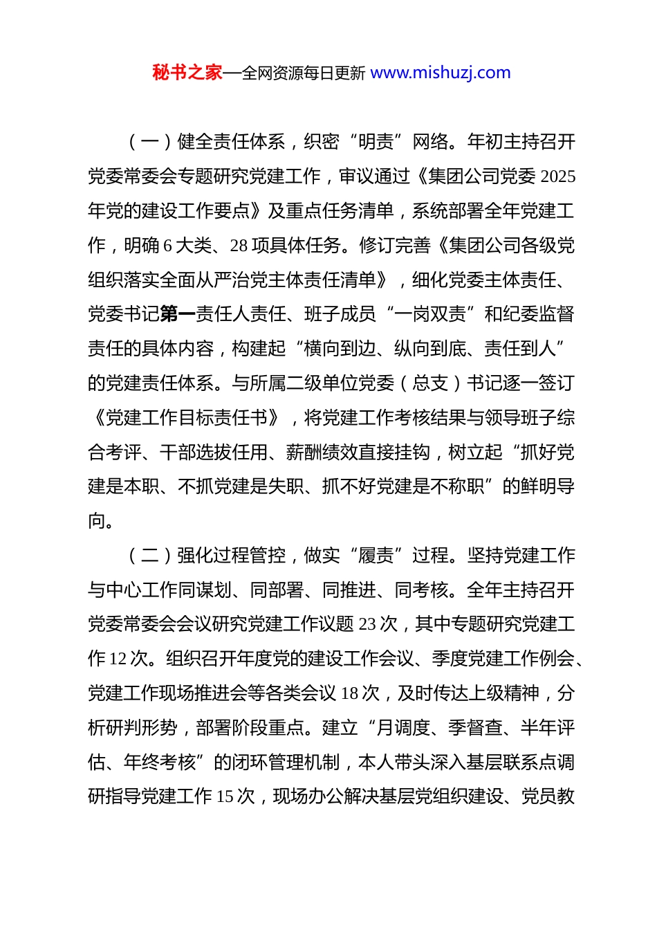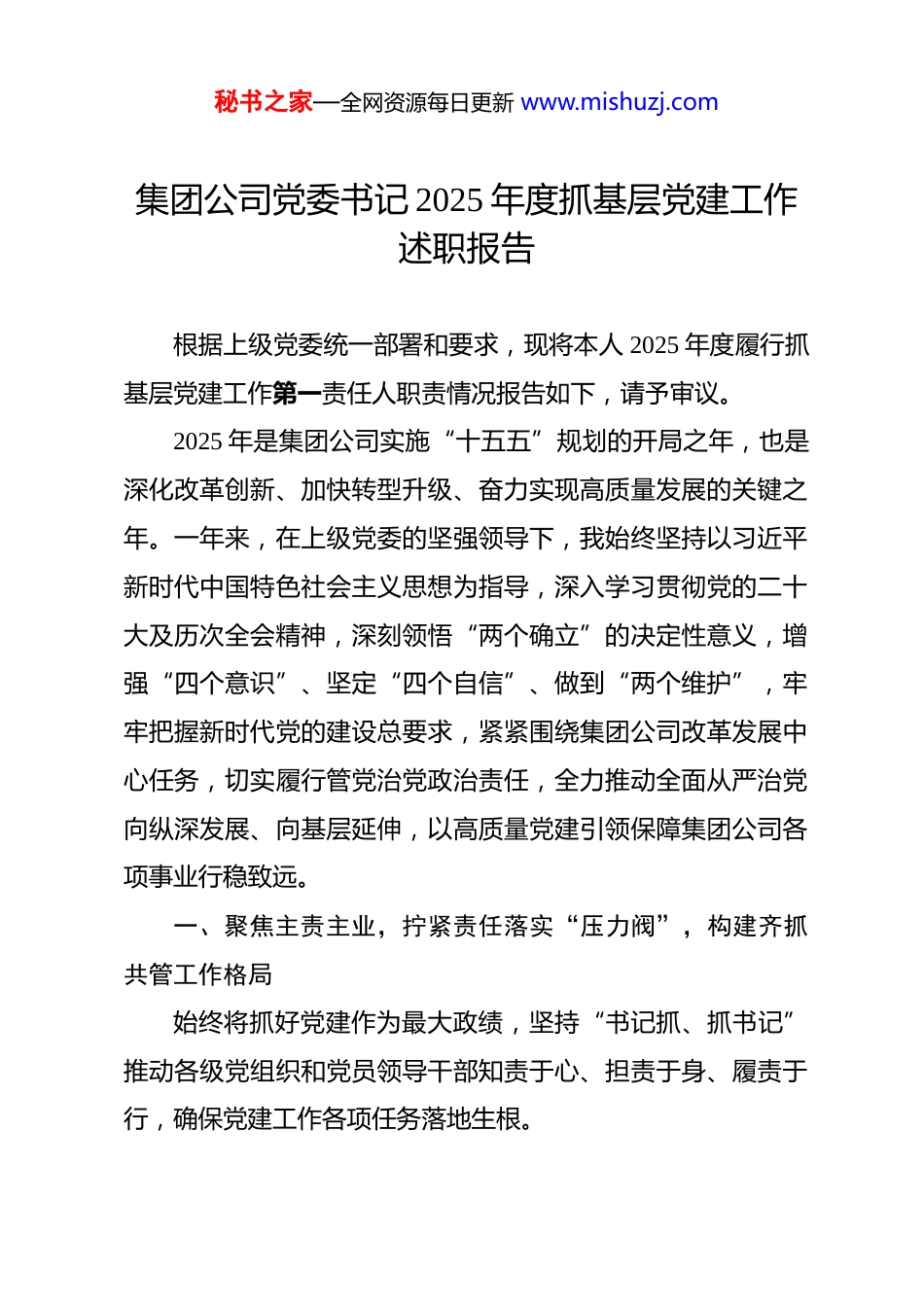 秘书之家—全网资源每日更新 www.mishuzj.com集团公司党委书记 2025 年度抓基层党建工作述职报告 根据上级党委统一部署和要求,现将本人 2025 年度履行抓基层党建工作第一责任人职责情况报告如下,请予审议。2025 年是集团公司实施“十五五”规划的开局之年,也是深化改革创新、加快转型升级、奋力实现高质量发展的关键之年。一年来,在上级党委的坚强领导下,我始终坚持以习近平新时代中国特色社会主义思想为指导,深入学习贯彻党的二十大及历次全会精神,深刻领悟“两个确立”的决定性意义,增强“四个意识”、坚定“四个自信”、做到“两个维护”,牢牢把握新时代党的建设总要求,紧紧围绕集团公司改革发展中心任务,切实履行管党治党政治责任,全力推动全面从严治党向纵深发展、向基层延伸,以高质量党建引领保障集团公司各项事业行稳致远。一、聚焦主责主业,拧紧责任落实“压力阀”,构建齐抓共管工作格局始终将抓好党建作为最大政绩,坚持“书记抓、抓书记”推动各级党组织和党员领导干部知责于心、担责于身、履责于行,确保党建工作各项任务落地生根。秘书之家—全网资源每日更新 www.mishuzj.com(一)健全责任体系,织密“明责”网络。年初主持召开党委常委会专题研究党建工作,审议通过《集团公司党委 2025年党的建设工作要点》及重点任务清单,系统部署全年党建工作,明确 6 大类、28 项具体任务。修订完善《集团公司各级党组织落实全面从严治党主体责任清单》,细化党委主体责任、党委书记第一责任人责任、班子成员“一岗双责”和纪委监督责任的具体内容,构建起“横向到边、纵向到底、责任到人”的党建责任体系。与所属二级单位党委(总支)书记逐一签订《党建工作目标责任书》,将党建工作考核结果与领导班子综合考评、干部选拔任用、薪酬绩效直接挂钩,树立起“抓好党建是本职、不抓党建是失职、抓不好党建是不称职”的鲜明导向。(二)强化过程管控,做实“履责”过程。坚持党建工作与中心工作同谋划、同部署、同推进、同考核。全年主持召开党委常委会会议研究党建工作议题 23 次,其中专题研究党建工作 12 次。组织召开年度党的建设工作会议、季度党建工作例会、党建工作现场推进会等各类会议 18 次,及时传达上级精神,分析研判形势,部署阶段重点。建立“月调度、季督查、半年评估、年终考核”的闭环管理机制,本人带头深入基层联系点调研指导党建工作 15 次,现场办公解决基层党组织建设、党员教秘书之家—全网资源每日更新 www.mishuzj.com育管理等方面实际问题 32 个。党委班子成员严格落实“一岗双责”,定期到分管领域和联系单位指导党建工作、参加组织生活,形成齐抓共管合力。(三)严格考核问责,传导“担责”压力。优化完善党建工作考核评价体系,增加融合发展、创新实效、群众满意度等指标的权重。牵头组织对所属 35 家二级单位党组织开展年度党建工作现场考核,通过听取汇报、查阅资料、民主测评、个别谈话等方式,全面检验党建工作成效。强化考核结果运用,对考核优秀的 5 家单位党委予以通报表扬,对排名靠后的 3 家单位党委书记进行约谈提醒,并责令限期整改。严格执行《中国共产党问责条例》,对履行党建责任不力、管党治党宽松软的2 名基层党组织负责人进行严肃问责,切实以刚性问责倒逼责任落实。二、强化理论武装,把稳理想信念“方向盘”,筑牢思想政治根基坚持把党的政治建设摆在首位,持续深化理论武装,教育引导广大党员干部不断提高政治判断力、政治领悟力、政治执行力,自觉在思想上政治上行动上同党中央保持高度一致。(一)深化创新理论学习教育。将学习贯彻习近平新时代中国特色社会主义思想作为首要政治任务,严格落实“第一议秘书之家—全网资源每日更新 www.mishuzj.com题”制度,全年组织党委理论学习中心组集中学习 18 次,其中专题研讨 9 次,重点围绕习近平总书记关于发展新质生产力、推动高质量发展、全面深化改革、防范化解重大风险等重要论述进行深入学习研讨,班子成员带头撰写学习心得、调研报告26 篇。举办学习贯彻党的二十大精神专题读书班 2 期,覆盖中层以上领导干部 420...