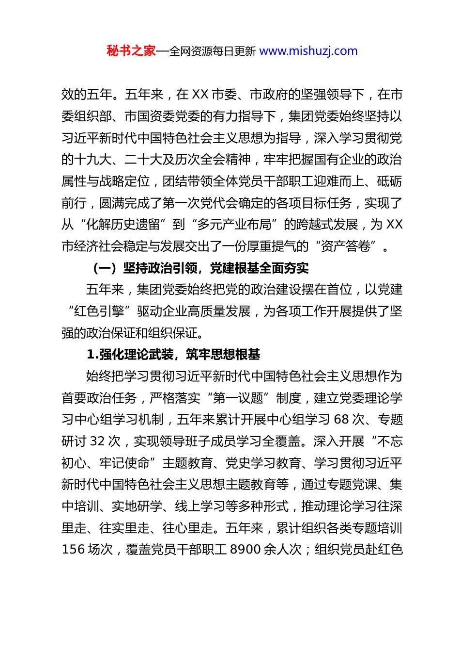 秘书之家—全网资源每日更新 www.mishuzj.comXX 市资产管理集团有限公司党代会工作报告各位代表、同志们:大家好!今天,我们怀着无比激动的心情,隆重召开中国共产党 XX市资产管理集团有限公司第二次党员代表大会。这是在全面贯彻落实党的二十大精神、深入学习习近平总书记视察广东及 XX重要讲话重要指示精神的关键时期,在集团改革发展承前启后、继往开来的重要节点召开的一次十分重要的会议。本次大会的主题是:以习近平新时代中国特色社会主义思想为指导,全面回顾集团第一次党代会以来的奋斗历程与发展成就,深入分析当前面临的形势与任务,科学谋划未来五年的发展蓝图与实践路径,进一步动员全体党员干部职工凝心聚力、锐意进取、攻坚克难,坚定不移走高质量发展之路,奋力谱写集团改革发展和党的建设新篇章,为服务 XX 市委“工业立市、产业强市”战略部署、推动 XX 经济社会高质量发展作出新的更大贡献!下面,我代表中国共产党 XX 市资产管理集团有限公司第一届委员会,向大会作工作报告,请各位代表审议。一、过去五年工作回顾,凝心聚力攻坚克难,改革发展成效卓著过去五年,是集团发展史上极不平凡、极具挑战、极富成秘书之家—全网资源每日更新 www.mishuzj.com效的五年。五年来,在 XX 市委、市政府的坚强领导下,在市委组织部、市国资委党委的有力指导下,集团党委始终坚持以习近平新时代中国特色社会主义思想为指导,深入学习贯彻党的十九大、二十大及历次全会精神,牢牢把握国有企业的政治属性与战略定位,团结带领全体党员干部职工迎难而上、砥砺前行,圆满完成了第一次党代会确定的各项目标任务,实现了从“化解历史遗留”到“多元产业布局”的跨越式发展,为 XX市经济社会稳定与发展交出了一份厚重提气的“资产答卷”。(一)坚持政治引领,党建根基全面夯实五年来,集团党委始终把党的政治建设摆在首位,以党建“红色引擎”驱动企业高质量发展,为各项工作开展提供了坚强的政治保证和组织保证。1.强化理论武装,筑牢思想根基始终把学习贯彻习近平新时代中国特色社会主义思想作为首要政治任务,严格落实“第一议题”制度,建立党委理论学习中心组学习机制,五年来累计开展中心组学习 68 次、专题研讨 32 次,实现领导班子成员学习全覆盖。深入开展“不忘初心、牢记使命”主题教育、党史学习教育、学习贯彻习近平新时代中国特色社会主义思想主题教育等,通过专题党课、集中培训、实地研学、线上学习等多种形式,推动理论学习往深里走、往实里走、往心里走。五年来,累计组织各类专题培训156 场次,覆盖党员干部职工 8900 余人次;组织党员赴红色秘书之家—全网资源每日更新 www.mishuzj.com教育基地开展实地研学 28 次,让党员干部在沉浸式学习中传承红色基因、锤炼党性修养。同时,注重理论联系实际,围绕集团改革发展、业务拓展风险防控等重点工作,开展“我为企业献良策”活动,收集合理化建议 420 余条,其中 186 条被采纳实施,有效将学习成果转化为推动工作的实际成效。2.压实党建责任,完善治理机制严格落实“两个一以贯之”,把党的领导融入公司治理各环节,修订完善《集团党委会议事规则》《董事会工作规则》《经理层工作规则》等制度 23 项,明确党委在重大经营管理事项中的前置研究讨论程序,确保党委“把方向、管大局、保落实”的领导作用得到充分发挥。建立党建工作责任制与经营业绩考核“双挂钩”机制,制定《集团党建工作责任制实施办法》《党支部考核评价细则》,每年与各党支部签订党建工作责任书,开展党建工作述职评议考核,形成“党委统一领导、书记负总责、班子成员分工负责、党务部门牵头协调、业务部门积极参与”的党建工作格局。五年来,集团党委班子成员认真履行“一岗双责”,深入基层党支部调研指导党建工作 96 次,解决党建与业务融合、党支部建设等方面的问题 138 个,推动党建工作与生产经营同谋划、同部署、同推进、同考核。3.加强组织建设,筑牢战斗堡垒秘书之家—全网资源每日更新 www.mishuzj.com坚持大抓基层的鲜明导向,以党支部标准化规范化建设为抓手,持续提升基层党组织组织力。五...