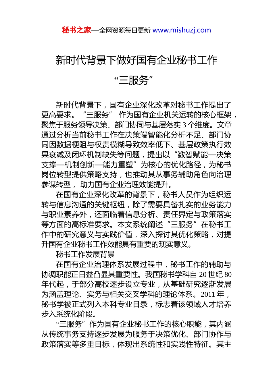 秘书之家—全网资源每日更新 www.mishuzj.com新时代背景下做好国有企业秘书工作“三服务”新时代背景下,国有企业深化改革对秘书工作提出了更高要求。“三服务” 作为国有企业机关运转的核心框架,聚焦于服务领导决策、部门协同与基层落实 3 个维度。文章通过分析当前秘书工作在决策端智能化分析不足、部门协同因数据梗阻与权责模糊导致效率低下、基层政策执行效果衰减及闭环机制缺失等问题,提出以“数智赋能—决策支撑—机制创新—能力重塑”为核心的优化路径,为秘书岗位转型提供策略支持,也推动其从事务辅助角色向治理参谋转型, 助力国有企业治理效能提升。在国有企业深化改革的背景下,秘书人员作为组织运转与信息沟通的关键枢纽,除了需要具备扎实的业务能力与职业素养外,还面临着信息分析、责任界定与政策落实等方面的高标准要求。本文系统阐述“三服务”在秘书工作中的研究意义与实践价值,深入探讨其优化策略,对提升国有企业秘书工作效能具有重要的现实意义。秘书工作发展背景在国有企业治理体系发展过程中,秘书工作的辅助与协调职能正日益凸显其重要性。我国秘书学科自 20 世纪 80年代起,于部分高校逐步设立专业,从基础研究逐渐发展为涵盖理论、实务与相关交叉学科的理论体系。2011 年,秘书学被正式列入本科专业目录,标志着该领域人才培养步入系统化阶段。“三服务”作为国有企业秘书工作的核心职能,其内涵从传统事务支持逐步发展为服务于决策优化、部门协作与政策落实等多重目标,体现出系统性和实践性特征。其主秘书之家—全网资源每日更新 www.mishuzj.com要价值体现在 3 个方面:一是在决策环节提供信息整合与分析支持;二是协助跨部门资源协调,提升管理效率;三是推动政策传达与执行跟踪,助力组织实现制度效能。面向未来,秘书队伍应进一步提升数据分析、协同管理与落实跟踪等方面的能力,充分发挥其在战略与执行间的桥梁作用。秘书工作与企业发展的联系及作用国有企业秘书岗位是企业行政管理体系中的关键一环,其工作贯穿企业决策、执行与监督全过程,对提升管理效率、优化资源配置及保障战略实施具有重要作用。秘书工作与企业整体发展的联系主要体现在 4 个方面。协调中枢作用,保障企业高效运转秘书承担着企业内部信息流转与任务督办的核心职能,通过统筹会议安排、文件传递与事项落实等工作,确保上级政策与决策准确传达至各部门,促进管理闭环形成,有助于降低内部协调成本、提升运营效率。例如,在国企改革过程中,秘书需要积极协调跨部门协作,推动“三重一大”事项的规范实施,以支持企业构建符合现代治理要求的管理体系。决策支持作用,助力科学管理秘书不仅负责事务性工作,还扮演着决策辅助角色,为企业管理层提供信息整合、数据分析及报告撰写等支持在投资并购、混合所有制改革等重大经营决策中,秘书需要系统梳理行业动态、政策法规与潜在风险,为领导决策提供依据。此外,通过建立健全督办机制跟踪重点任务进展,可及时发现并纠正执行偏差,为企业战略目标的实现提供保障。形象管理作用,提升企业软实力国有企业兼具社会责任承担者与经济组织的双重属性,其公众形象直接影响市场信誉与社会认同。秘书在公关接待、品牌传播与企业文化构建中承担重秘书之家—全网资源每日更新 www.mishuzj.com要职能,通过协助开展企业文化活动,进一步增强员工凝聚力,为企业塑造积极正面的形象提供有力支持。例如,在接待上级调研或合作洽谈过程中,秘书凭借专业与规范的服务展现企业良好风貌;在舆情应对方面,秘书需要及时研判舆情动向并协助制订响应策略,维护企业公信力与社会信任。合规与风险防控作用,保障企业稳健发展作为国家出资设立并受相关监管的经济实体,国有企业必须严格遵循各项法律法规与政策要求。秘书发挥关键作用,一方面,应保障文件管理、会议纪要和档案存证等工作的规范性与完整性,尤其在审计、巡视等专项监督中完备的文档体系成为企业合规运营的重要依据;另一方面应参与企业内控制度建设,通过完善机制推动治理规范化有效识别与防范经营风险。国有企业秘书工作不仅限于基础行政辅助,而是渗透于企业战略实施、管...