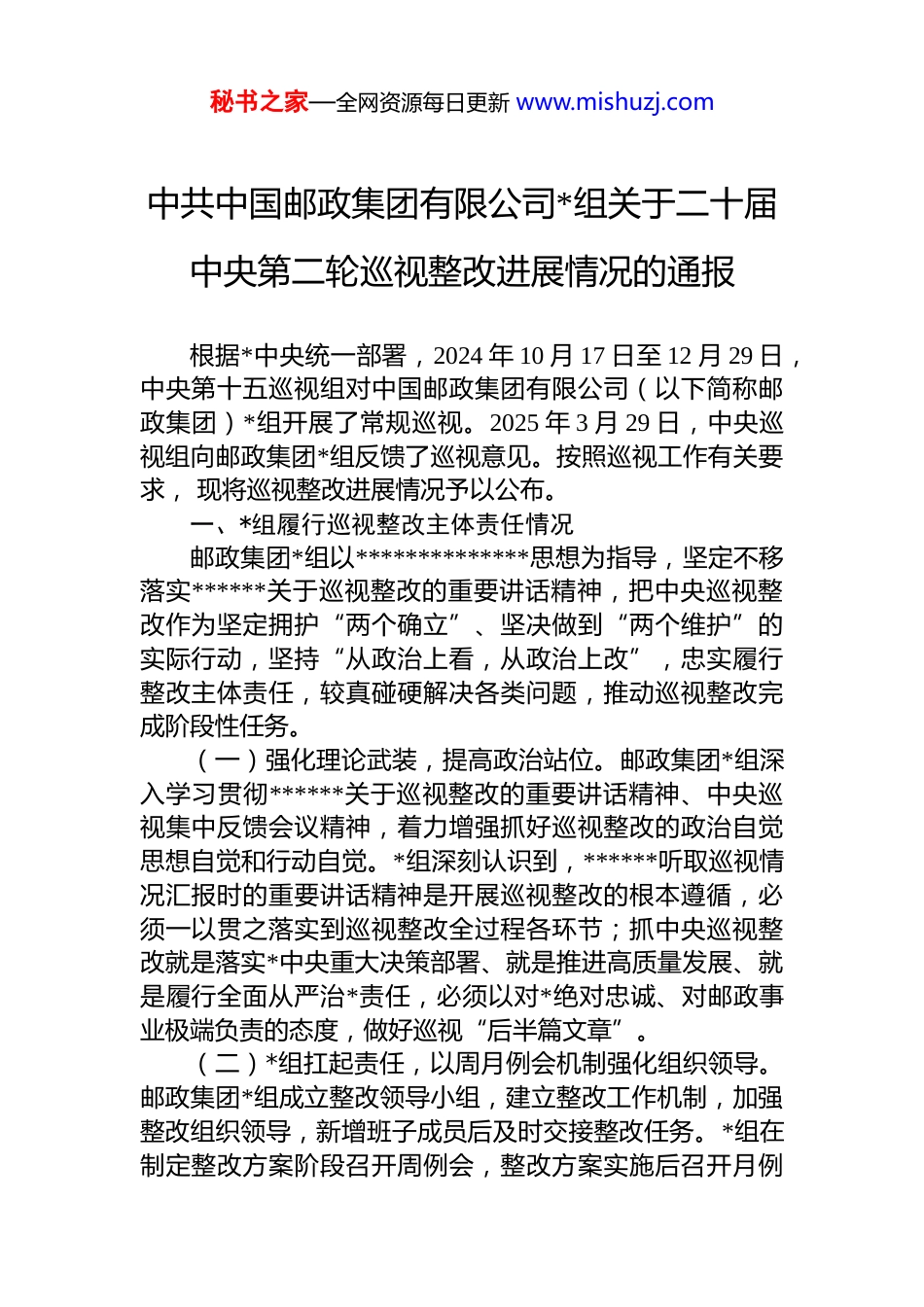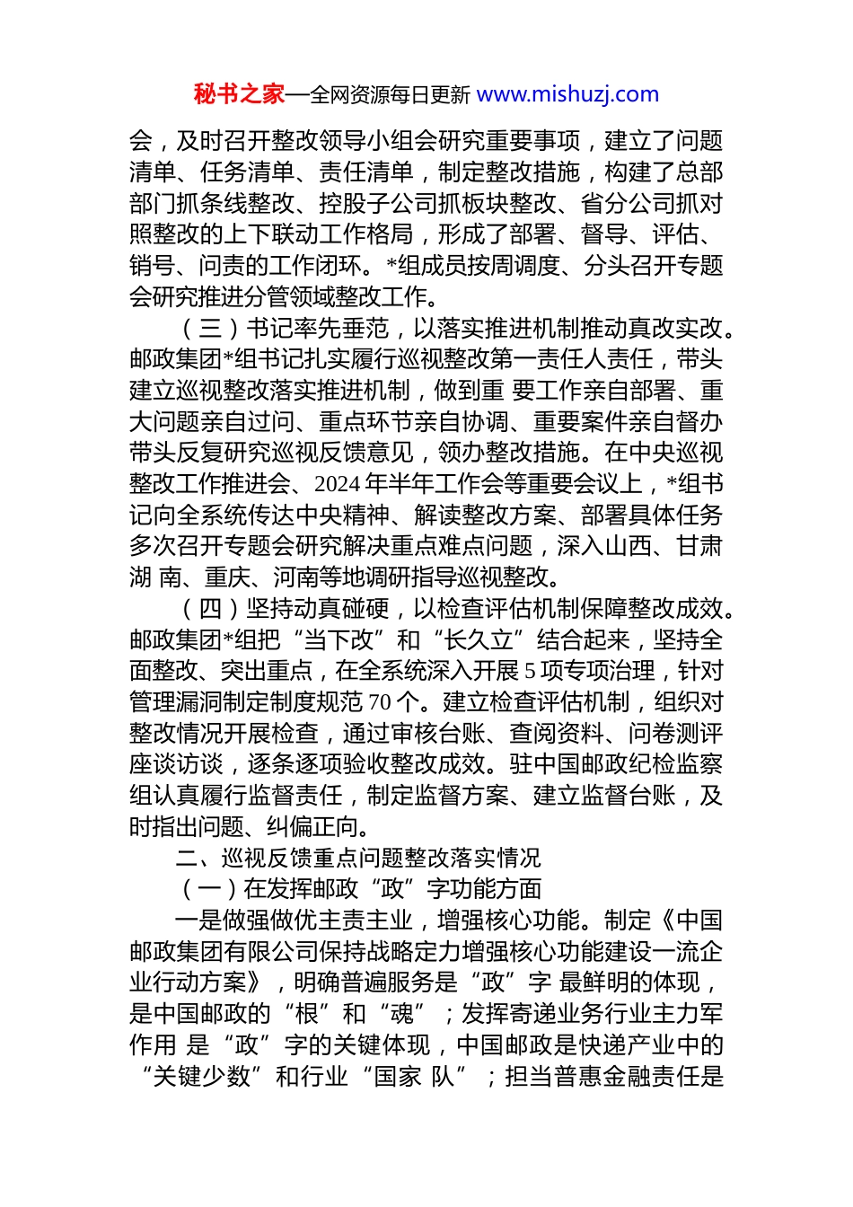 秘书之家—全网资源每日更新 www.mishuzj.com中共中国邮政集团有限公司*组关于二十届中央第二轮巡视整改进展情况的通报根据*中央统一部署,2024 年 10 月 17 日至 12 月 29 日,中央第十五巡视组对中国邮政集团有限公司(以下简称邮政集团)*组开展了常规巡视。2025 年 3 月 29 日,中央巡视组向邮政集团*组反馈了巡视意见。按照巡视工作有关要求, 现将巡视整改进展情况予以公布。一、*组履行巡视整改主体责任情况邮政集团*组以**************思想为指导,坚定不移落实******关于巡视整改的重要讲话精神,把中央巡视整改作为坚定拥护“两个确立”、坚决做到“两个维护”的实际行动,坚持“从政治上看,从政治上改”,忠实履行整改主体责任,较真碰硬解决各类问题,推动巡视整改完成阶段性任务。(一)强化理论武装,提高政治站位。邮政集团*组深入学习贯彻******关于巡视整改的重要讲话精神、中央巡视集中反馈会议精神,着力增强抓好巡视整改的政治自觉思想自觉和行动自觉。*组深刻认识到,******听取巡视情况汇报时的重要讲话精神是开展巡视整改的根本遵循,必须一以贯之落实到巡视整改全过程各环节;抓中央巡视整改就是落实*中央重大决策部署、就是推进高质量发展、就是履行全面从严治*责任,必须以对*绝对忠诚、对邮政事业极端负责的态度,做好巡视“后半篇文章”。(二)*组扛起责任,以周月例会机制强化组织领导。邮政集团*组成立整改领导小组,建立整改工作机制,加强整改组织领导,新增班子成员后及时交接整改任务。*组在制定整改方案阶段召开周例会,整改方案实施后召开月例秘书之家—全网资源每日更新 www.mishuzj.com会,及时召开整改领导小组会研究重要事项,建立了问题清单、任务清单、责任清单,制定整改措施,构建了总部部门抓条线整改、控股子公司抓板块整改、省分公司抓对照整改的上下联动工作格局,形成了部署、督导、评估、销号、问责的工作闭环。*组成员按周调度、分头召开专题会研究推进分管领域整改工作。(三)书记率先垂范,以落实推进机制推动真改实改。邮政集团*组书记扎实履行巡视整改第一责任人责任,带头建立巡视整改落实推进机制,做到重 要工作亲自部署、重大问题亲自过问、重点环节亲自协调、重要案件亲自督办带头反复研究巡视反馈意见,领办整改措施。在中央巡视整改工作推进会、2024 年半年工作会等重要会议上,*组书记向全系统传达中央精神、解读整改方案、部署具体任务多次召开专题会研究解决重点难点问题,深入山西、甘肃湖 南、重庆、河南等地调研指导巡视整改。(四)坚持动真碰硬,以检查评估机制保障整改成效。邮政集团*组把“当下改”和“长久立”结合起来,坚持全面整改、突出重点,在全系统深入开展 5 项专项治理,针对管理漏洞制定制度规范 70 个。建立检查评估机制,组织对整改情况开展检查,通过审核台账、查阅资料、问卷测评座谈访谈,逐条逐项验收整改成效。驻中国邮政纪检监察组认真履行监督责任,制定监督方案、建立监督台账,及时指出问题、纠偏正向。二、巡视反馈重点问题整改落实情况(一)在发挥邮政“政”字功能方面一是做强做优主责主业,增强核心功能。制定《中国邮政集团有限公司保持战略定力增强核心功能建设一流企业行动方案》,明确普遍服务是“政”字 最鲜明的体现,是中国邮政的“根”和“魂”;发挥寄递业务行业主力军作用 是“政”字的关键体现,中国邮政是快递产业中的“关键少数”和行业“国家 队”;担当普惠金融责任是秘书之家—全网资源每日更新 www.mishuzj.com“政”字的重要体现,“服务三农、城乡居民和中 小企业”是国家赋予邮政金融的定位;承担关键时刻兜底保障作用是“政”字 的责任体现,中国邮政应国家之所需、应人民之所需,关键时刻拉得出、冲得 上、打得赢。进而明确每一项主要业务的核心功能、核心优势、核心竞争力,以及做强做优的发展目标、实施路径、具体举措,推动“政”字要求在全集团 干部员工中入脑入心。二是更好发挥普遍服务作用。制定《进一步推进新时代 邮政普遍服务高质量发展的实施方案》,组织开展普遍服务基础知识大学习, 做到优先投入...