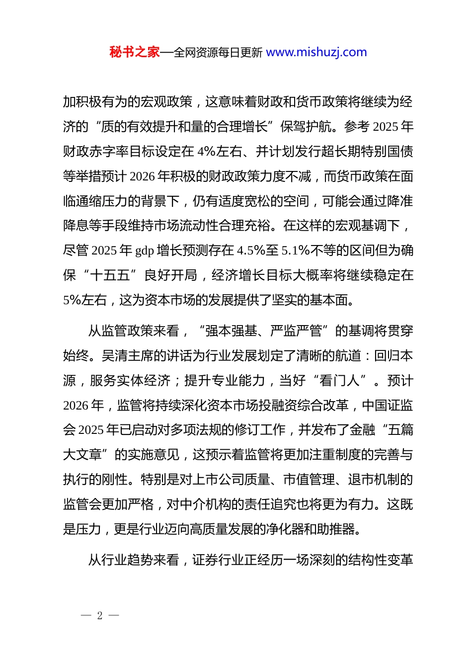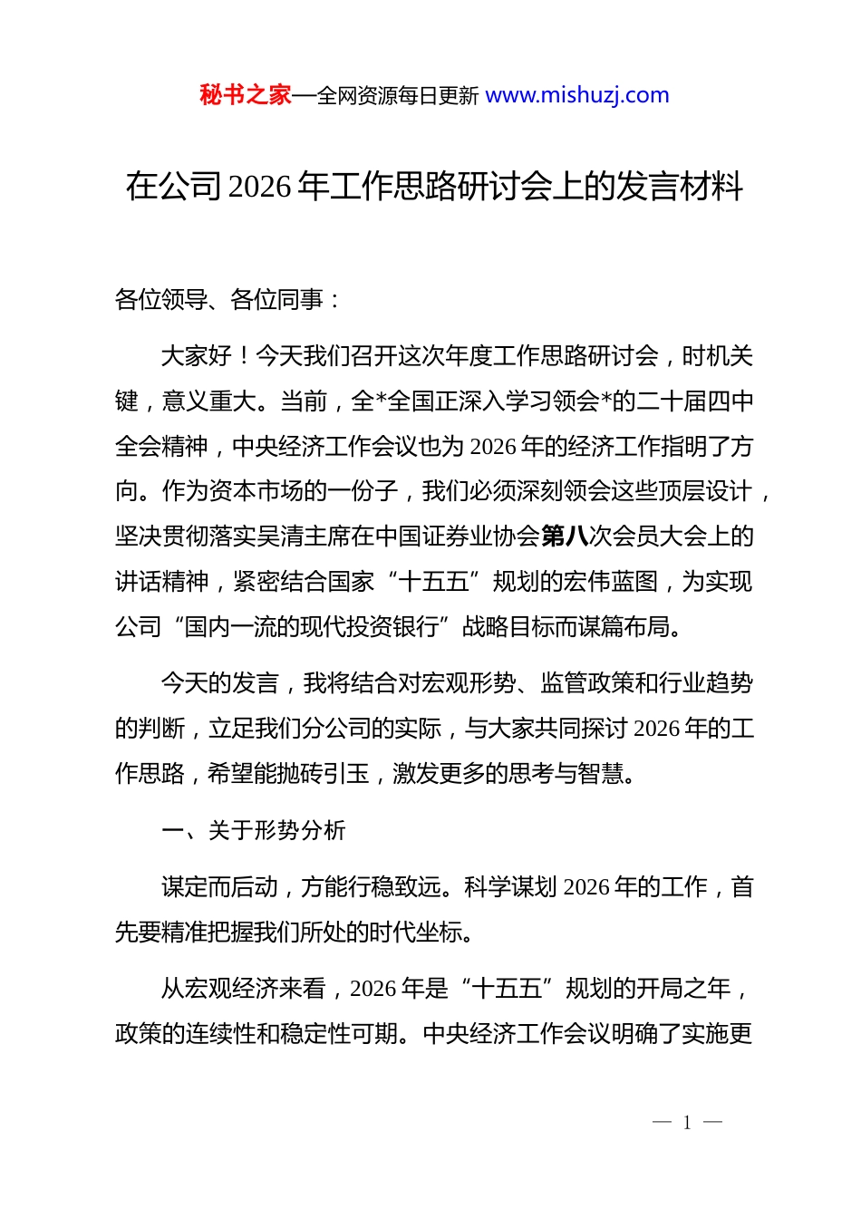秘书之家—全网资源每日更新 www.mishuzj.com在公司 2026 年工作思路研讨会上的发言材料各位领导、各位同事:大家好!今天我们召开这次年度工作思路研讨会,时机关键,意义重大。当前,全*全国正深入学习领会*的二十届四中全会精神,中央经济工作会议也为 2026 年的经济工作指明了方向。作为资本市场的一份子,我们必须深刻领会这些顶层设计,坚决贯彻落实吴清主席在中国证券业协会第八次会员大会上的讲话精神,紧密结合国家“十五五”规划的宏伟蓝图,为实现公司“国内一流的现代投资银行”战略目标而谋篇布局。今天的发言,我将结合对宏观形势、监管政策和行业趋势的判断,立足我们分公司的实际,与大家共同探讨 2026 年的工作思路,希望能抛砖引玉,激发更多的思考与智慧。一、关于形势分析谋定而后动,方能行稳致远。科学谋划 2026 年的工作,首先要精准把握我们所处的时代坐标。从宏观经济来看,2026 年是“十五五”规划的开局之年,政策的连续性和稳定性可期。中央经济工作会议明确了实施更— 1 —秘书之家—全网资源每日更新 www.mishuzj.com加积极有为的宏观政策,这意味着财政和货币政策将继续为经济的“质的有效提升和量的合理增长”保驾护航。参考 2025 年财政赤字率目标设定在 4%左右、并计划发行超长期特别国债等举措预计 2026 年积极的财政政策力度不减,而货币政策在面临通缩压力的背景下,仍有适度宽松的空间,可能会通过降准降息等手段维持市场流动性合理充裕。在这样的宏观基调下,尽管 2025 年 gdp 增长预测存在 4.5%至 5.1%不等的区间但为确保“十五五”良好开局,经济增长目标大概率将继续稳定在5%左右,这为资本市场的发展提供了坚实的基本面。从监管政策来看,“强本强基、严监严管”的基调将贯穿始终。吴清主席的讲话为行业发展划定了清晰的航道:回归本源,服务实体经济;提升专业能力,当好“看门人”。预计2026 年,监管将持续深化资本市场投融资综合改革,中国证监会 2025 年已启动对多项法规的修订工作,并发布了金融“五篇大文章”的实施意见,这预示着监管将更加注重制度的完善与执行的刚性。特别是对上市公司质量、市值管理、退市机制的监管会更加严格,对中介机构的责任追究也将更为有力。这既是压力,更是行业迈向高质量发展的净化器和助推器。从行业趋势来看,证券行业正经历一场深刻的结构性变革— 2 —秘书之家—全网资源每日更新 www.mishuzj.com一方面,财富管理转型进入深水区,简单的通道服务模式已难以为继,行业正朝着以客户为中心的买方投顾模式加速演进,专业化、生态化成为共识。另一方面,数字化转型不再是“选择题”,而是关乎生存和发展的“必答题”。人工智能、大数据等技术正重塑行业的服务模式与竞争格局数字财富管理市场规模的巨大潜力预示着谁能抓住技术风口,谁就能赢得未来。同时,服务“新质生产力”成为投行业务的新使命,券商必须提升在战略性新兴产业领域的深耕能力这已成为头部券商的核心竞争力。二、关于问题短板对照“国内一流”的战略目标和行业第一方阵的要求,我们必须清醒地认识到自身存在的差距。这既是我们的短板,也是未来工作的发力点。首先,在投资银行业务上,我们服务国家战略性新兴产业的能力亟待加强。尽管政策导向明确,但我们在集成电路、生物制造等硬科技领域的项目储备和专业判断力,与招商证券“羚跃计划”那样体系化的服务能力相比,仍有明显差距。其次,在财富管理业务上,我们的转型步伐还不够快。向— 3 —秘书之家—全网资源每日更新 www.mishuzj.com买方投顾模式的转变尚在探索,尚未形成规模效应和品牌优势。在构建多元化产品体系、提升资产配置专业能力方面,与行业标杆相比,服务深度和客户黏性都有待提升。再次,在机构业务上,我们的创新服务能力和综合解决方案供给不足。尤其在场外衍生品、跨境业务等高附加值领域,产品创设和交易服务能力与头部券商存在代差。然后,在数字化赋能上,我们的投入和应用深度有所欠缺数据治理体系尚不完善,金融科技在客户精准画像、智能投顾、动态风险监控等方面的支撑作用未能充分发挥,运营效率有待通过数字化改...