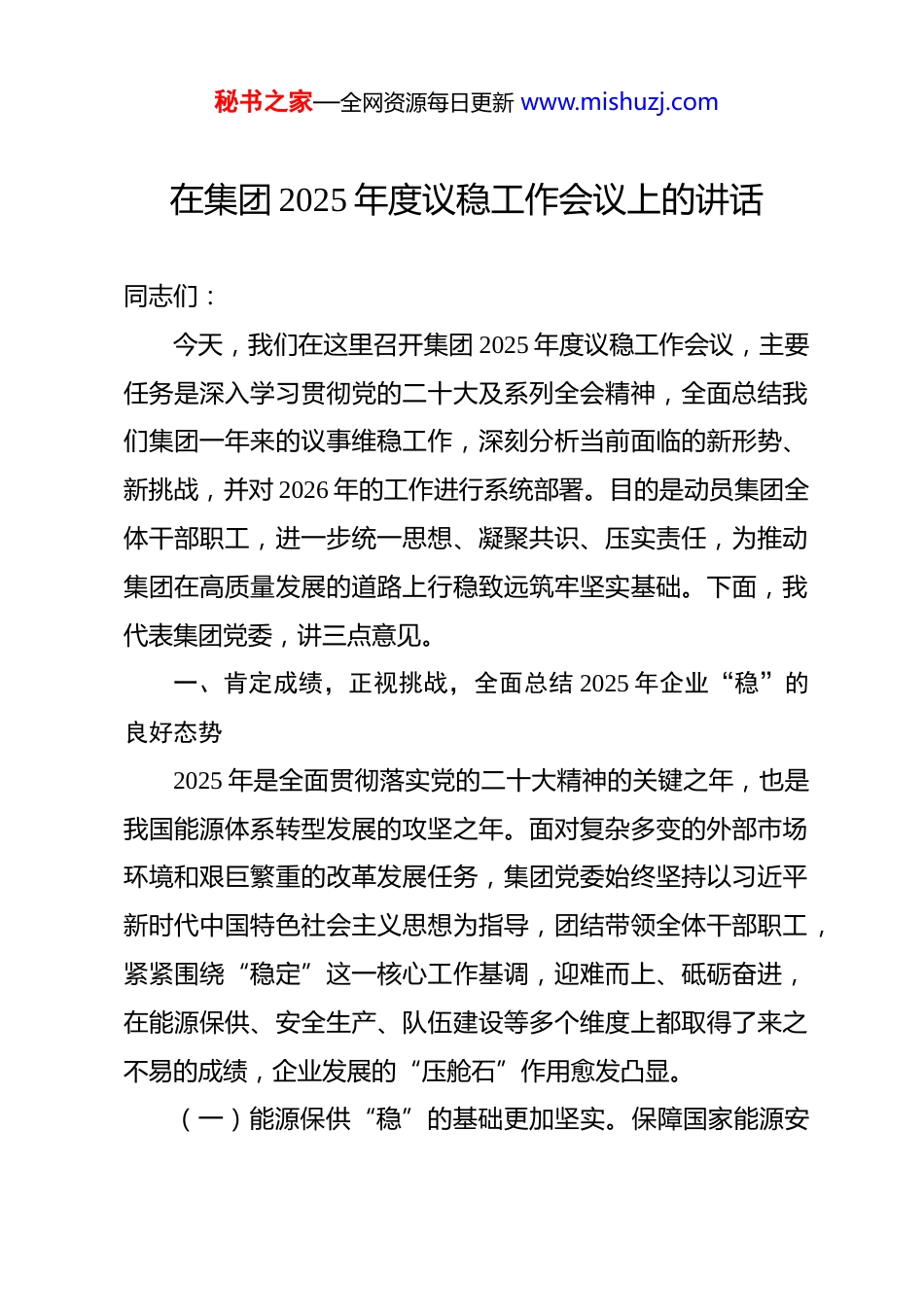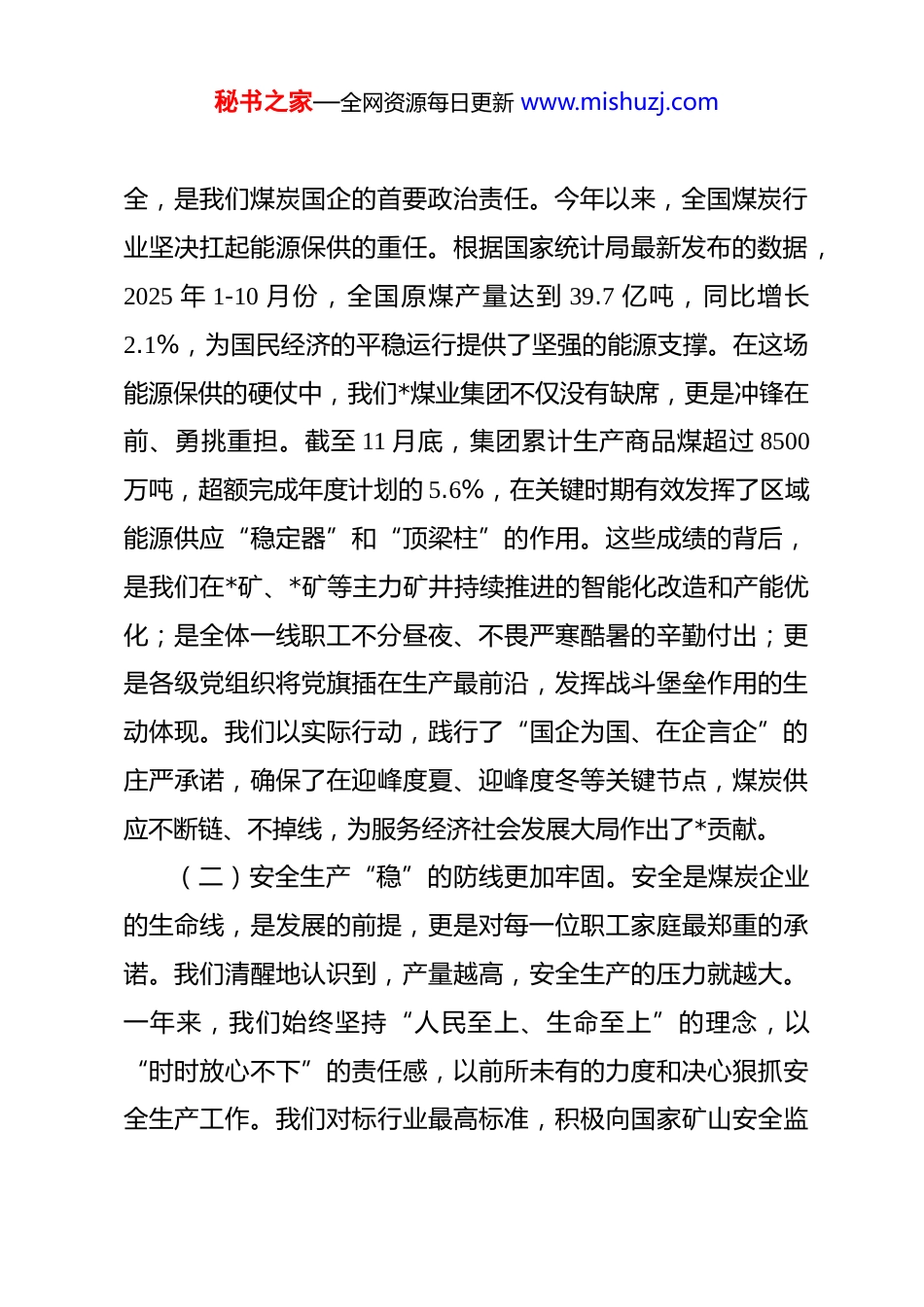 秘书之家—全网资源每日更新 www.mishuzj.com在集团 2025 年度议稳工作会议上的讲话 同志们:今天,我们在这里召开集团 2025 年度议稳工作会议,主要任务是深入学习贯彻党的二十大及系列全会精神,全面总结我们集团一年来的议事维稳工作,深刻分析当前面临的新形势、新挑战,并对 2026 年的工作进行系统部署。目的是动员集团全体干部职工,进一步统一思想、凝聚共识、压实责任,为推动集团在高质量发展的道路上行稳致远筑牢坚实基础。下面,我代表集团党委,讲三点意见。一、肯定成绩,正视挑战,全面总结 2025 年企业“稳”的良好态势2025 年是全面贯彻落实党的二十大精神的关键之年,也是我国能源体系转型发展的攻坚之年。面对复杂多变的外部市场环境和艰巨繁重的改革发展任务,集团党委始终坚持以习近平新时代中国特色社会主义思想为指导,团结带领全体干部职工,紧紧围绕“稳定”这一核心工作基调,迎难而上、砥砺奋进,在能源保供、安全生产、队伍建设等多个维度上都取得了来之不易的成绩,企业发展的“压舱石”作用愈发凸显。(一)能源保供“稳”的基础更加坚实。保障国家能源安秘书之家—全网资源每日更新 www.mishuzj.com全,是我们煤炭国企的首要政治责任。今年以来,全国煤炭行业坚决扛起能源保供的重任。根据国家统计局最新发布的数据,2025 年 1-10 月份,全国原煤产量达到 39.7 亿吨,同比增长2.1%,为国民经济的平稳运行提供了坚强的能源支撑。在这场能源保供的硬仗中,我们*煤业集团不仅没有缺席,更是冲锋在前、勇挑重担。截至 11 月底,集团累计生产商品煤超过 8500万吨,超额完成年度计划的 5.6%,在关键时期有效发挥了区域能源供应“稳定器”和“顶梁柱”的作用。这些成绩的背后,是我们在*矿、*矿等主力矿井持续推进的智能化改造和产能优化;是全体一线职工不分昼夜、不畏严寒酷暑的辛勤付出;更是各级党组织将党旗插在生产最前沿,发挥战斗堡垒作用的生动体现。我们以实际行动,践行了“国企为国、在企言企”的庄严承诺,确保了在迎峰度夏、迎峰度冬等关键节点,煤炭供应不断链、不掉线,为服务经济社会发展大局作出了*贡献。(二)安全生产“稳”的防线更加牢固。安全是煤炭企业的生命线,是发展的前提,更是对每一位职工家庭最郑重的承诺。我们清醒地认识到,产量越高,安全生产的压力就越大。一年来,我们始终坚持“人民至上、生命至上”的理念,以“时时放心不下”的责任感,以前所未有的力度和决心狠抓安全生产工作。我们对标行业最高标准,积极向国家矿山安全监秘书之家—全网资源每日更新 www.mishuzj.com察局公布的全国 49 家最高安全标准矿山看齐,特别是其中位于我们*省的 22 家标杆矿井,将它们的先进经验作为我们改进工作的镜鉴。一是安全投入持续加大。2025 年,集团安全生产投入总额较去年增长 12%,专项用于重大灾害治理、智能化工作面建设、安全监测系统升级和单兵防护装备更新换代,把钱花在刀刃上,从根本上提升矿井的本质安全水平。二是责任体系全面压实。我们严格落实“党政同责、‘一岗双责’、齐抓共管、失职追责”的安全生产责任制,从集团领导到区队班组,层层签订责任状,将安全指标与绩效考核、评优评先、职务晋升硬挂钩,形成了“人人头上有指标、千斤重担大家挑”的责任闭环。三是隐患排查动真碰硬。我们坚持“零容忍”态度,常态化开展“四不两直”式突击检查和“地毯式”安全大排查,对排查出的各类隐患建立台账、限期整改、挂牌督办、对账销号。全年共组织各类安全检查超过 300 次,排查并整改安全隐患 5000 余项,坚决把事故苗头消灭在萌芽状态。通过这些扎实有效的工作,集团全年的百万吨死亡率控制在历史最低水平,为企业的平稳运行守住了不可逾越的红线。(三)队伍建设“稳”的根基更加深厚。企业的稳定,归根结底是人的稳定,是职工队伍的稳定。集团党委始终坚持以人为本,将稳定职工队伍、凝聚人心力量作为一切工作的出发秘书之家—全网资源每日更新 www.mishuzj.com点和落脚点。一是在思想上“引”。我们扎实开展学习贯彻习近平新时代中国特色社会主义思想主题教育,通过党委理论...